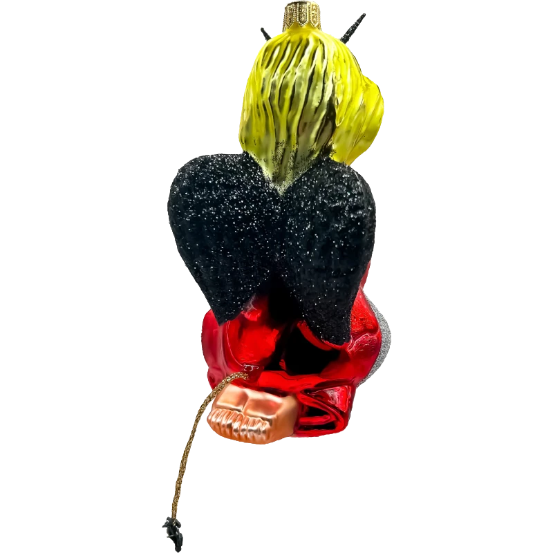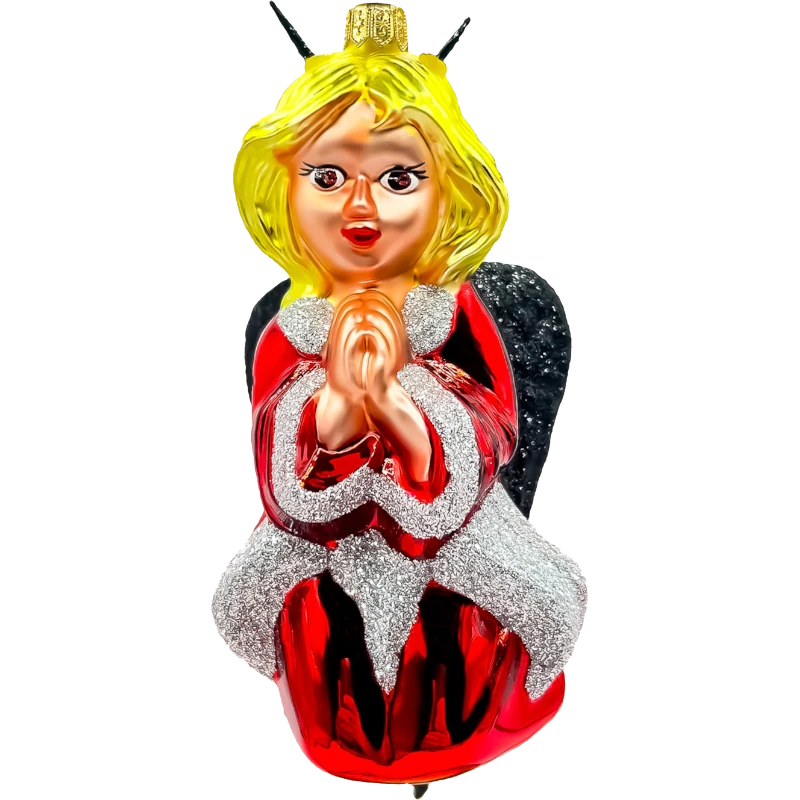 Bombka utrzymana jest w intensywnej czerwieni z wyrazistymi akcentami srebra i czerni, co nadaje jej elegancji i głębi. Anioł, ubrany w czerwoną szatę z brokatowymi srebrnymi wykończeniami, trzyma ręce w geście modlitwy, co dodaje całości spokojnego, aczkolwiek nieco przewrotnego charakteru. Rogi umieszczone na głowie anioła sprawiają, że ozdoba nabiera unikalnego charakteru, idealnie wpisując się w styl retro z odrobiną humoru i artystycznego podejścia.