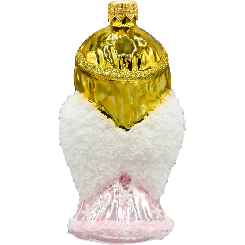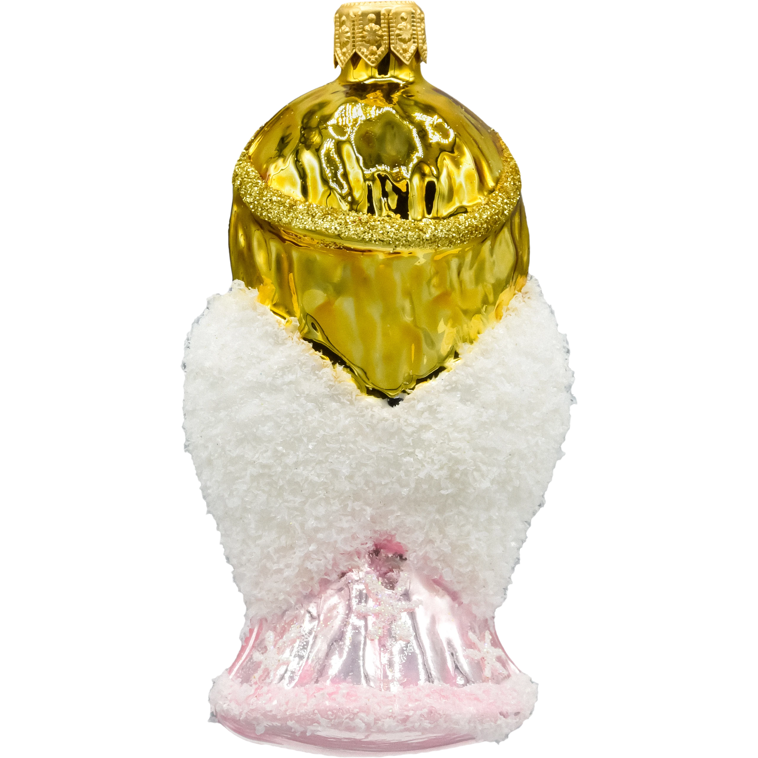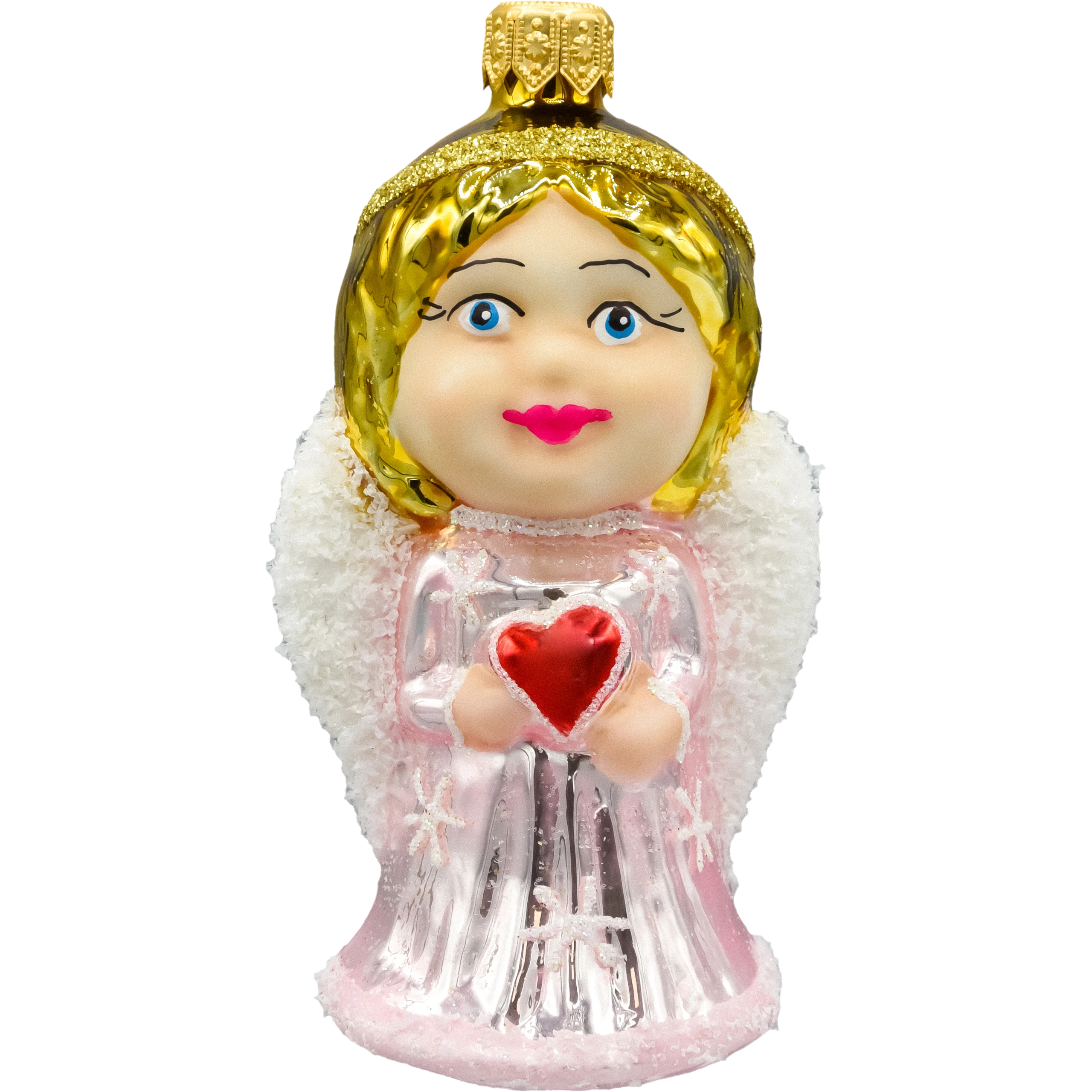 Design: Bombka przedstawia uśmiechniętego anioła z niebieskimi oczami, ubranego w połyskującą, różową szatę, ozdobioną srebrzystymi akcentami. Czerwone serce, które anioł trzyma w dłoniach, symbolizuje miłość i ciepło, jakie niosą ze sobą święta. Skrzydła anioła pokryte są białym brokatem, co nadaje im lekkości i pięknie odbija światło choinkowych lampek.