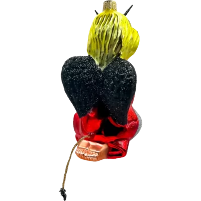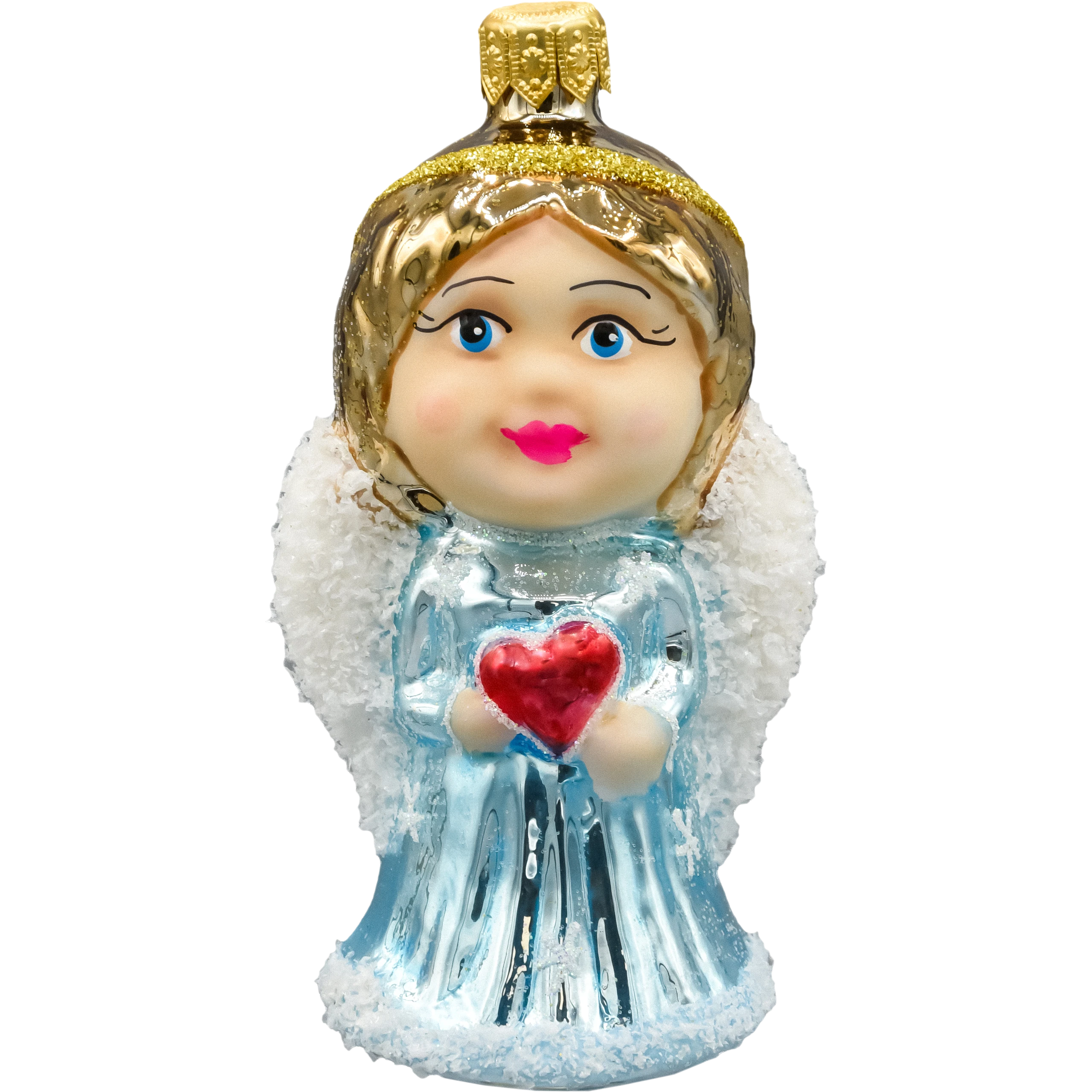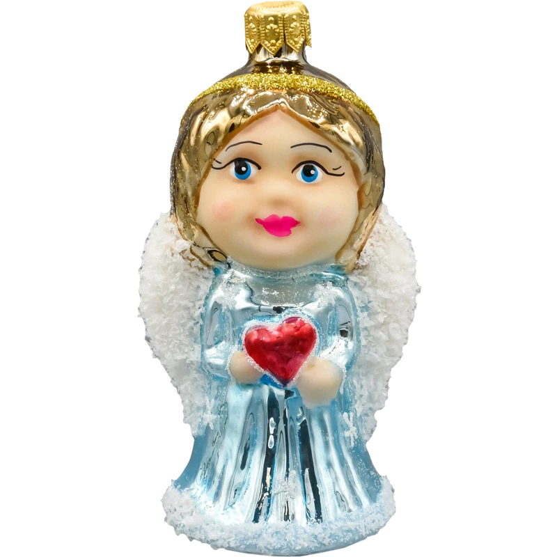 Design: Bombka przedstawia anioła o łagodnym wyrazie twarzy, ubranego w jasnoniebieską szatę, ozdobioną połyskującymi akcentami. Anioł trzyma w dłoniach czerwone serce, symbolizujące miłość i ciepło, które idealnie wpisuje się w świąteczny klimat. Jego skrzydła pokryte są błyszczącymi, brokatowymi detalami, dodającymi elegancji i blasku.