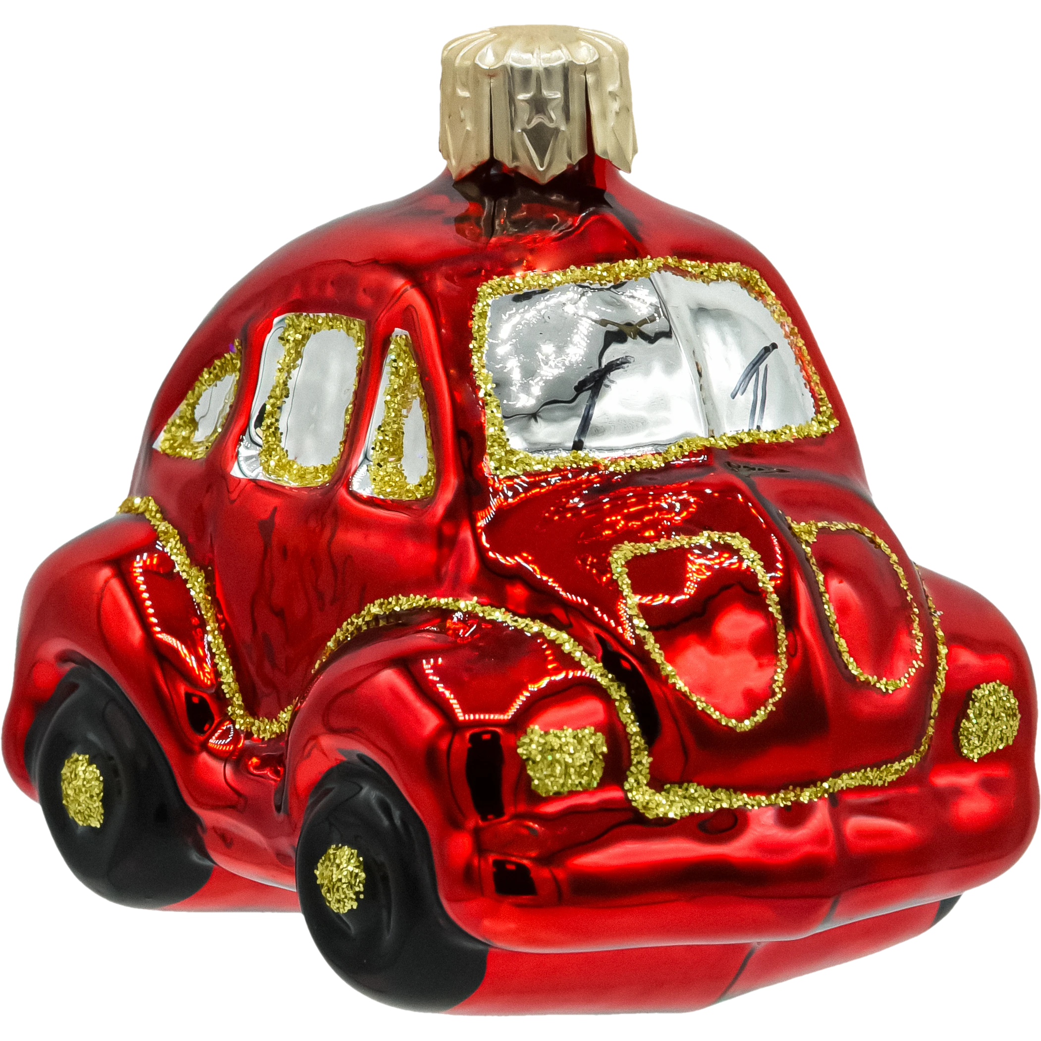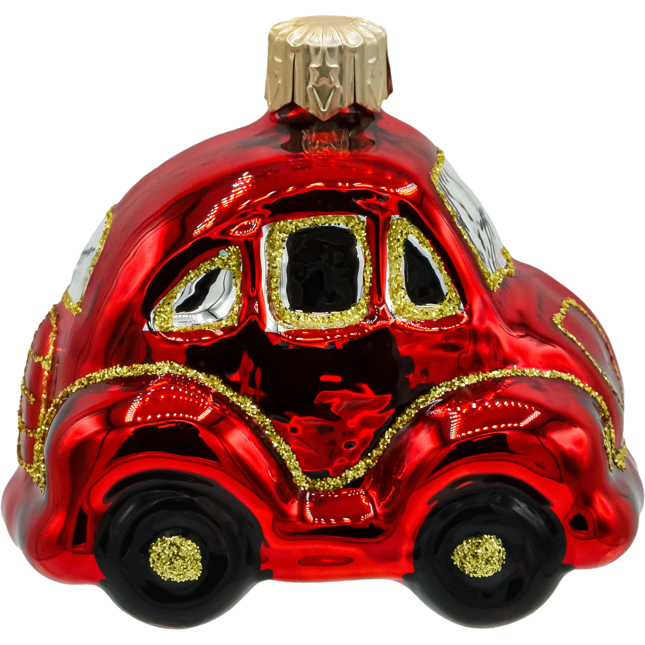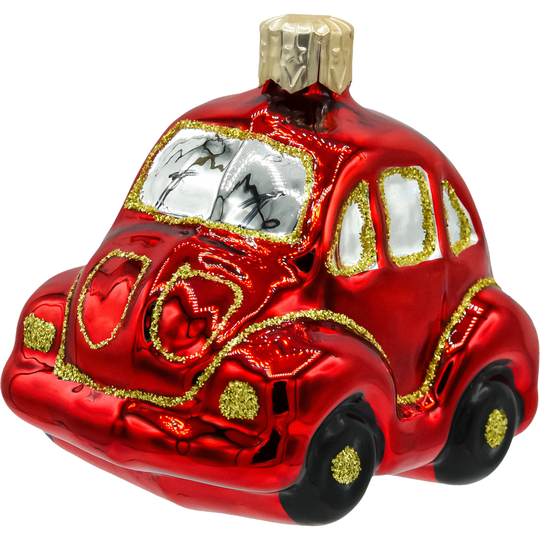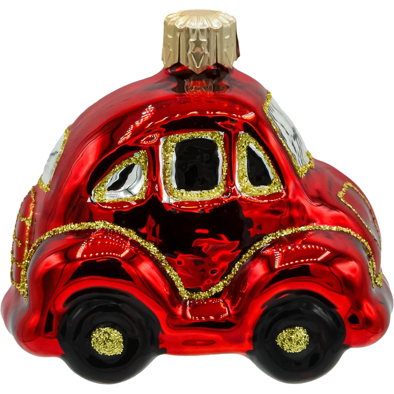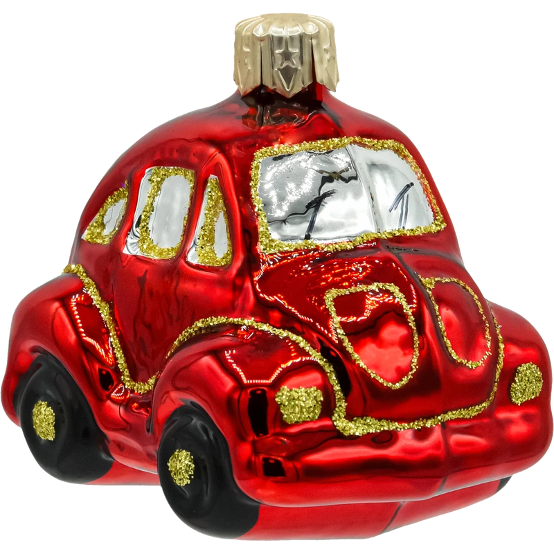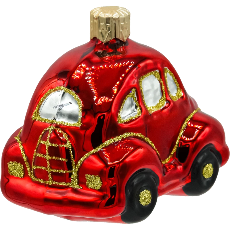 Szklana bombka choinkowa w kształcie czerwonego garbusa to zachwycająca dekoracja, która przenosi w czasie i dodaje świątecznemu drzewku niepowtarzalnego charakteru. Ta ręcznie malowana ozdoba przedstawia klasyczny samochód retro – kultowego garbusa w intensywnym, czerwonym kolorze z bogatymi złotymi zdobieniami.