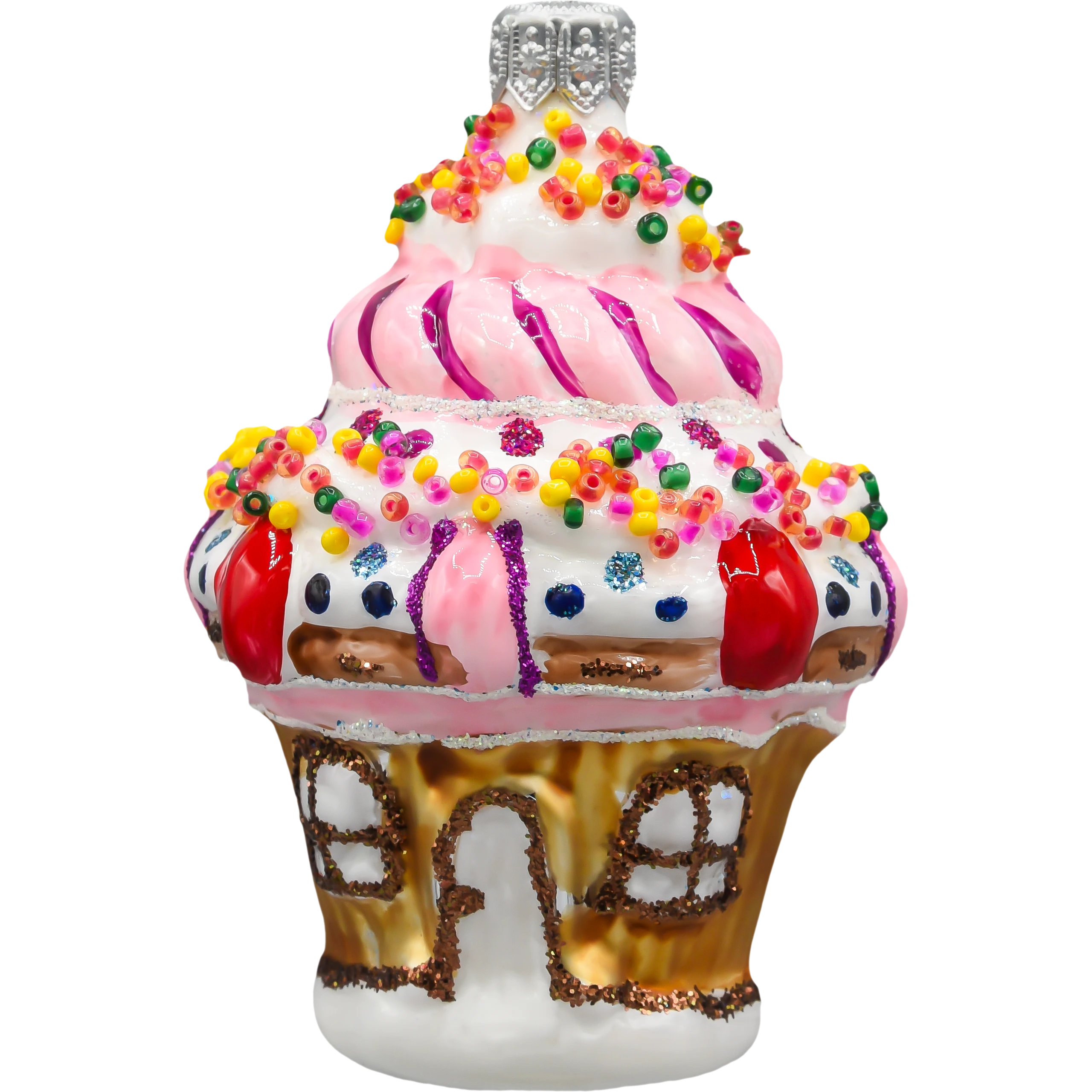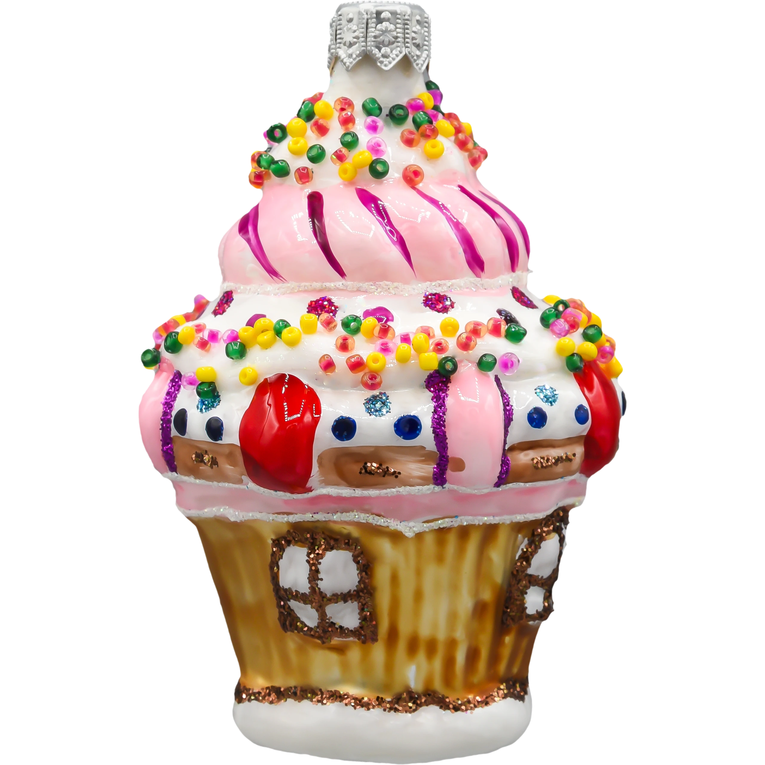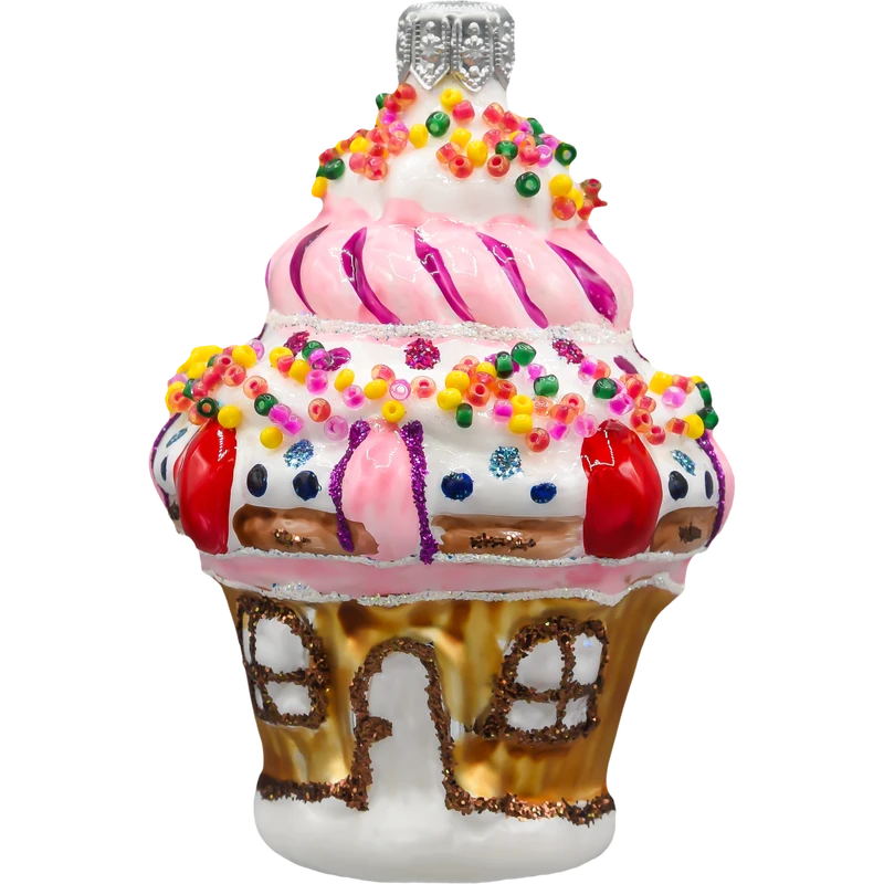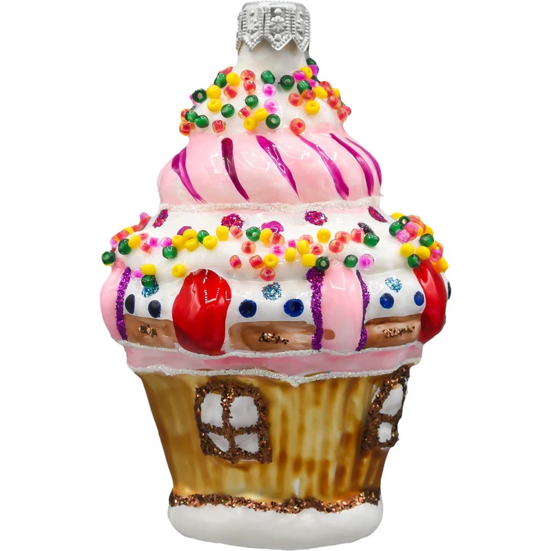 Szklana bombka choinkowa „Babeczkowy Domek” to urzekająca dekoracja, która wygląda jak wyjęta wprost z magicznej krainy słodyczy. Ta ręcznie malowana bombka przedstawia fantazyjny domek w kształcie muffinki, ozdobiony pastelowym lukrem, kolorową posypką i bajkowymi detalami przypominającymi polewę i słodkie dekoracje. Górna część ozdoby imituje różowy krem z fioletowym akcentem, który spiralnie oplata „babeczkowy” dach, zakończony srebrnym zawieszeniem.