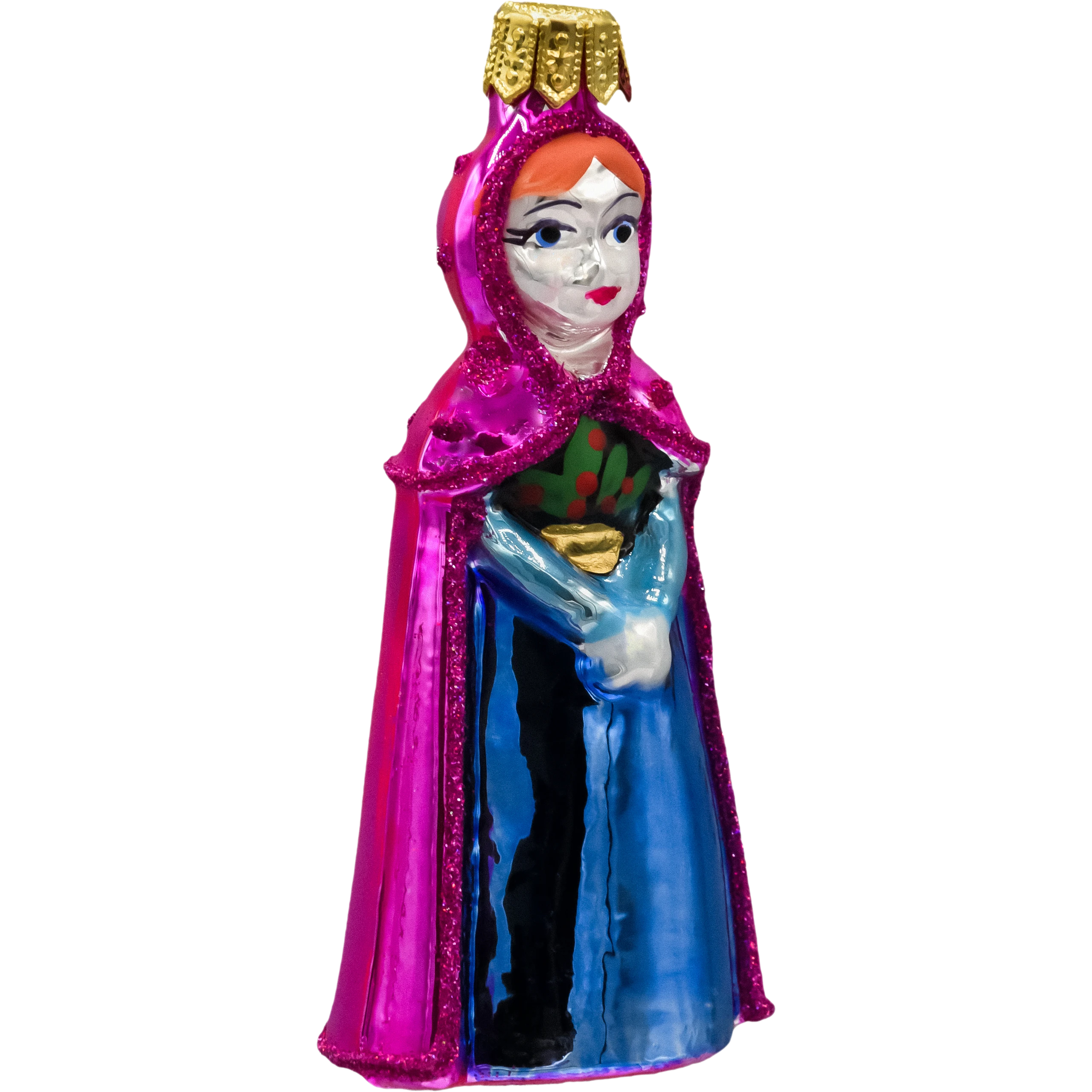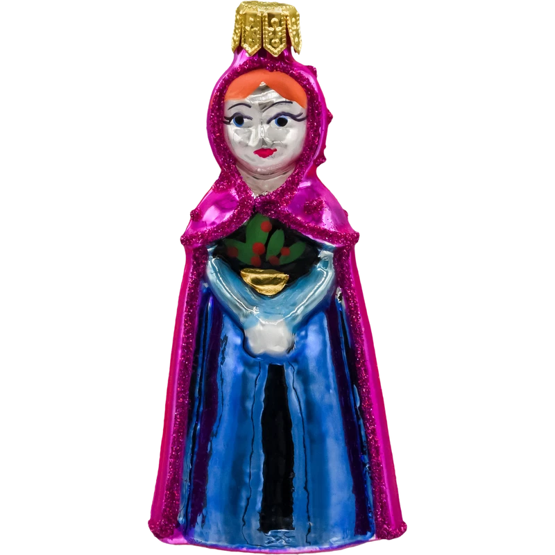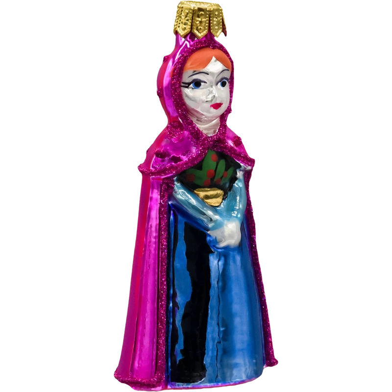 Szklana bombka z postacią w różowym płaszczu i niebieskiej sukni to idealny wybór dla tych, którzy pragną dodać swojej choince odrobinę bajkowego uroku i elegancji, tworząc niezapomnianą, magiczną atmosferę świąt.