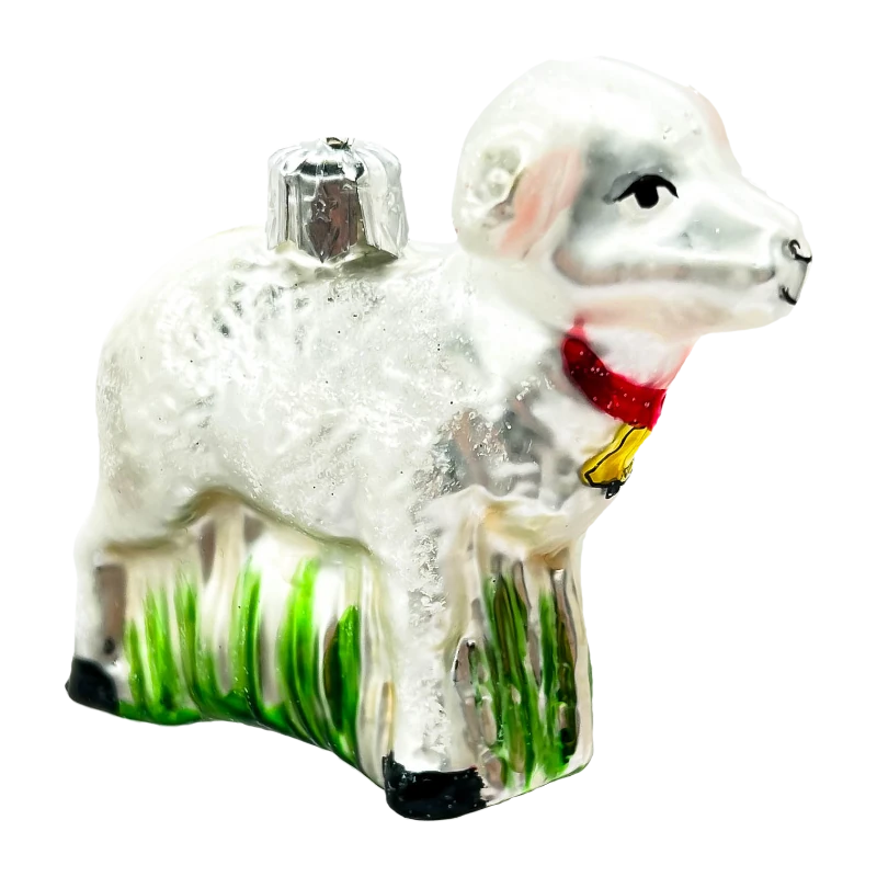 Bombka wielkanocna przedstawiająca baranka wielkanocnego, stojącego w wysokiej trawie. Na szyi naszego bohatera znajduje się złoty dzwoneczek wiszący na czerwonej wstążce.