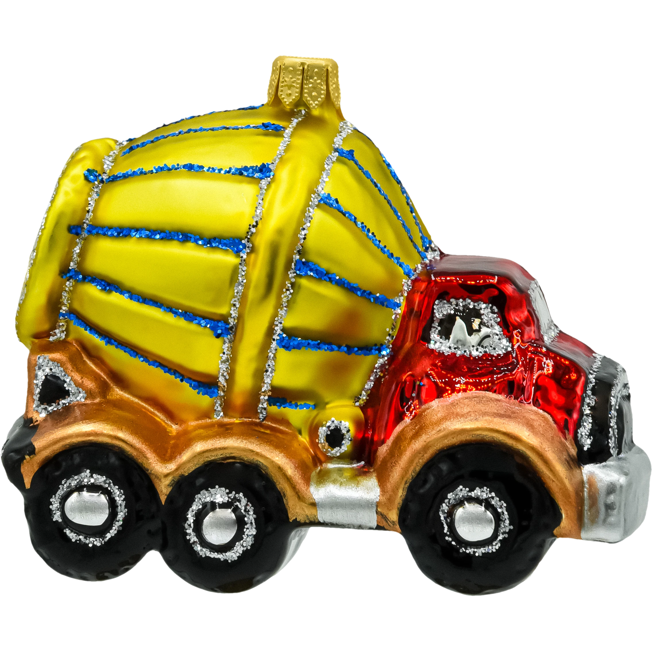 Kolorystyka: Żółty bęben z niebieskimi akcentami, czerwona kabina, złote i srebrne detale – intensywne barwy, które przyciągają wzrok i nadają ozdobie wyrazistości.