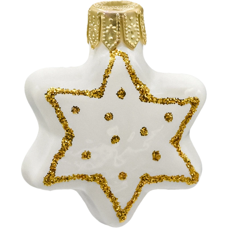 Elegancka szklana bombka w kształcie białej gwiazdki ze złotym brokatem. Ręcznie zdobiona ozdoba choinkowa – idealna do klasycznych i glamour dekoracji świątecznych.