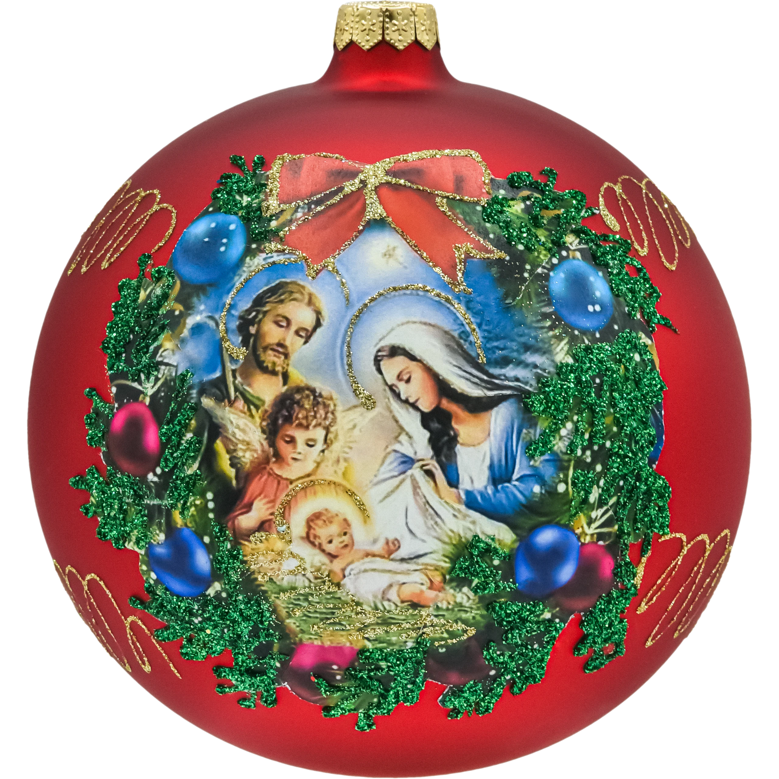 Duża, ręcznie dmuchana bombka szklana 15 cm w czerwieni z motywem Świętej Rodziny. Ręczne zdobienie, złote ornamenty i brokatowy wieniec tworzą efektowny, tradycyjny akcent Bożego Narodzenia. Idealna na choinkę, do stroików i na prezent.