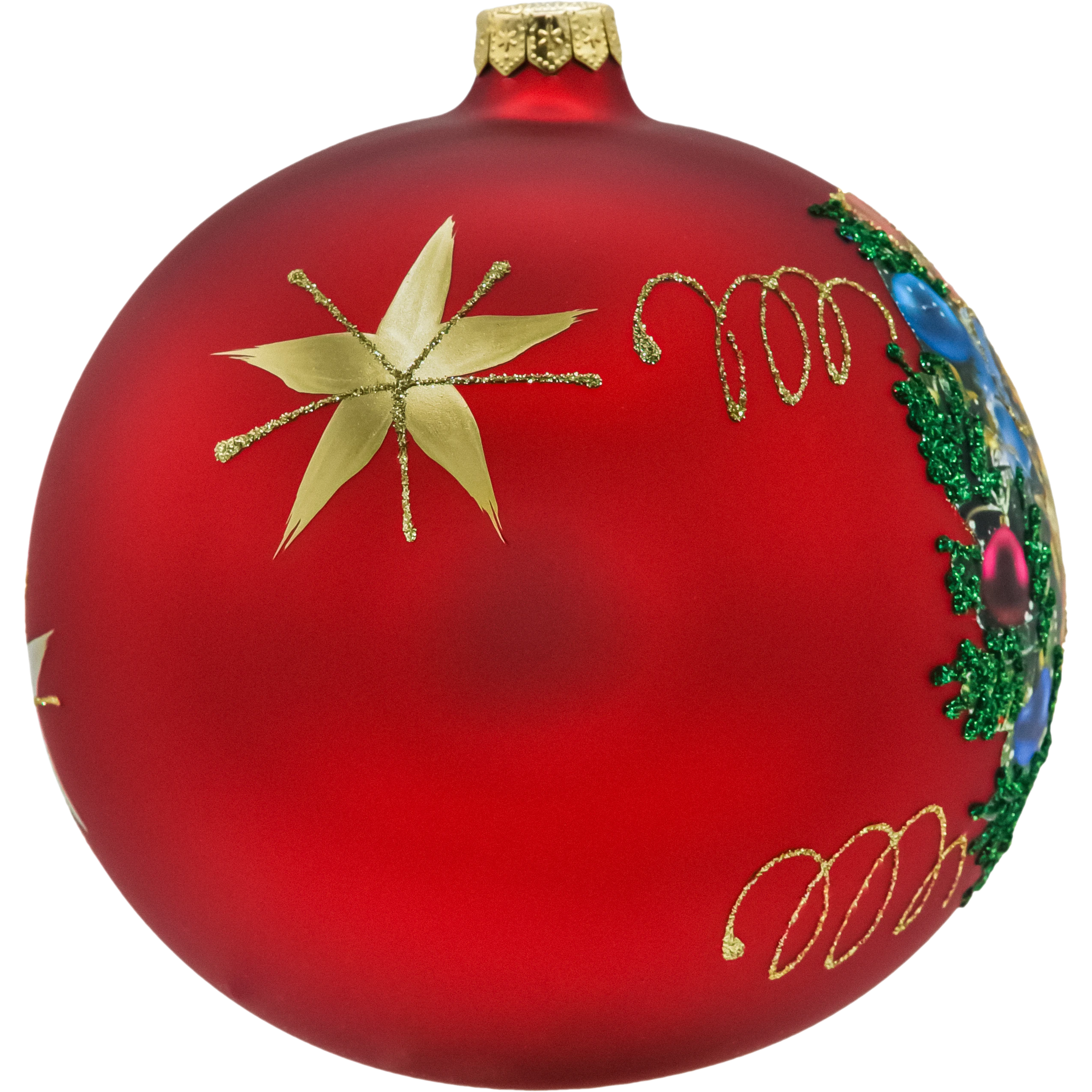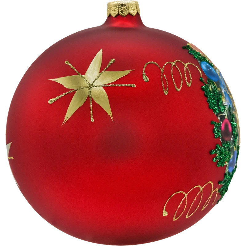Wykończenie: matowa czerwień, złote ornamenty, zielony wieniec, mieniący się brokat; aplikacja artystyczna z trwałym nadrukiem i ręcznym domalowaniem detali.