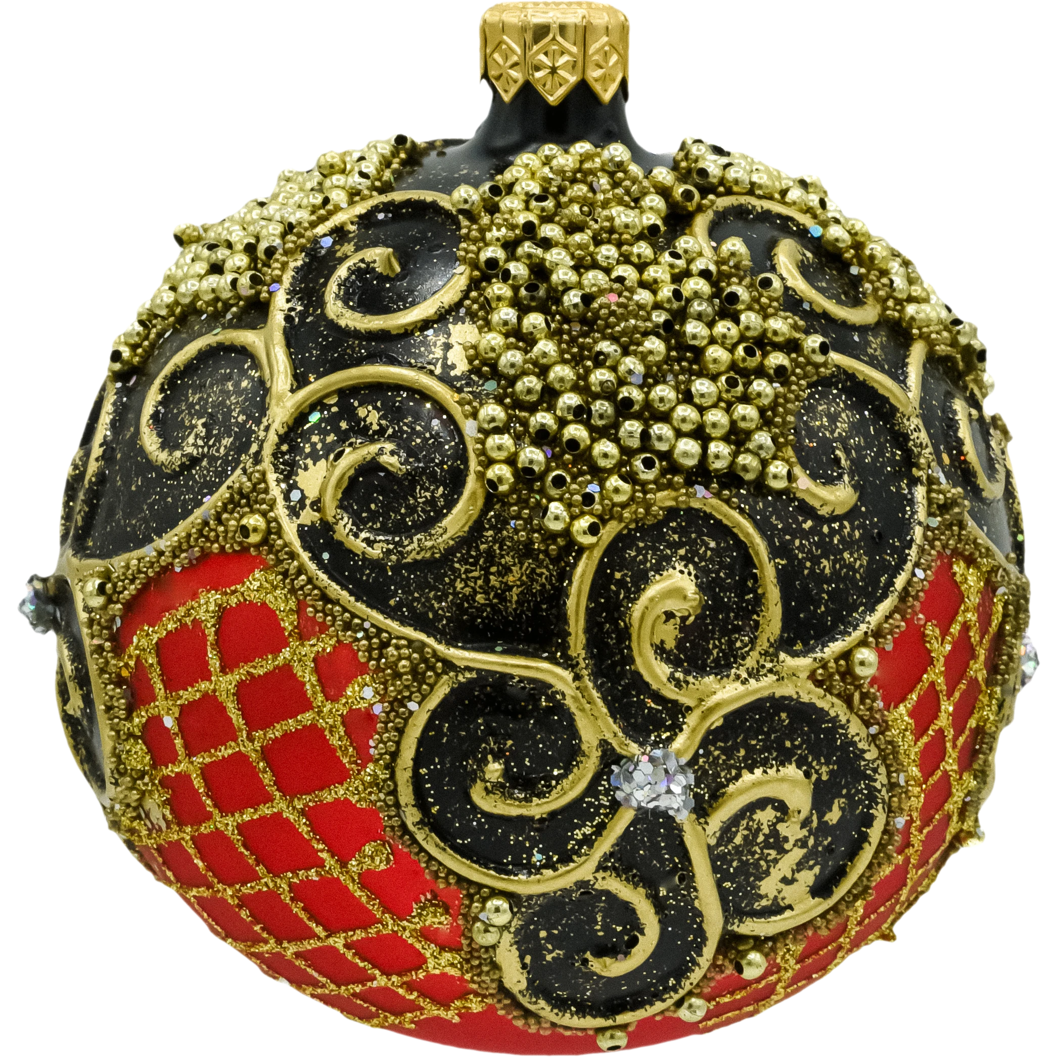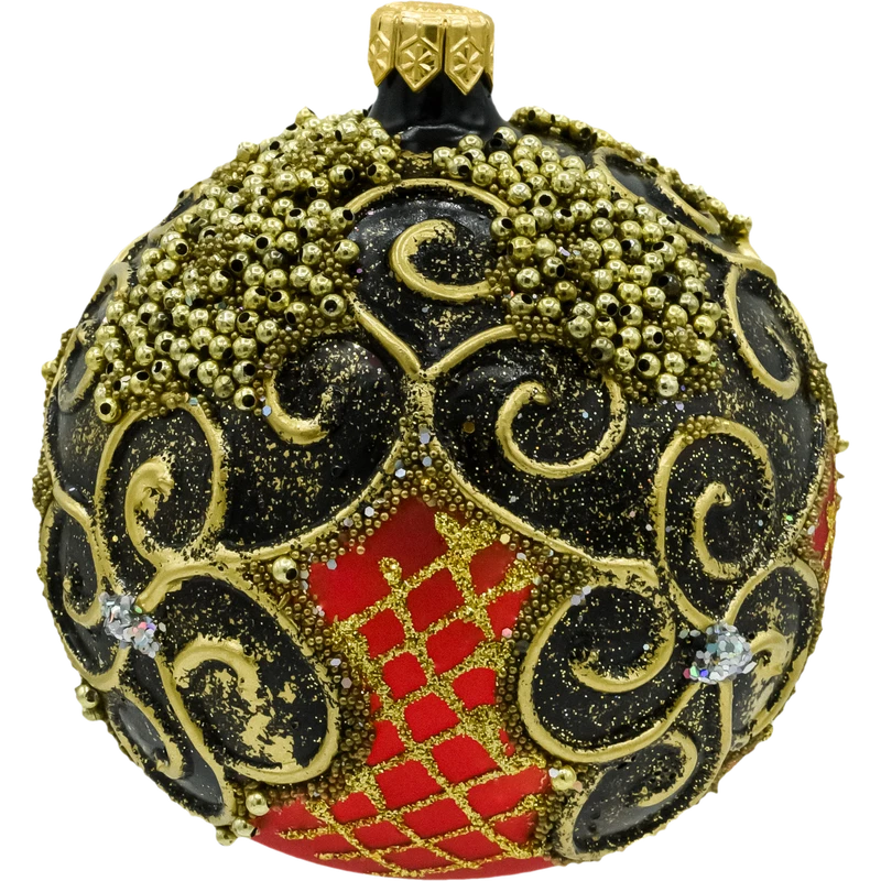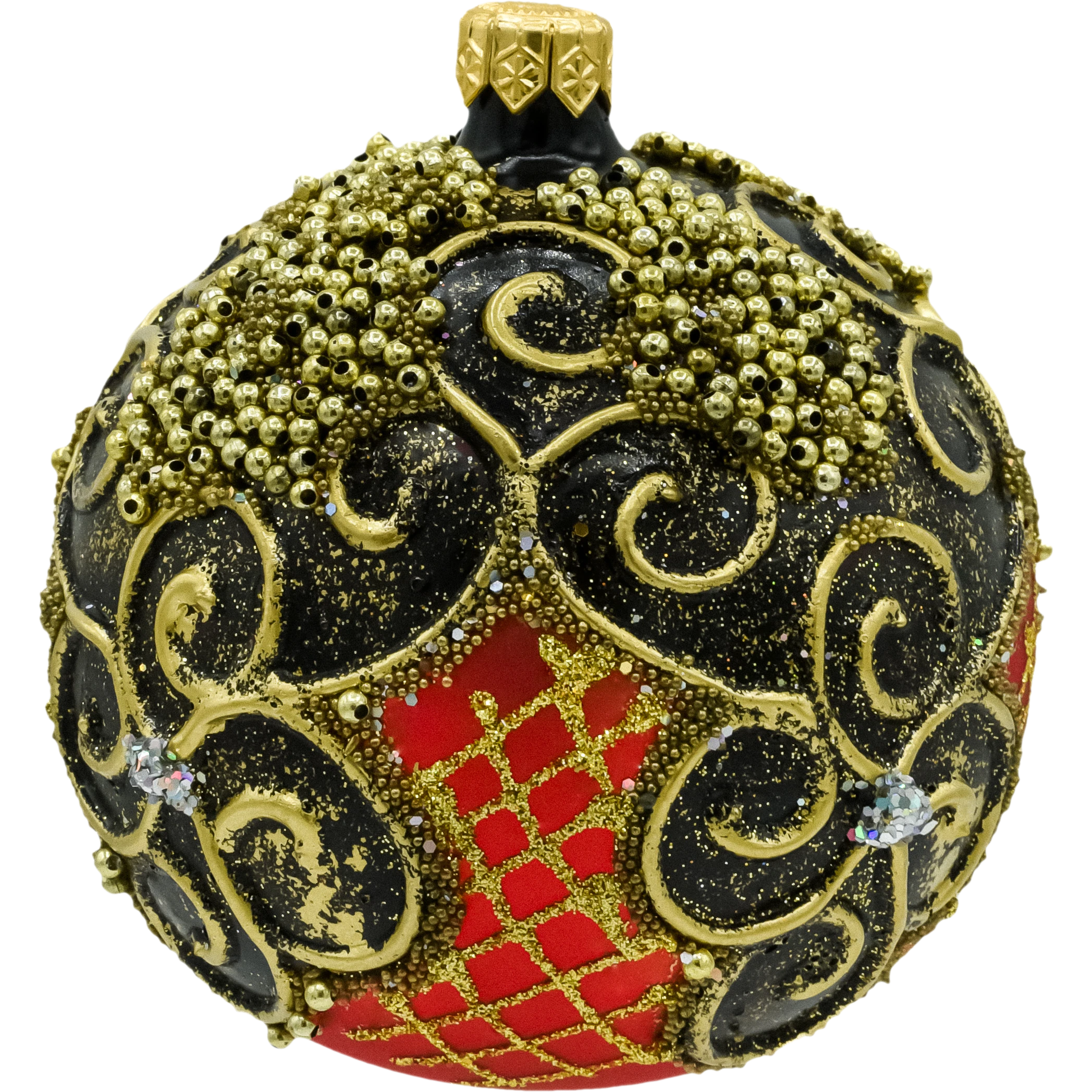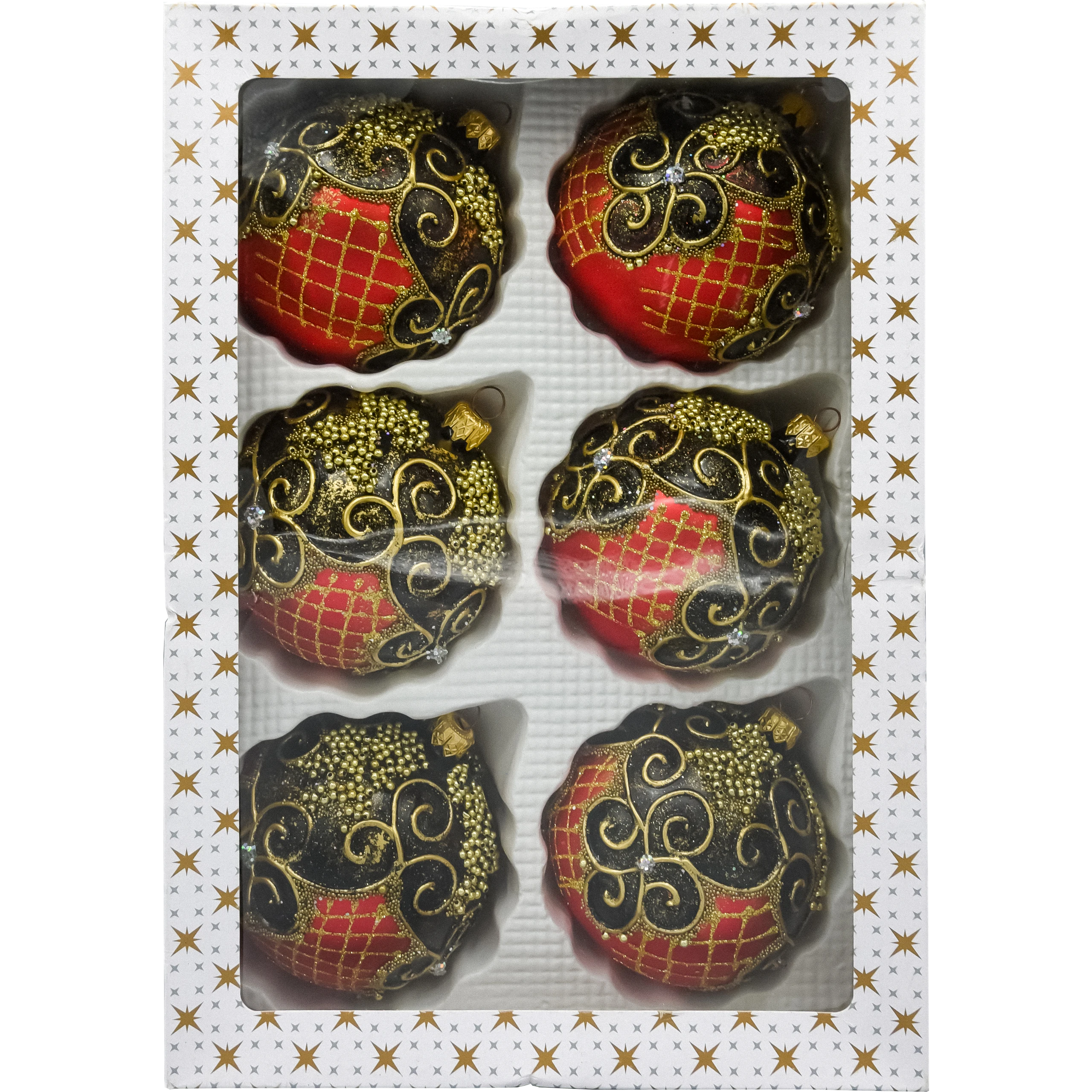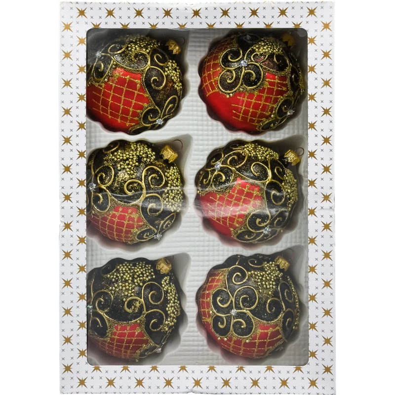 Zestaw sześciu czarno-czerwonych bombek ze złotymi zdobieniami to elegancki i wyrafinowany dodatek do każdej choinki. Luksusowe, ręczne zdobienia oraz wysoka jakość wykonania sprawiają, że każda bombka to prawdziwe dzieło sztuki. Zapakowane w stylowe pudełko, bombki te stanowią idealny pomysł na prezent lub elegancką dekorację świąteczną, która wprowadzi do Twojego domu magię świąt i wyjątkowy klimat.