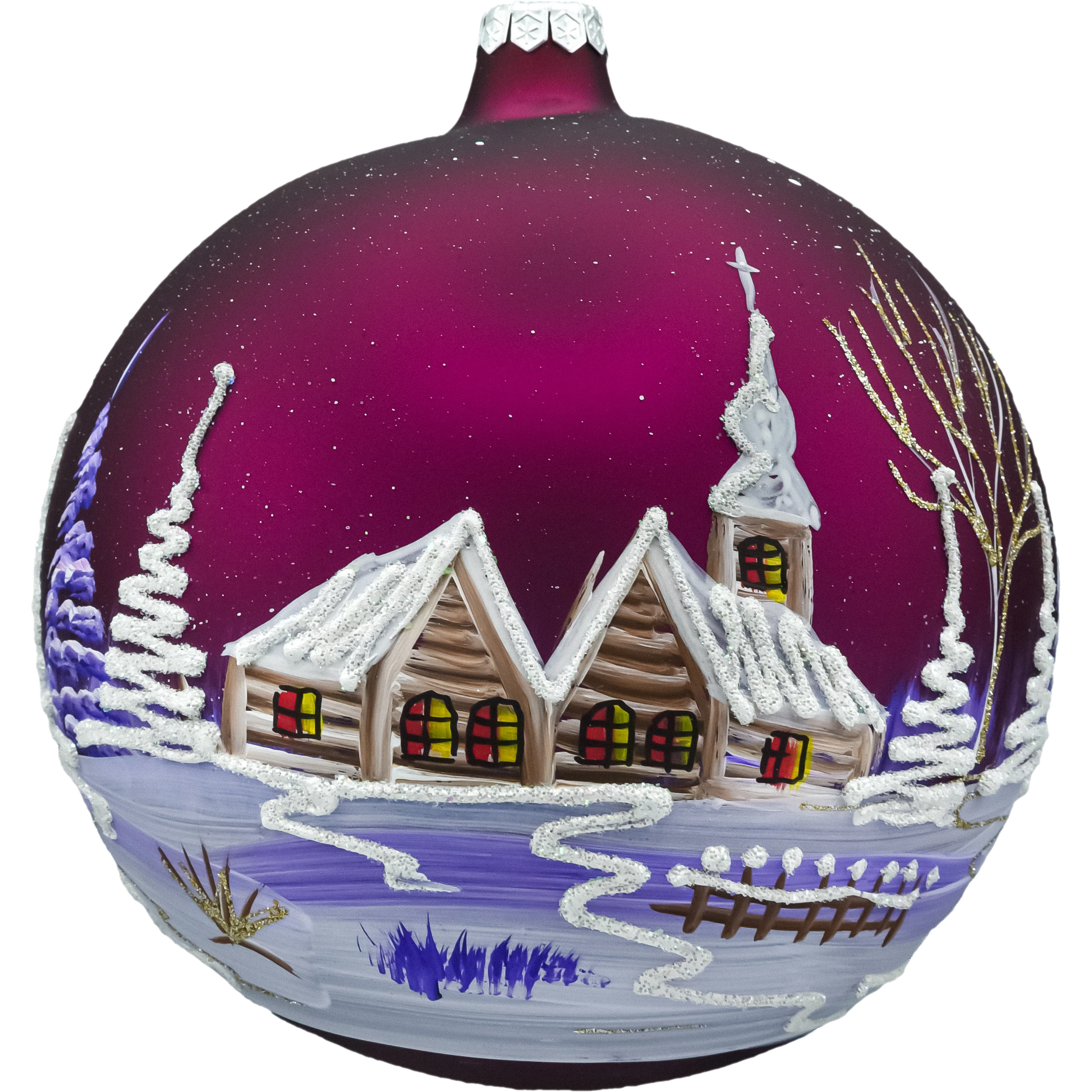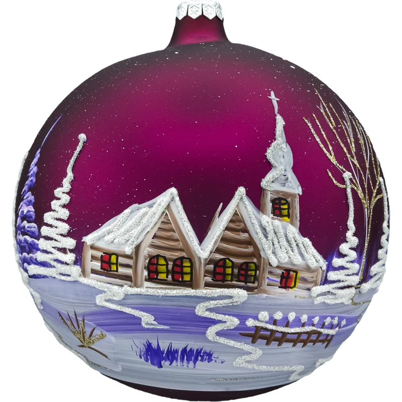 Ręcznie malowana szklana bombka choinkowa – kula w kolorze bordo/fiolet z motywem zimowej wioski i kościółka, zdobiona srebrnym brokatem, z metalową skuwką i pudełkiem prezentowym. Elegancka, efektowna ozdoba świąteczna do choinki, wieńca i stroików.