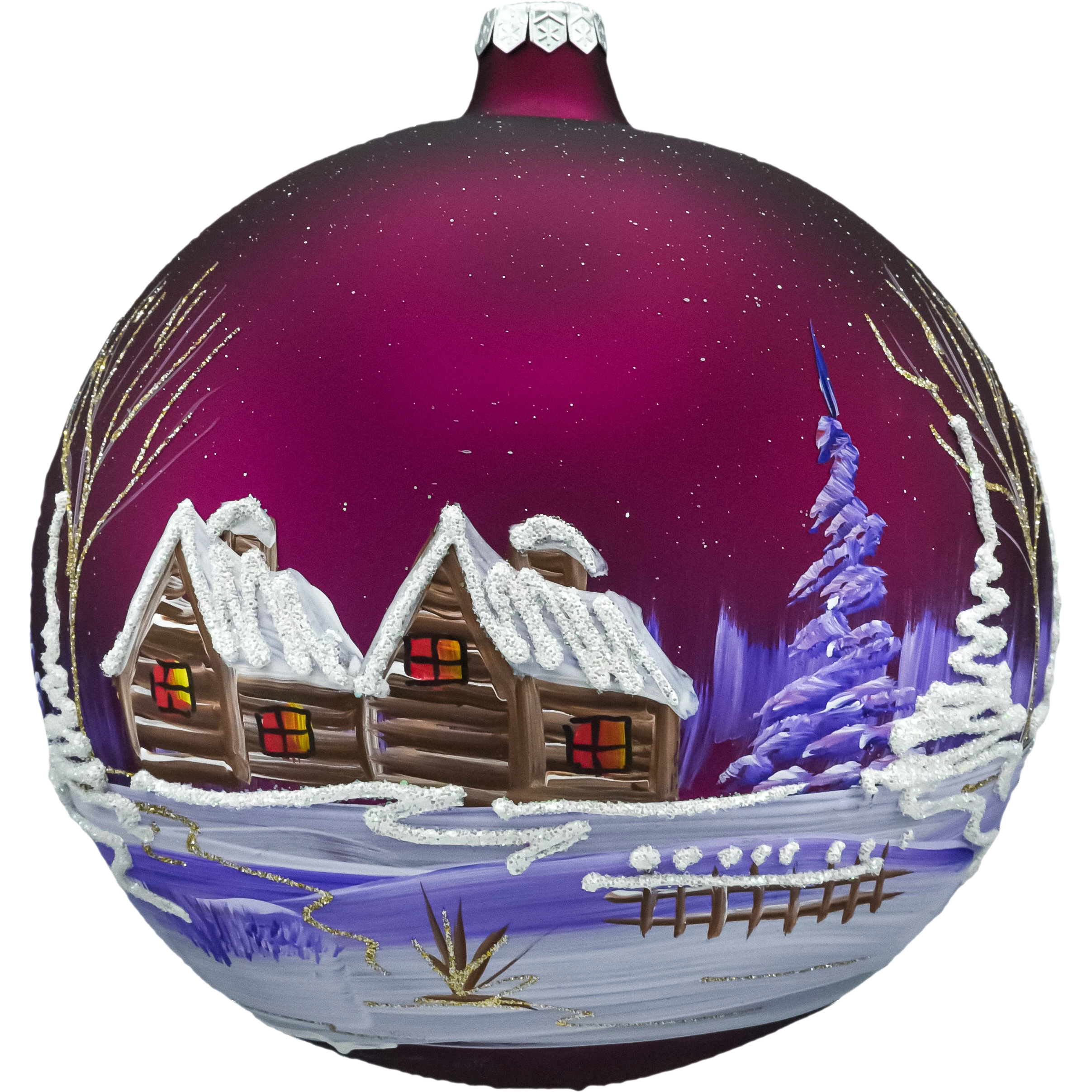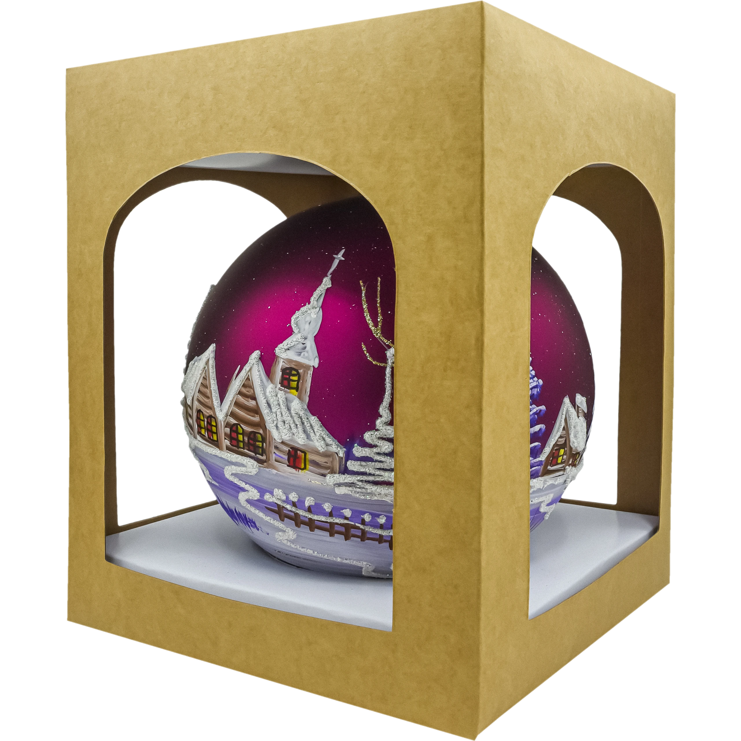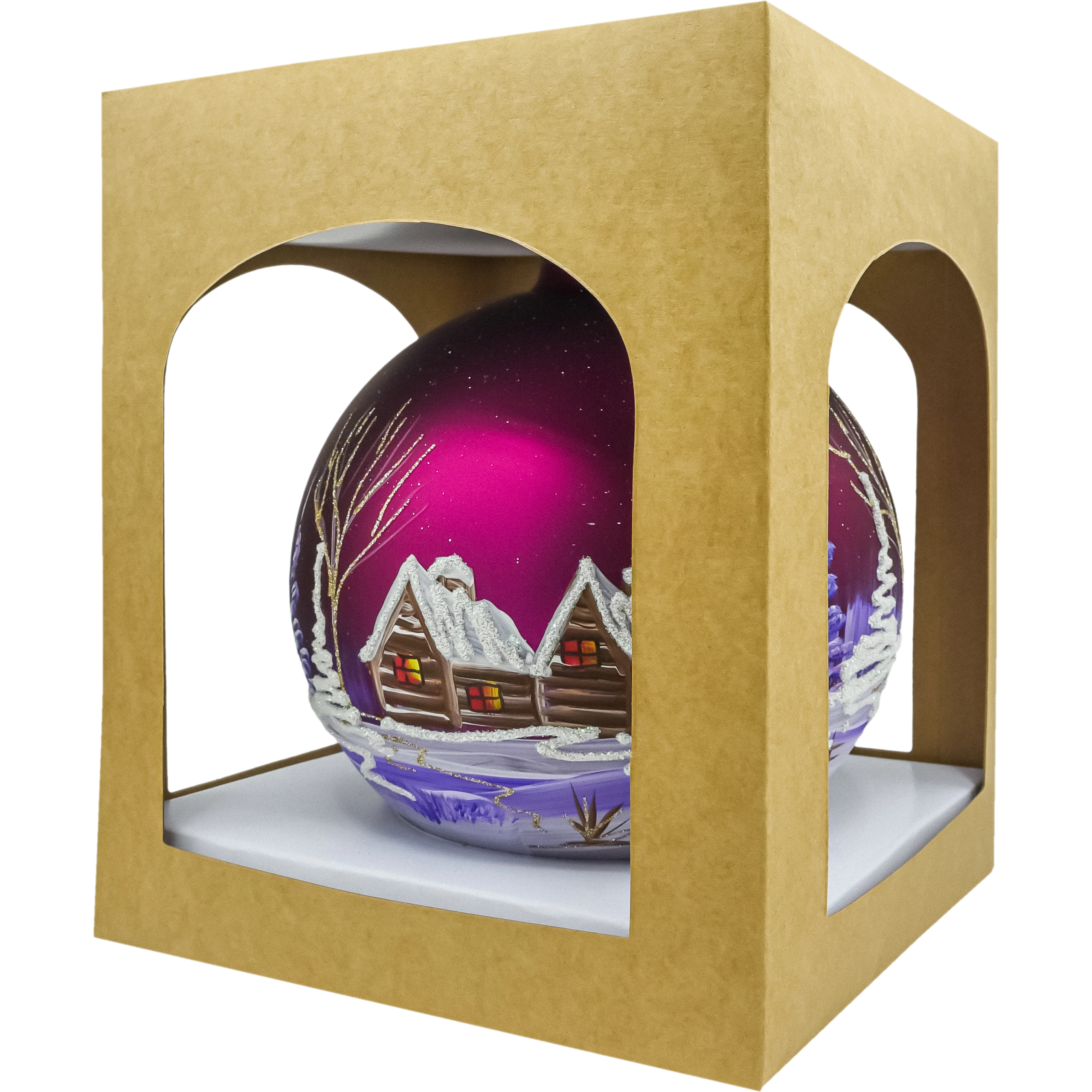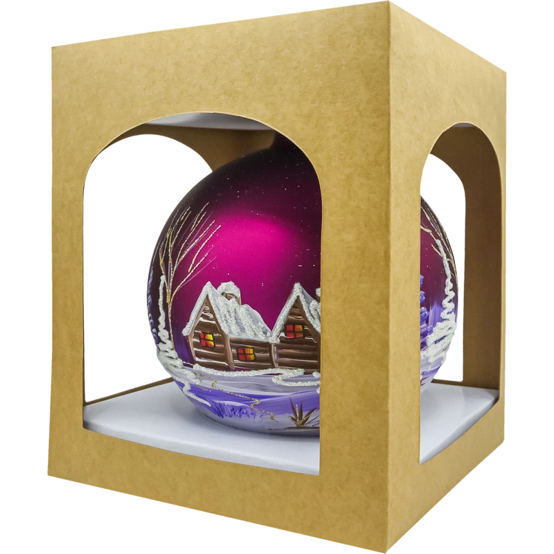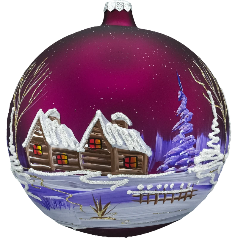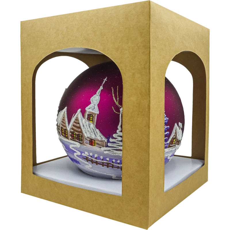 Szklana bombka choinkowa – kula z zimową wioską i kościółkiem to efektowna, ręcznie malowana ozdoba świąteczna w głębokim odcieniu bordo/śliwki. Na matowym tle artysta odtworzył urokliwy krajobraz zimowy: drewniane chaty i kościółek z ośnieżonymi dachami, migoczące brokatowe zaspy, smukłe choinki i drobne ścieżki prowadzące przez wioskę. Łagodne przejścia fioletów i bieli, zestawione ze srebrnym brokatem, dają elegancki, lekko vintage charakter i pięknie odbijają światło lampek na choince.