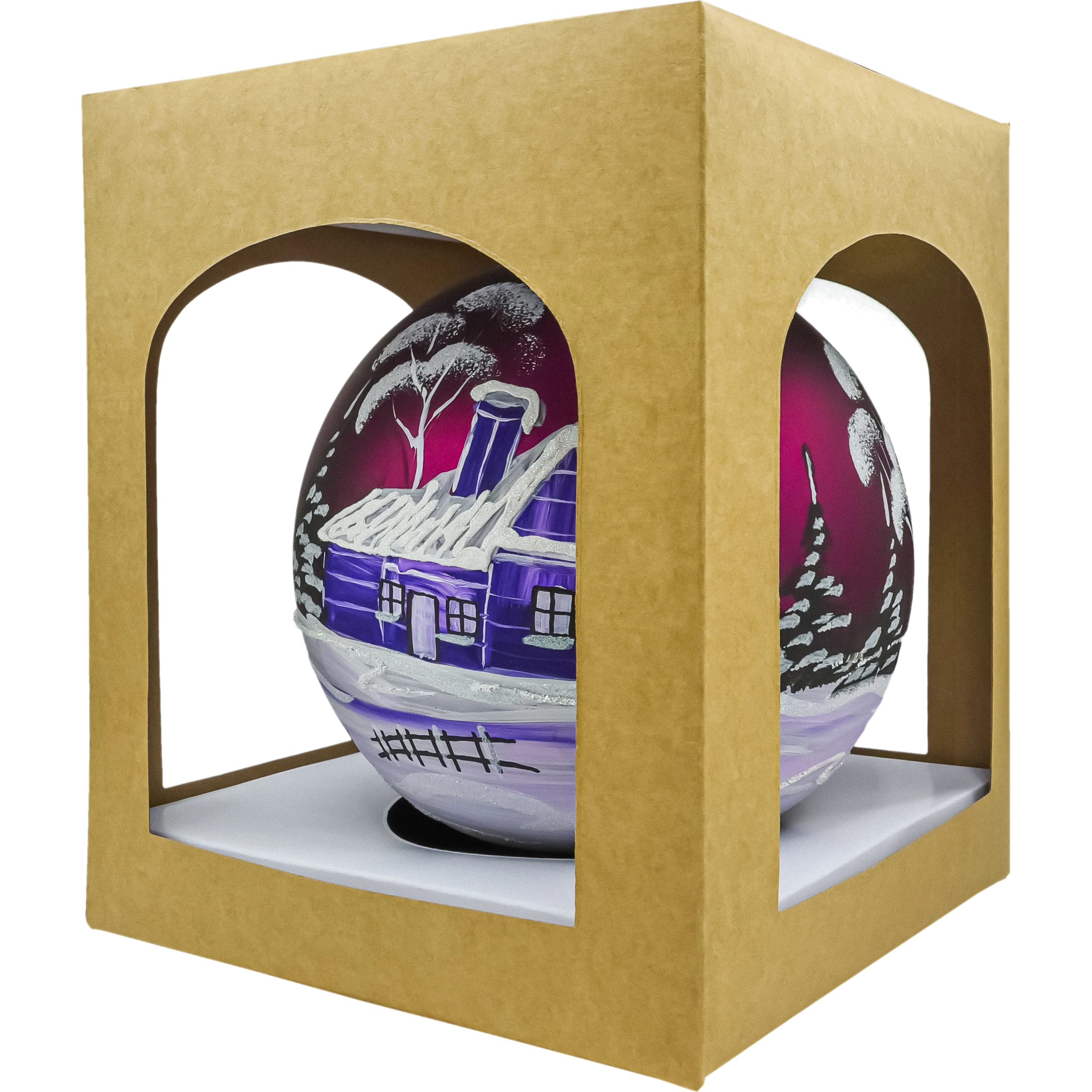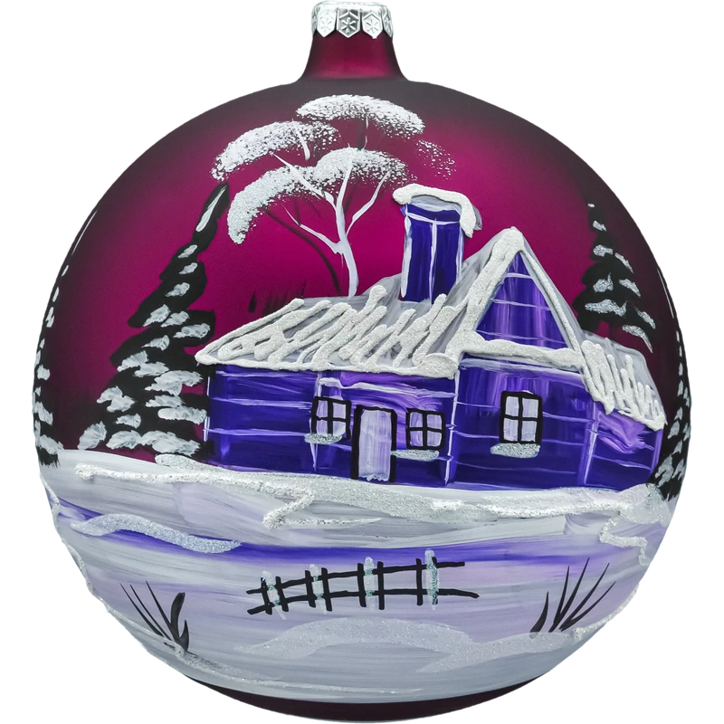 Ręcznie malowana szklana bombka kula w kolorze bordo/fioletu z motywem zimowej chatki i brokatowym śniegiem. Klasyczna ozdoba choinkowa w pudełku prezentowym.