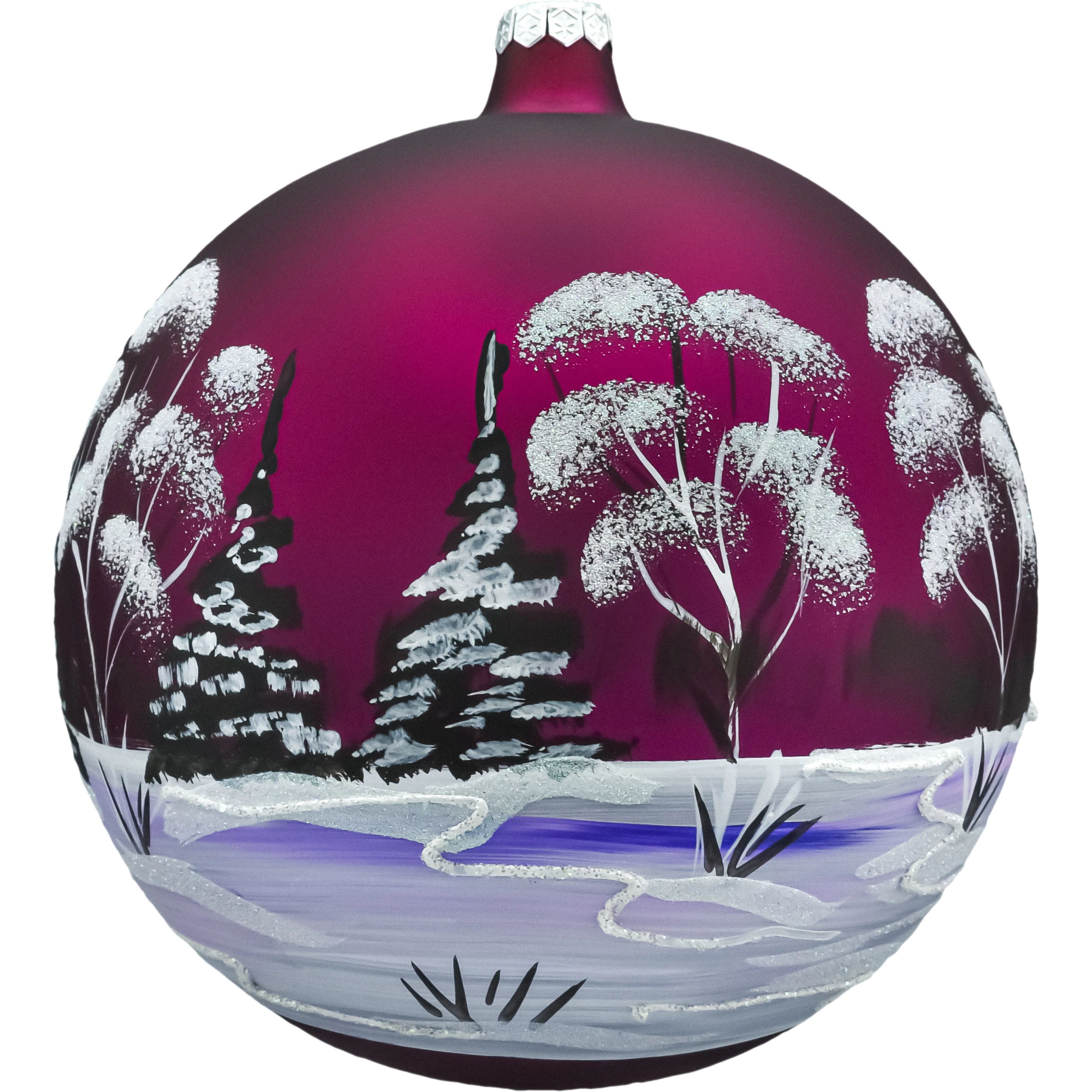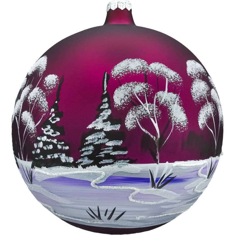 Elegancka, ręcznie malowana szklana bombka w kształcie kuli, utrzymana w głębokim odcieniu bordo/fioletu. Na matowo-satynowym tle artistka namalowała zimowy pejzaż: śnieżną chatkę, ośnieżone drzewa i lśniące drogi ze srebrnego brokatu. Subtelne przejścia kolorów i wypukłe akcenty nadają dekoracji przestrzenność i blask, dzięki czemu bombka pięknie mieni się w świetle lampek. To klasyczna, kolekcjonerska ozdoba bożonarodzeniowa, która doda szyku zarówno tradycyjnej, jak i nowoczesnej choince. W komplecie ochronno-prezentowe pudełko z okienkiem – idealne na podarunek i bezpieczne przechowywanie.