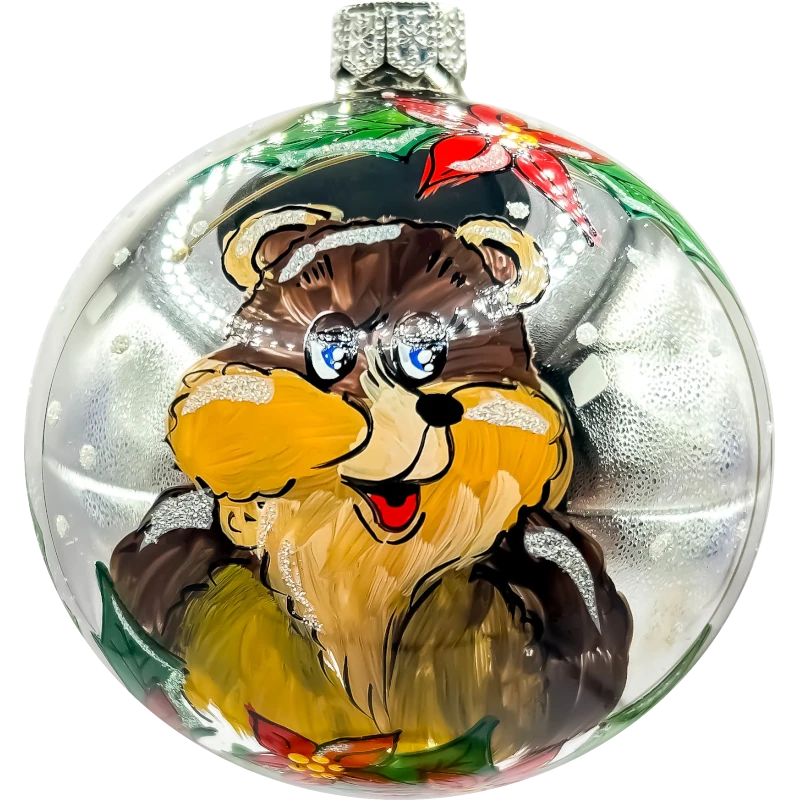 Ta wyjątkowa szklana bombka choinkowa przedstawia uroczego misia z szerokim, przyjaznym uśmiechem. Ręcznie malowany motyw misia wyróżnia się intensywnie niebieskimi oczami oraz bogatymi detalami, które nadają mu realistycznego wyglądu. Tło bombki jest przezroczyste, co nadaje ozdobie lekkości i pozwala pięknie odbijać światło choinkowych lampek. Na górze bombki widoczna jest zielona gałązka z czerwoną gwiazdą betlejemską, a dodatkowy czerwony kwiat zdobi dolną część bombki.