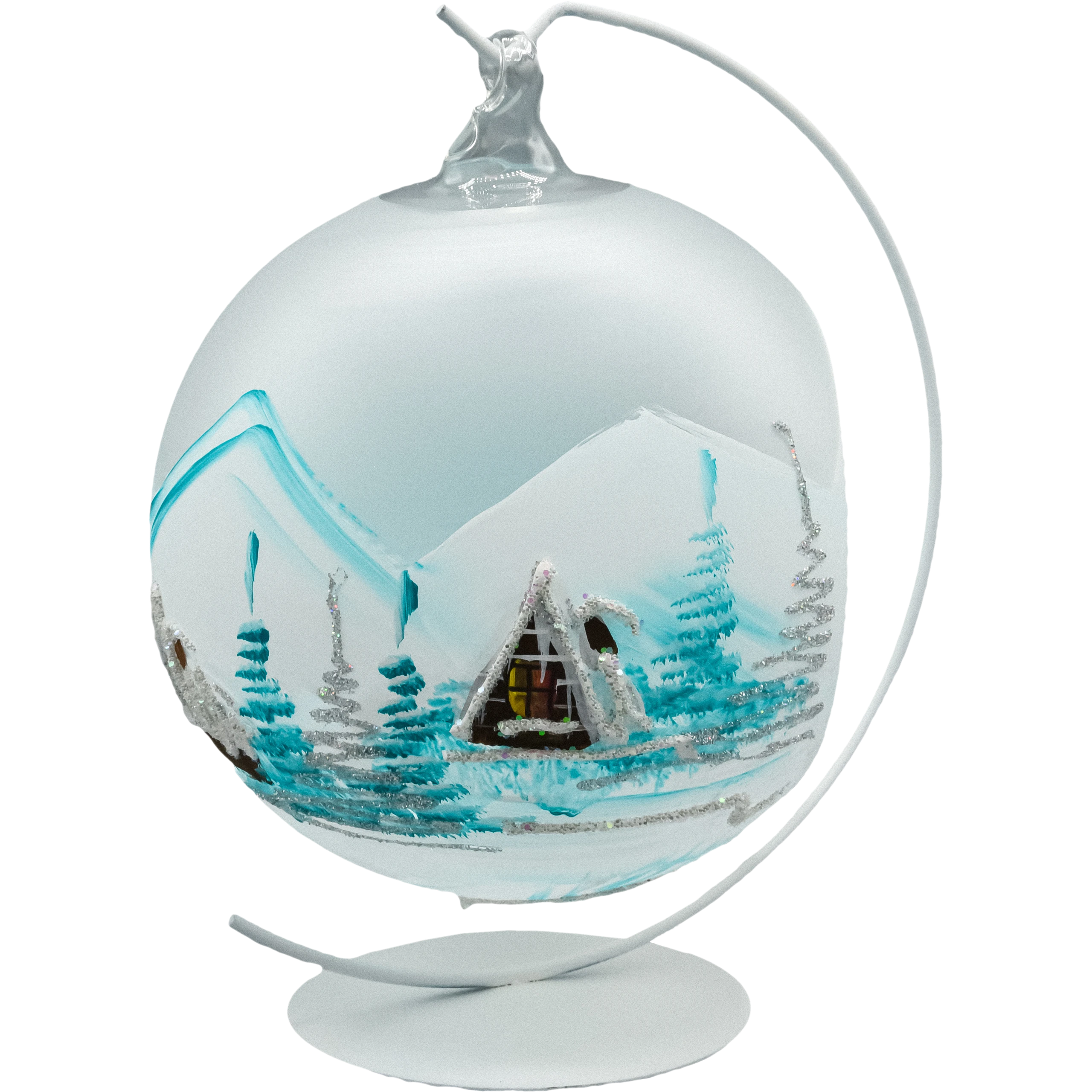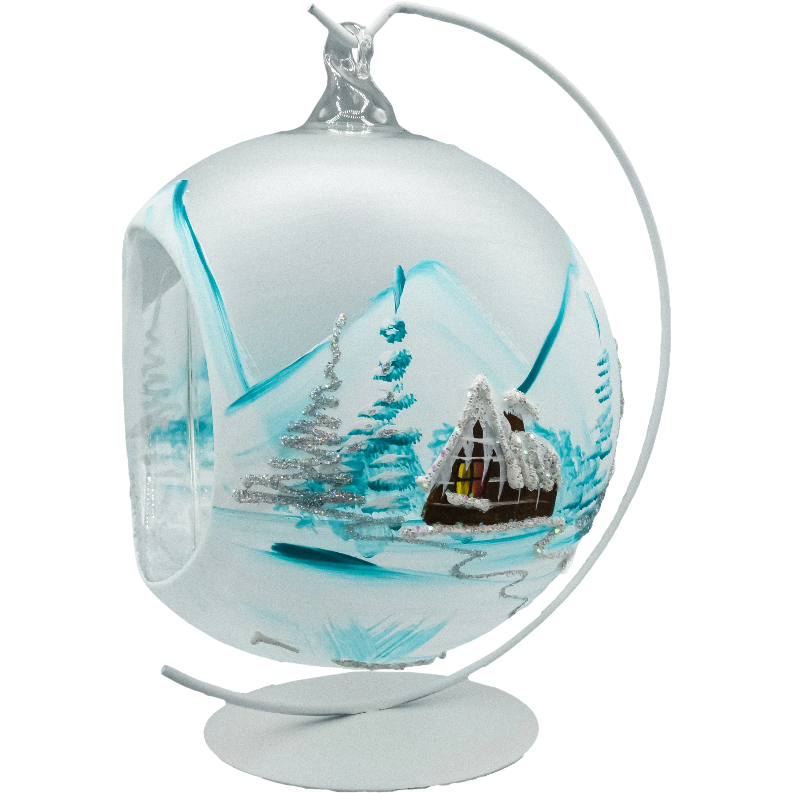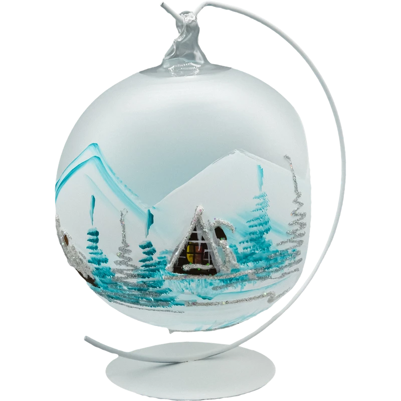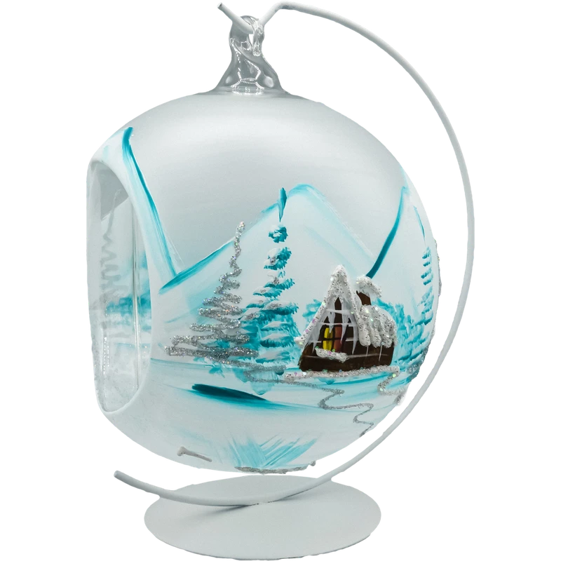 Otwarta forma bombki umożliwia umieszczenie wewnątrz świeczki typu tealight, tworząc subtelny efekt świetlny i podkreślając malowany pejzaż. Bombka zawieszona jest na metalowym stojaku w kształcie półksiężyca, który doskonale eksponuje dekorację i umożliwia ustawienie jej w dowolnym miejscu – od stołu wigilijnego po komodę w salonie.
