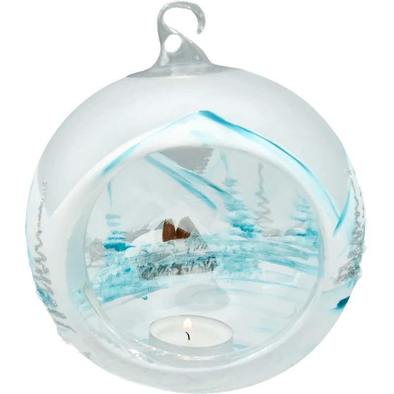 Szklana bombka lampion w błękitnych odcieniach z zimowym pejzażem i miejscem na świeczkę tealight. Ręcznie malowana, ze stojakiem. Idealna dekoracja świąteczna. Bombka w zestawie ze stojakiem o wysokości 15cm.