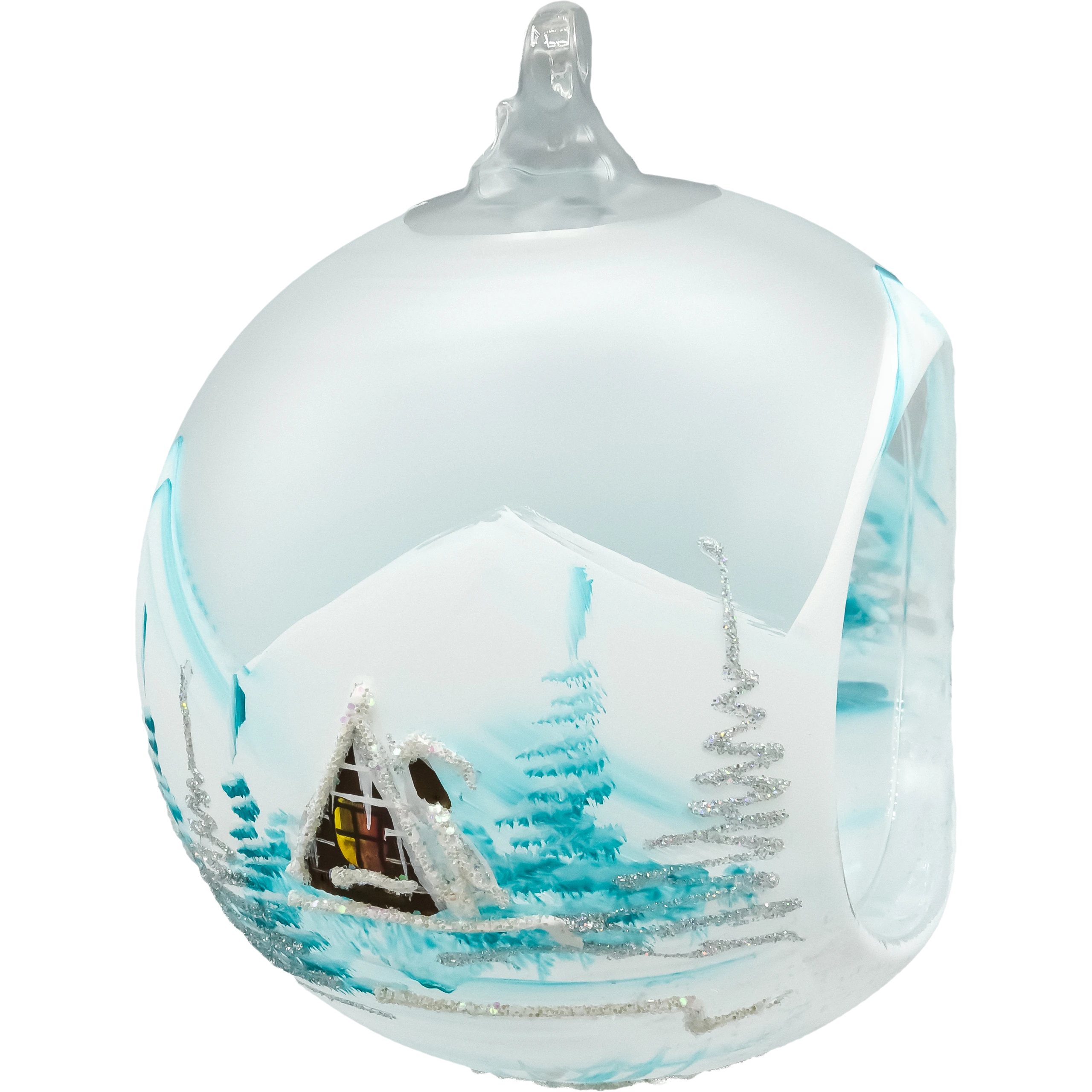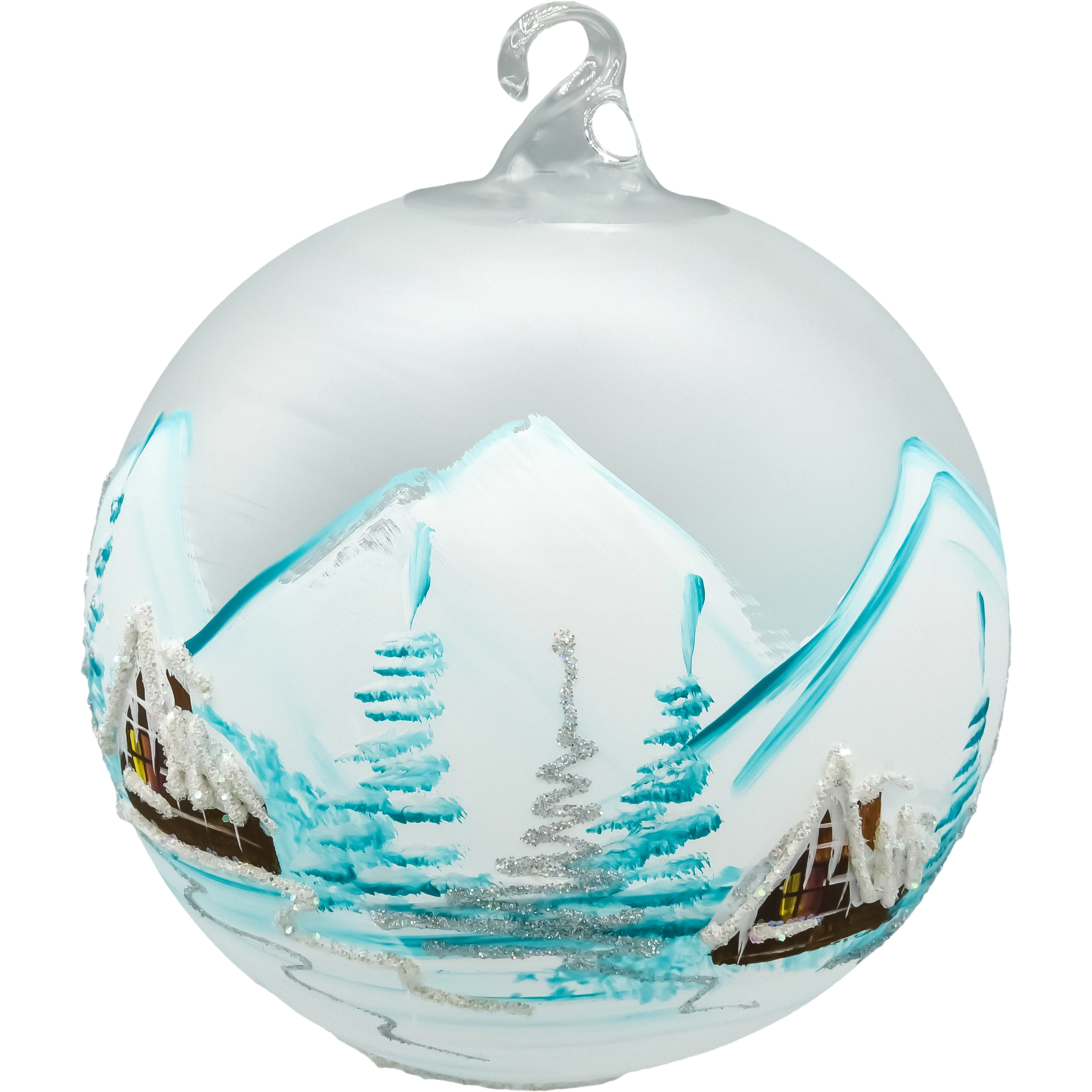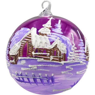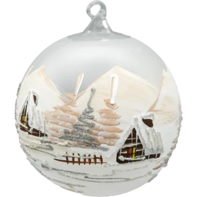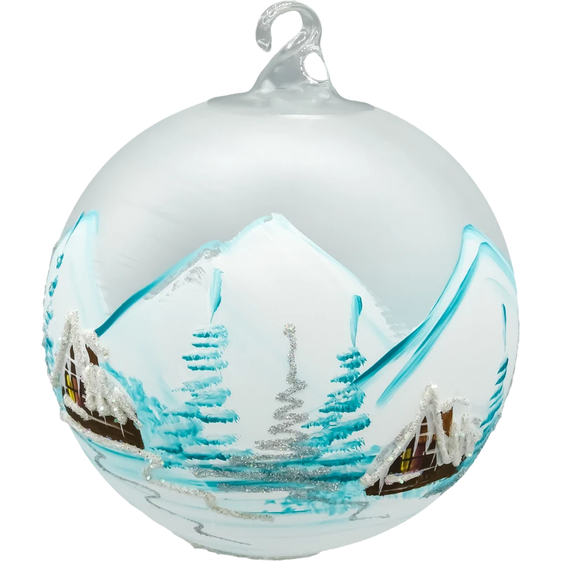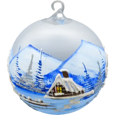 Wprowadź do swojego wnętrza magię zimowej nocy dzięki tej wyjątkowej szklanej bombce w formie lampionu, ozdobionej w chłodnej, błękitnej tonacji. Każda bombka została ręcznie wykonana i misternie pomalowana przez polskich artystów, którzy uchwycili urok górskiego krajobrazu. Scena przedstawia urokliwe, drewniane domki otoczone świerkami pokrytymi śniegiem, a całość zamknięta jest w matowym, mroźnym szkle o mlecznym wykończeniu.