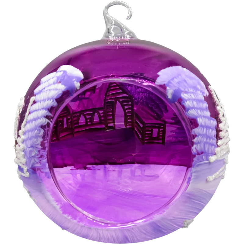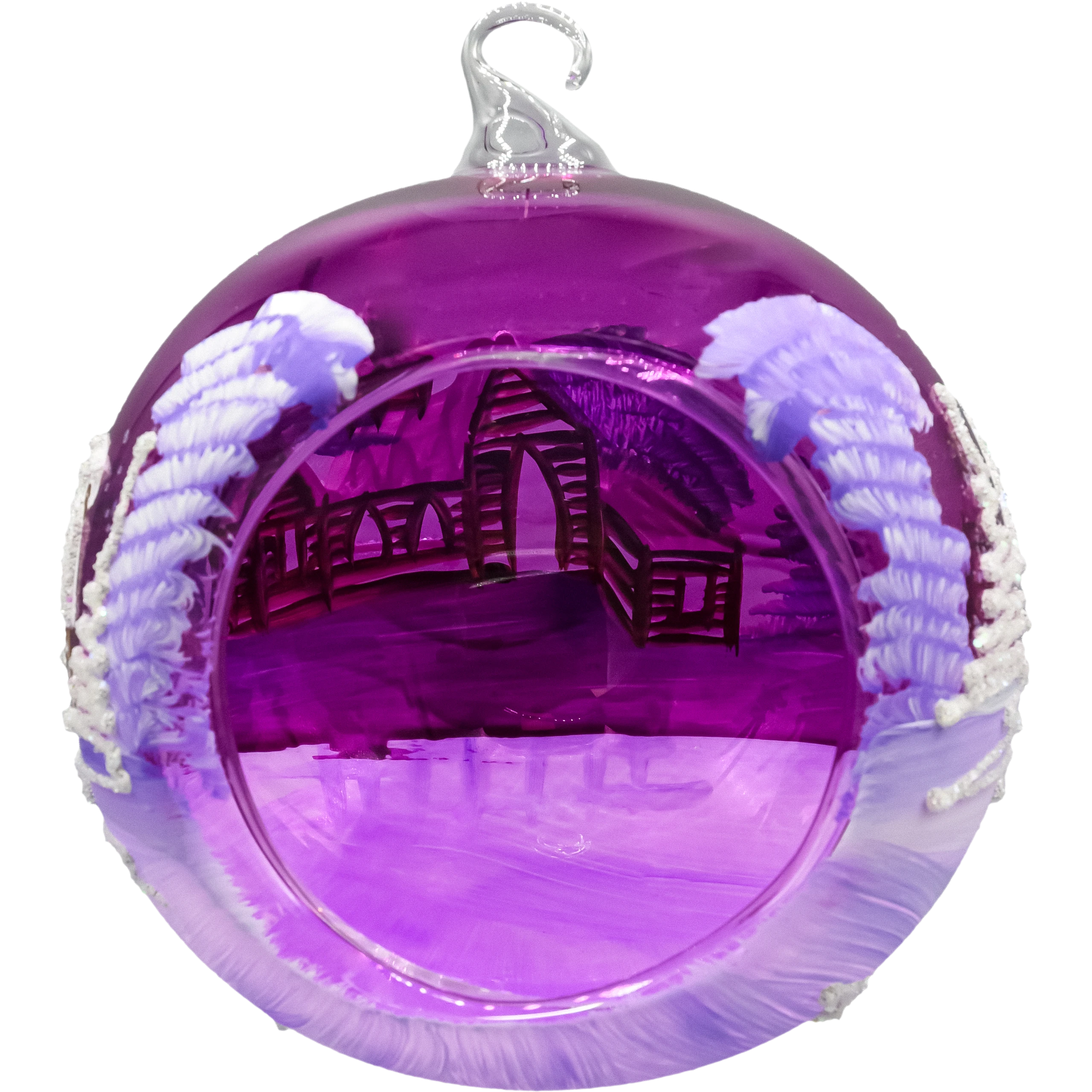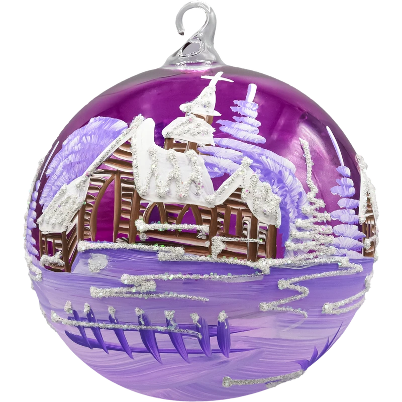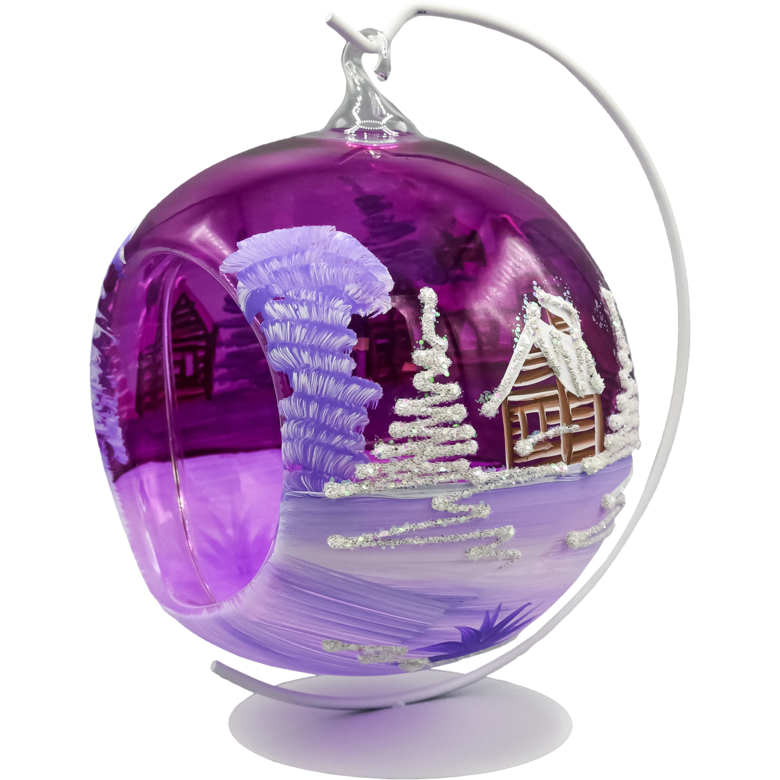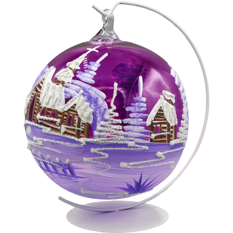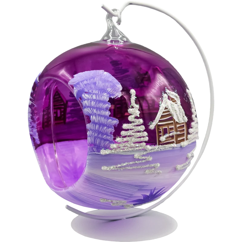 Ręcznie dmuchana bombka szklana – lampion o średnicy 15 cm w głębokim, ametystowo-fioletowym kolorze. Kula ma szerokie okno lampionu, przez które widać misternie malowaną scenę: drewniany kościółek, chatki, świerki i zaspy śniegu. Selektywnie położony srebrny brokat daje efekt skrzącego się puchu, a transparentny fiolet pięknie „łapie” światło. W komplecie otrzymujesz stabilny, biały metalowy stojak, dzięki czemu dekoracja od razu jest gotowa do ekspozycji. Wystarczy dodać tealight LED lub mikro-lampki, by uzyskać nastrojowy, zimowy lampion.