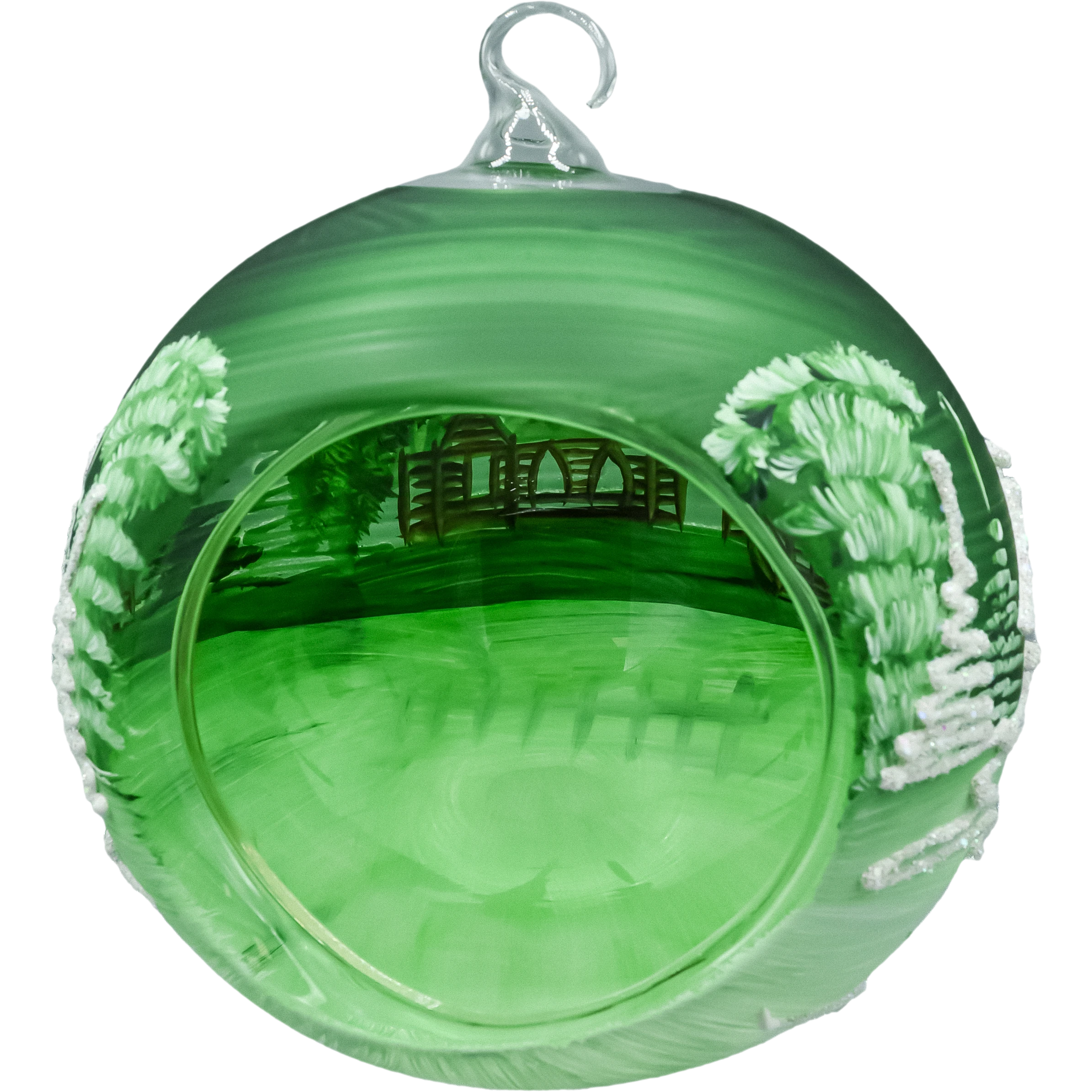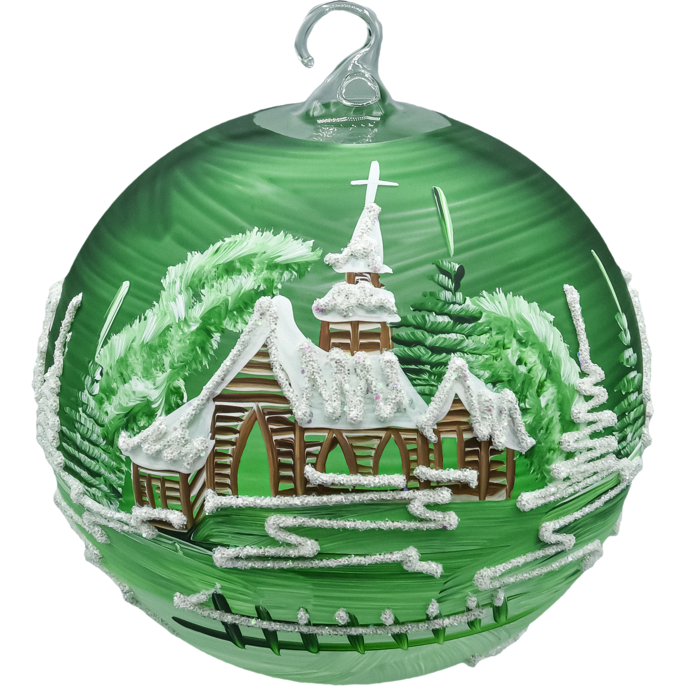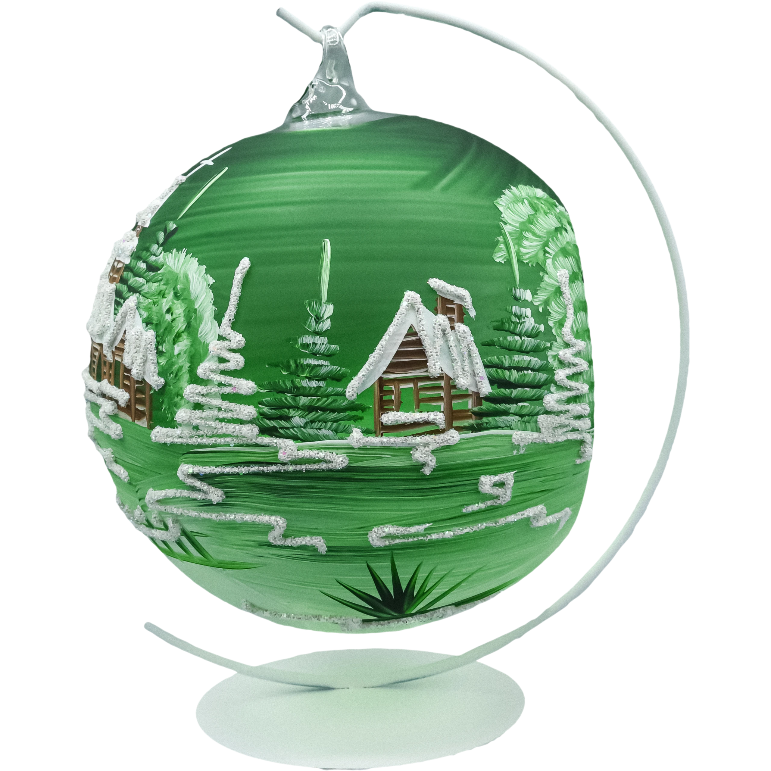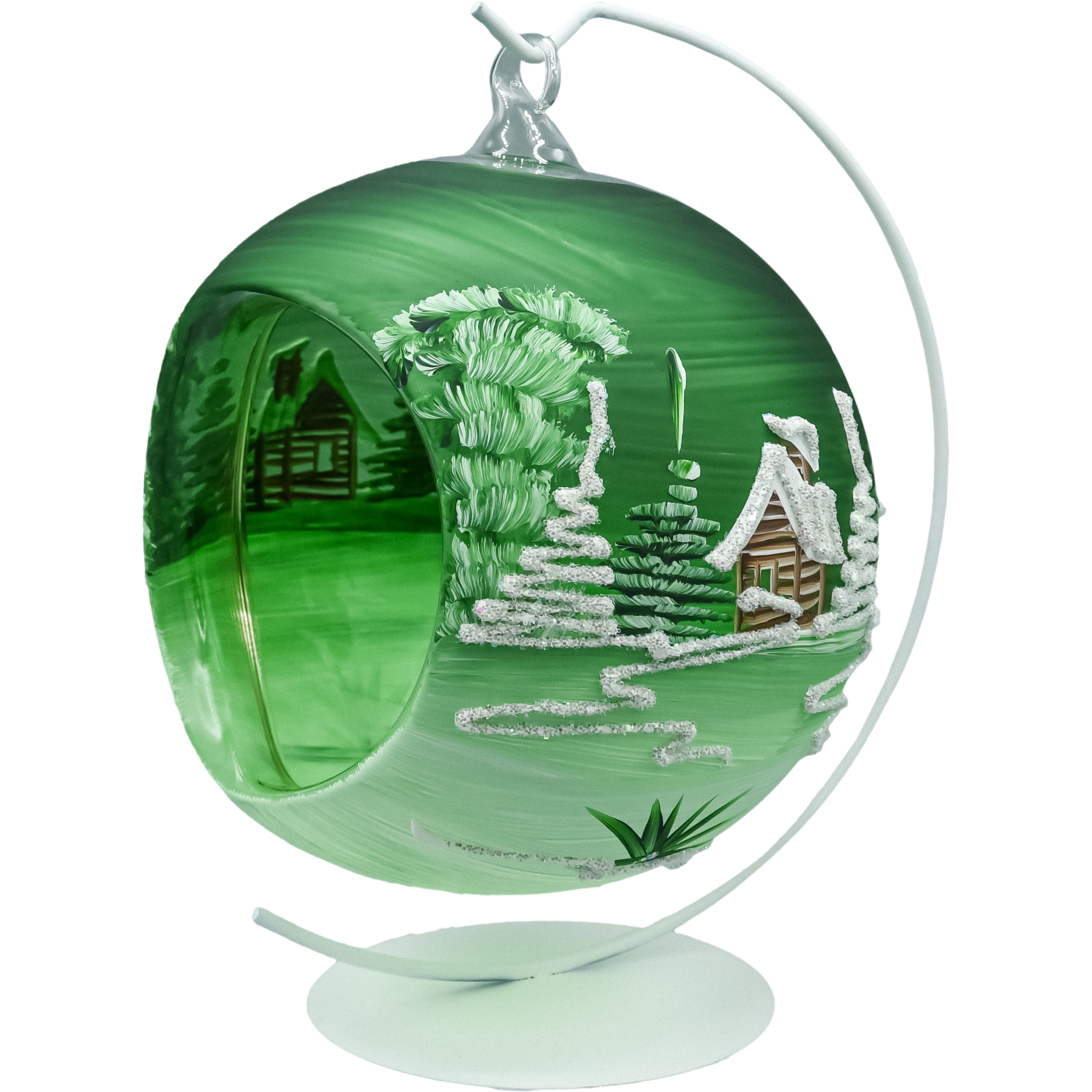 • Wygląd: zielone szkło, ręcznie malowany zimowy pejzaż (kościółek, choinki, zaspy), akcenty z drobnego brokatu–śniegu.