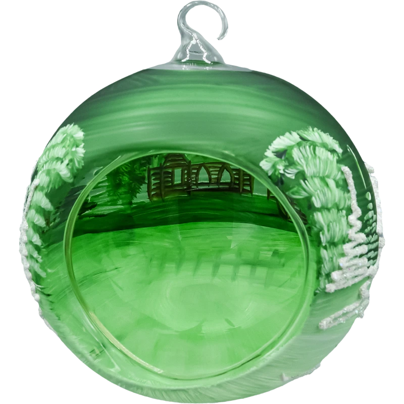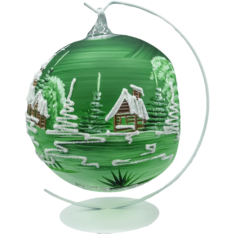 Szklana bombka–lampion z otworem na świeczkę w kolorze głębokiej zieleni, dmuchana ustnie i ręcznie malowana w zimowy pejzaż z kościółkiem i śnieżnymi drzewami. Ażurowe wycięcie tworzy funkcję lampionu – po włożeniu świeczki tealight (najlepiej LED) szkło rozświetla się od środka, a brokatowy śnieg i pociągnięcia pędzla pięknie migoczą. W zestawie znajduje się stabilny metalowy stojak, dzięki któremu ozdoba może zdobić nie tylko choinkę, lecz także komodę, stół wigilijny czy parapet.