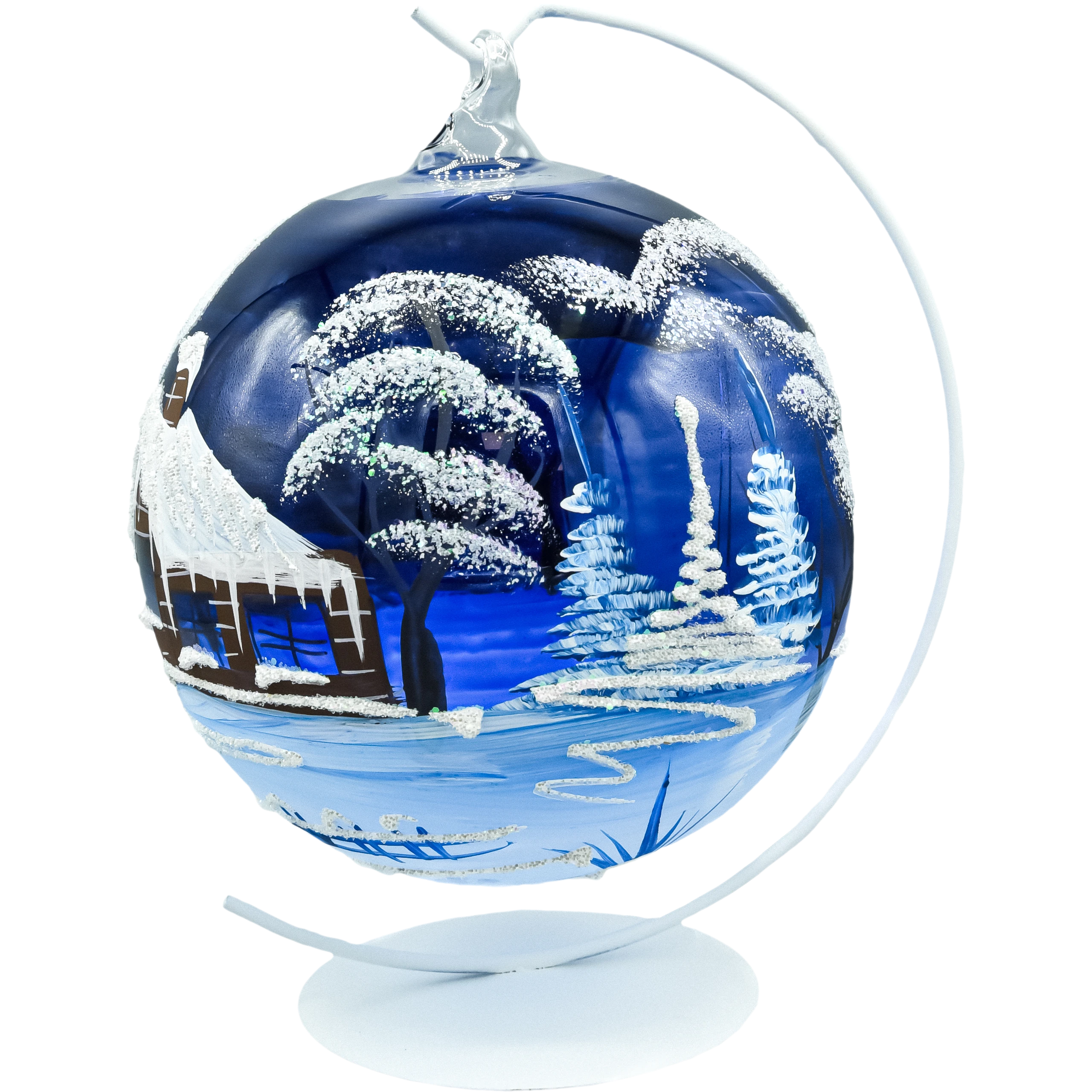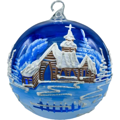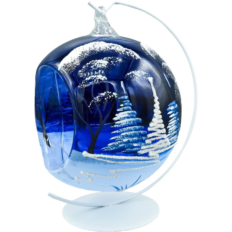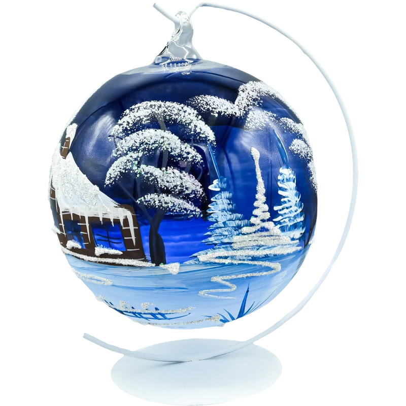 Wytworna bombka lampion – szklana kula 15 cm z wycięciem i ręcznie malowanym, zimowym pejzażem. Na granatowym tle błyszczy śnieg, smukłe świerki i przytulna chatka z soplami. Otwarty „kominek” lampionu od frontu pozwala włożyć świeczkę LED/tealight, dzięki czemu dekor rozświetla wzór od środka i tworzy magiczny klimat. W zestawie znajduje się stabilny, metalowy stojak dopasowany do bombki – dekor można ustawić na komodzie, stole czy parapecie, bez konieczności wieszania.