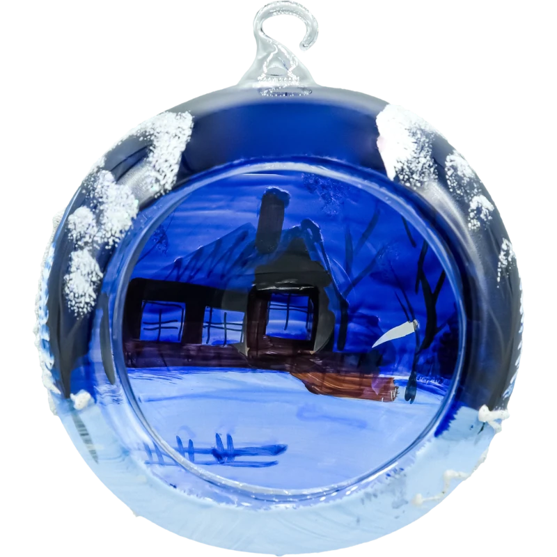 Elegancka bombka lampion 15 cm z ręcznie malowaną zimową chatką na granatowym tle. Szklana kula z wycięciem na świeczkę LED pięknie rozświetla brokatowy śnieg. W komplecie metalowy stojak, dzięki któremu dekorację postawisz w dowolnym miejscu. Polskie rękodzieło, szklana bombka, idealna na prezent i nastrojową dekorację świąteczną.