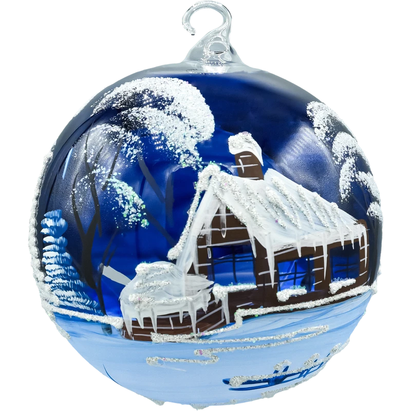 • Kolorystyka: granat / błękit, biel, akcenty srebrzyste – zimowy krajobraz z chatką.