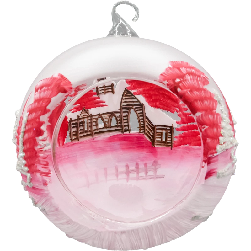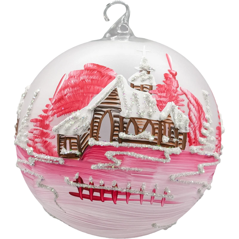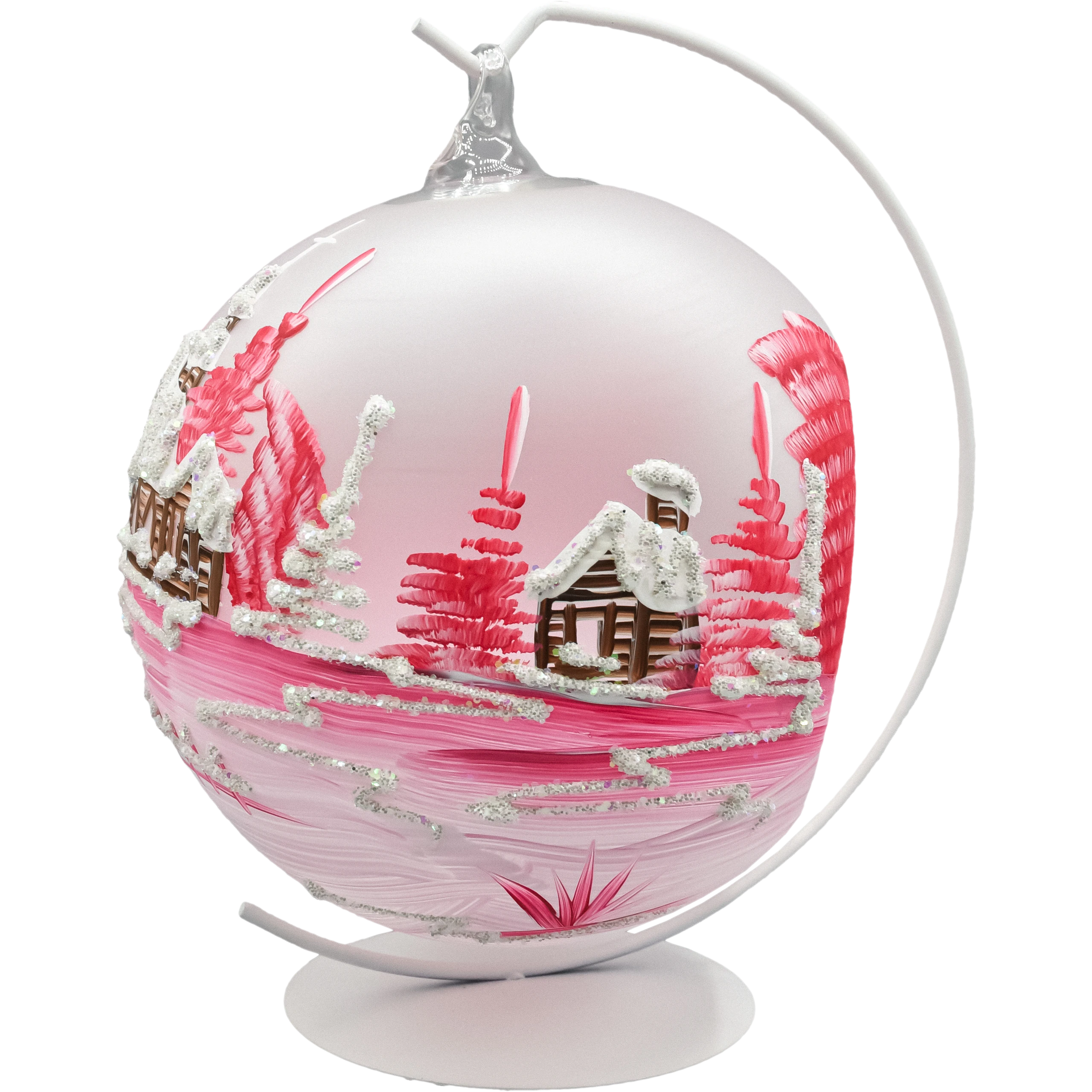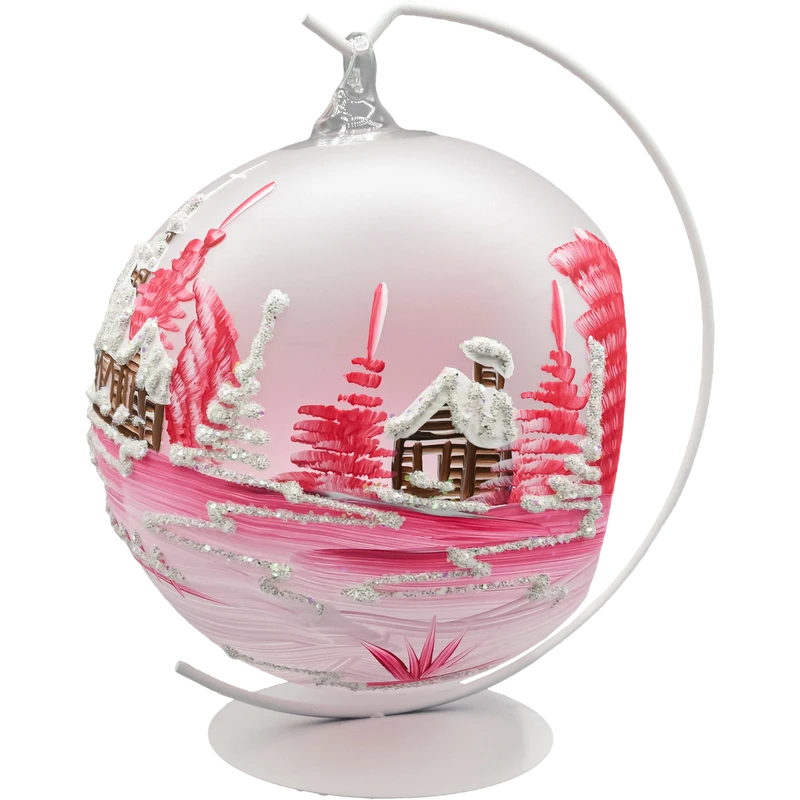 Ręcznie dmuchana bombka szklana – lampion o średnicy 15 cm w subtelnym, różowym odcieniu. Kula ma szerokie okno lampionu, przez które widać misternie malowaną scenę: drewniany kościółek, chatki i świerki otulone śniegiem. Selektywny srebrny brokat daje efekt skrzącego się puchu, a różowa paleta pięknie „łapie” ciepło światełek. W komplecie znajduje się stabilny, biały metalowy stojak, więc dekoracja jest gotowa do ekspozycji zaraz po rozpakowaniu. Dodaj tealight LED lub mikro-lampki, a lampion stworzy nastrojową, zimową iluminację – idealną ozdobę świąteczną na stół, komodę i parapet.
