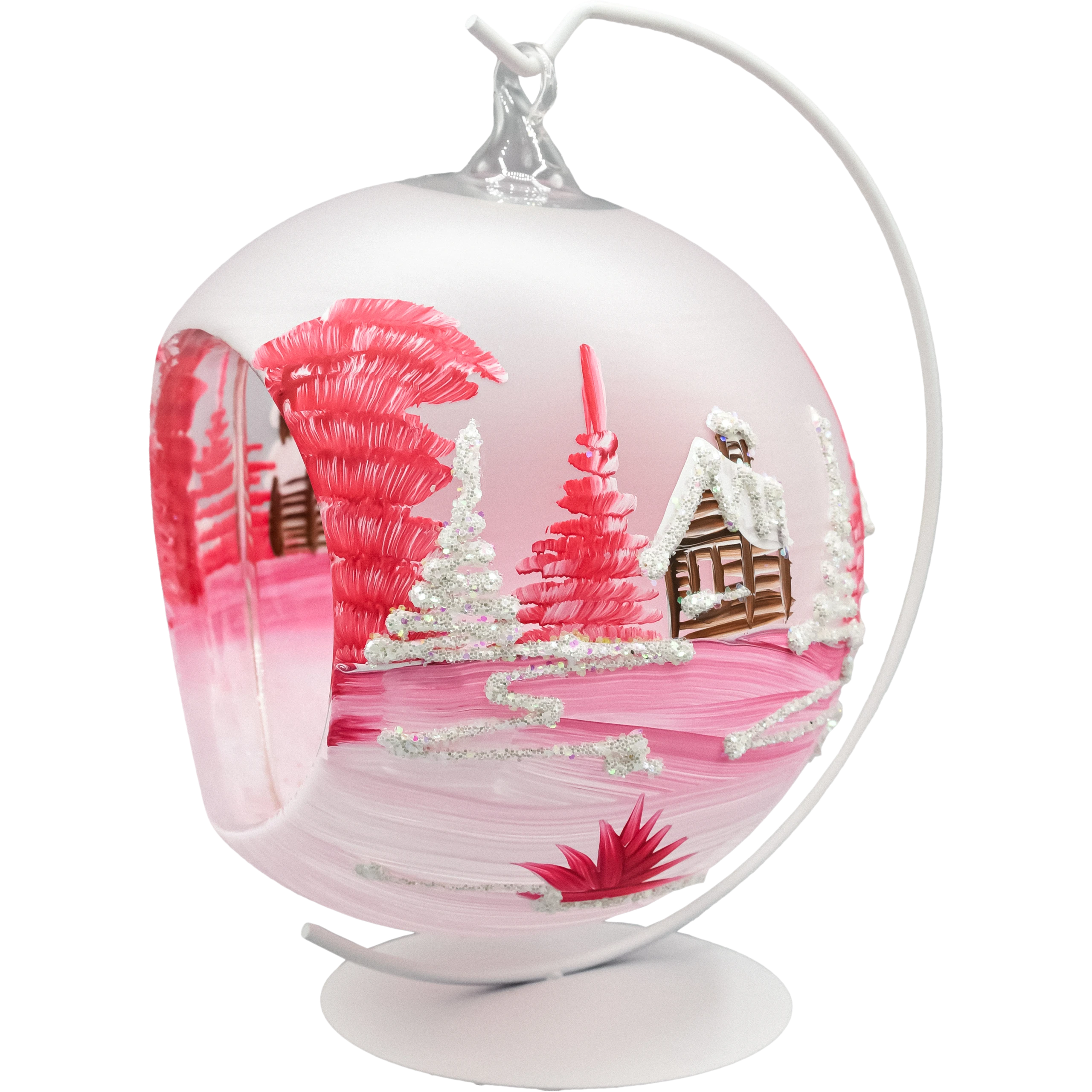 Bombka szklana lampion 15 cm – różowa z ręcznie malowaną zimową wioską i kościółkiem, w komplecie z białym metalowym stojakiem. Okno lampionu pozwala dodać LED tealight i stworzyć nastrojową ozdobę świąteczną na stół, komodę lub parapet. Rękodzieło, efekt premium.