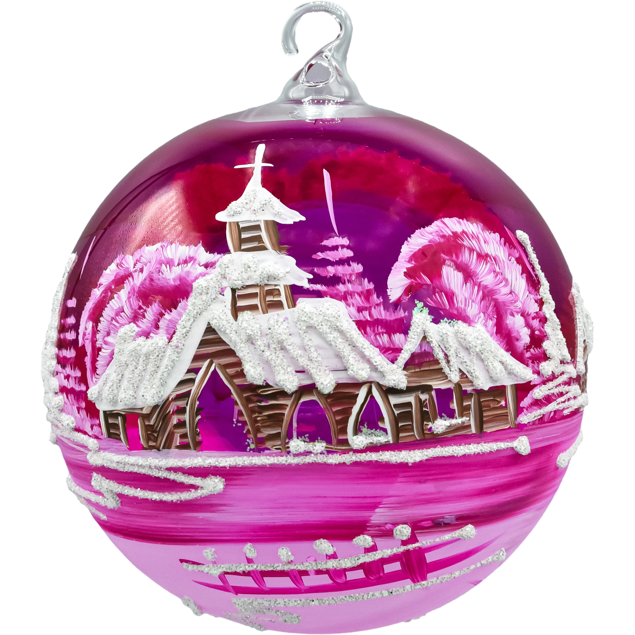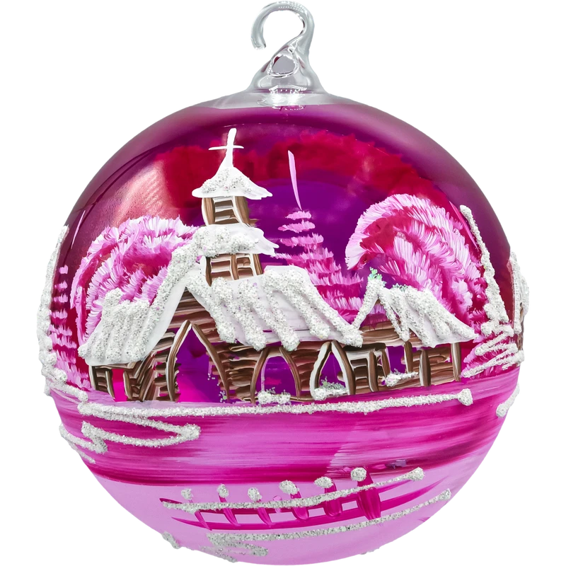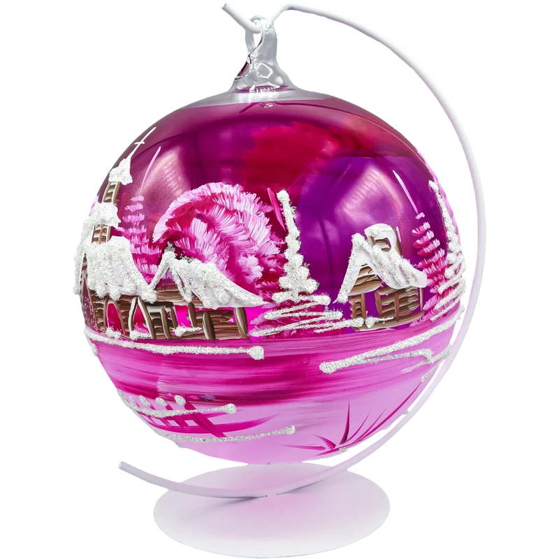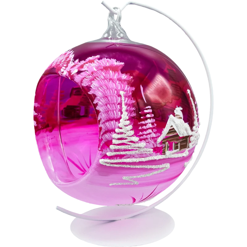 Wytworna szklana bombka-lampion 12 cm z dużym, wyciętym oknem i malowanym ręcznie zimowym pejzażem. Transparentne, malinowo-różowe szkło pięknie rozprasza światło, a brokatowy „śnieg” i biel choinek dodają blasku niczym w świątecznej kuli. W zestawie znajduje się stabilny stojak w kolorze białym, dzięki czemu ozdoba od razu jest gotowa do ekspozycji na stole, komodzie czy parapecie. To elegancka alternatywa dla klasycznych ozdób – bombka choinkowa lampion tworzy nastrojową iluminację, kiedy w środku umieścisz świeczkę typu tealight (najlepiej LED).