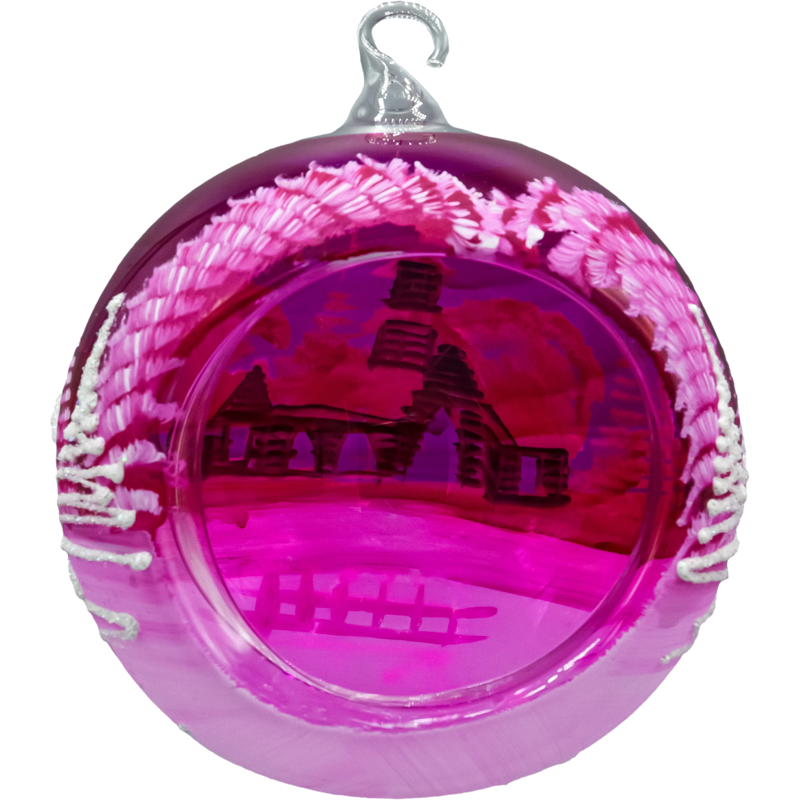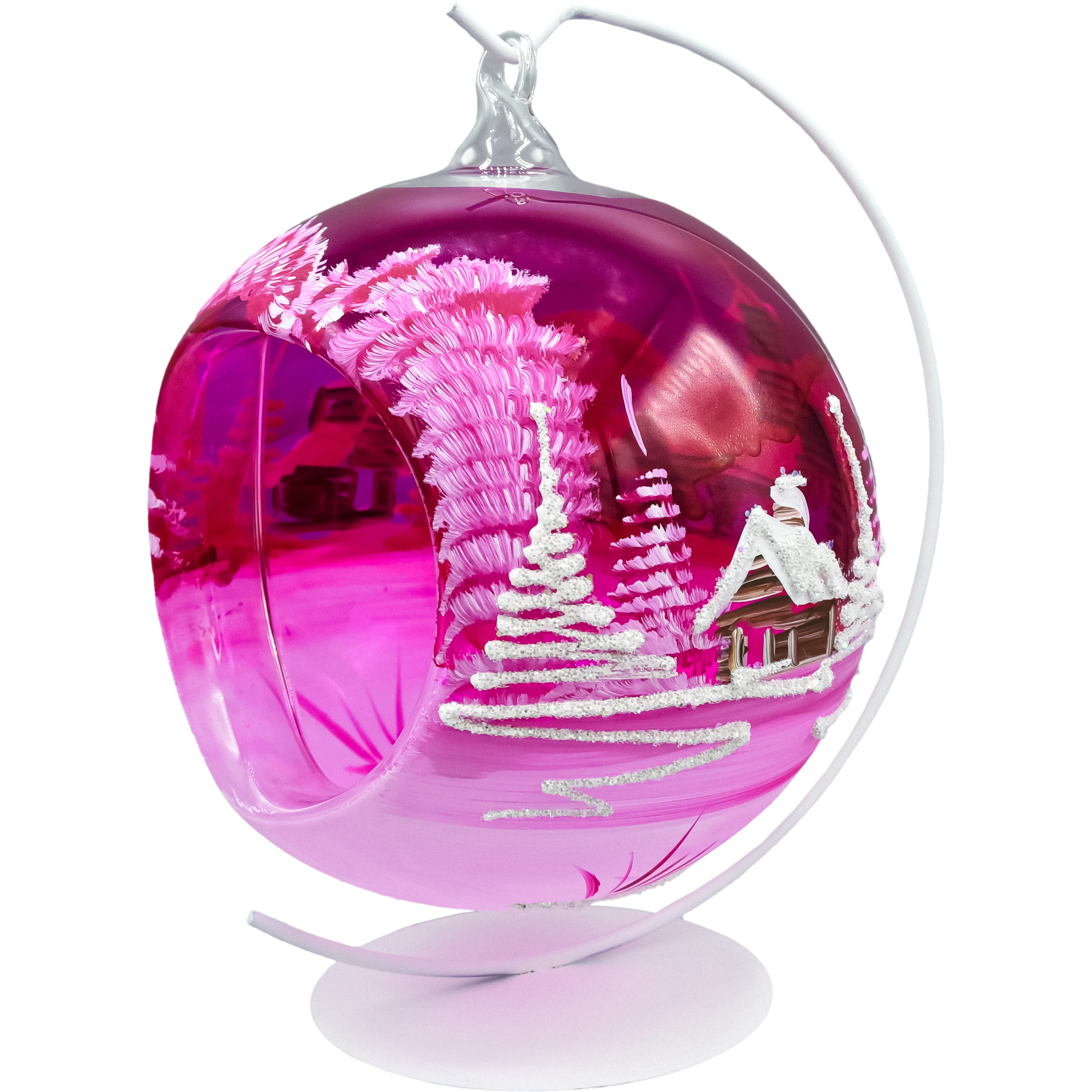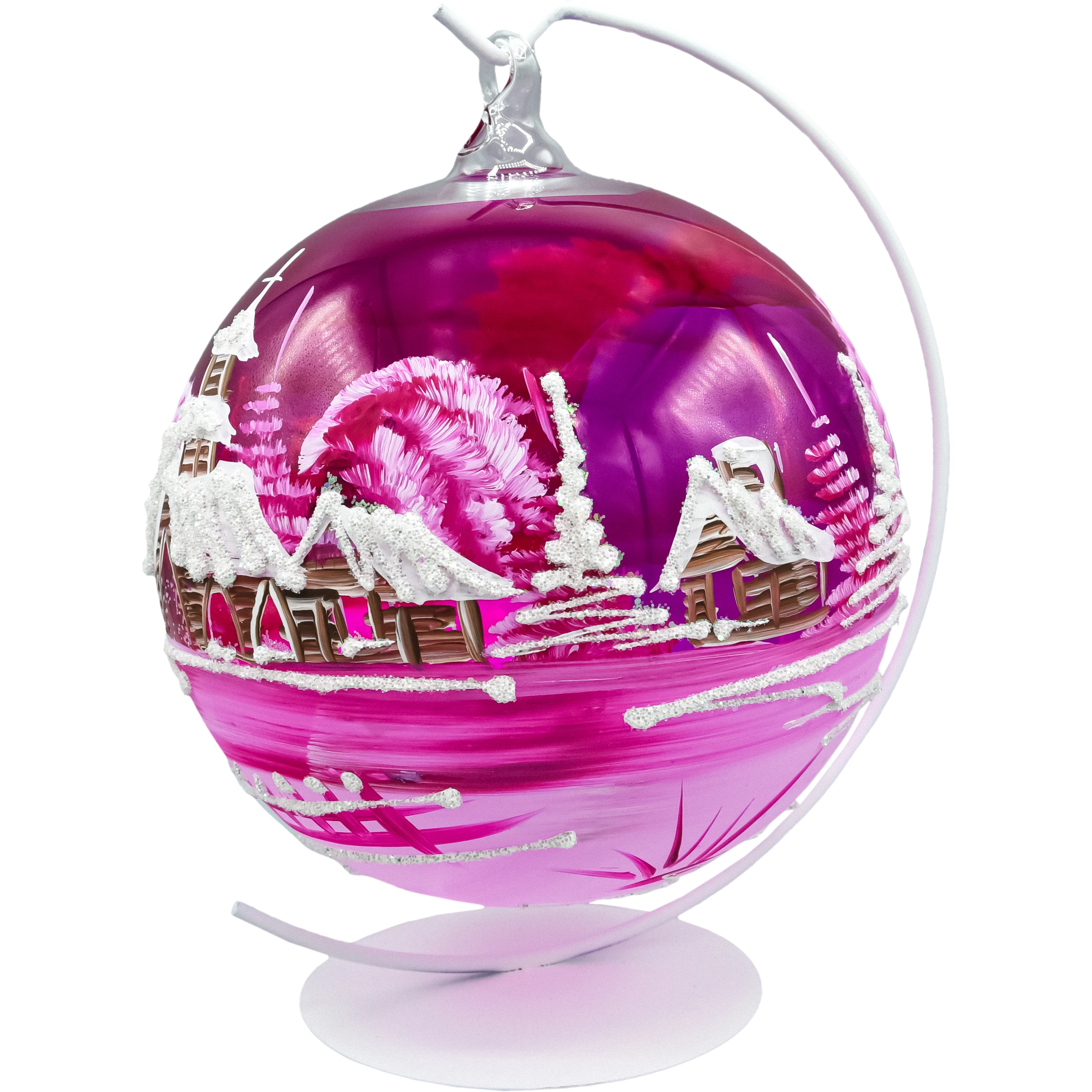 Ta ręcznie malowana bombka lampion na stojaku łączy w sobie tradycję (dmuchane szkło) i nowoczesny design (transparentny róż i efekty świetlne). Dzięki wycięciu światło pięknie podbija kontury pejzażu, tworząc ciepły, zimowy klimat. Ozdoba sprawdzi się w aranżacjach glamour, nowoczesnych i skandynawskich, a także jako przyciągający wzrok akcent w witrynie sklepowej lub hotelowym lobby.