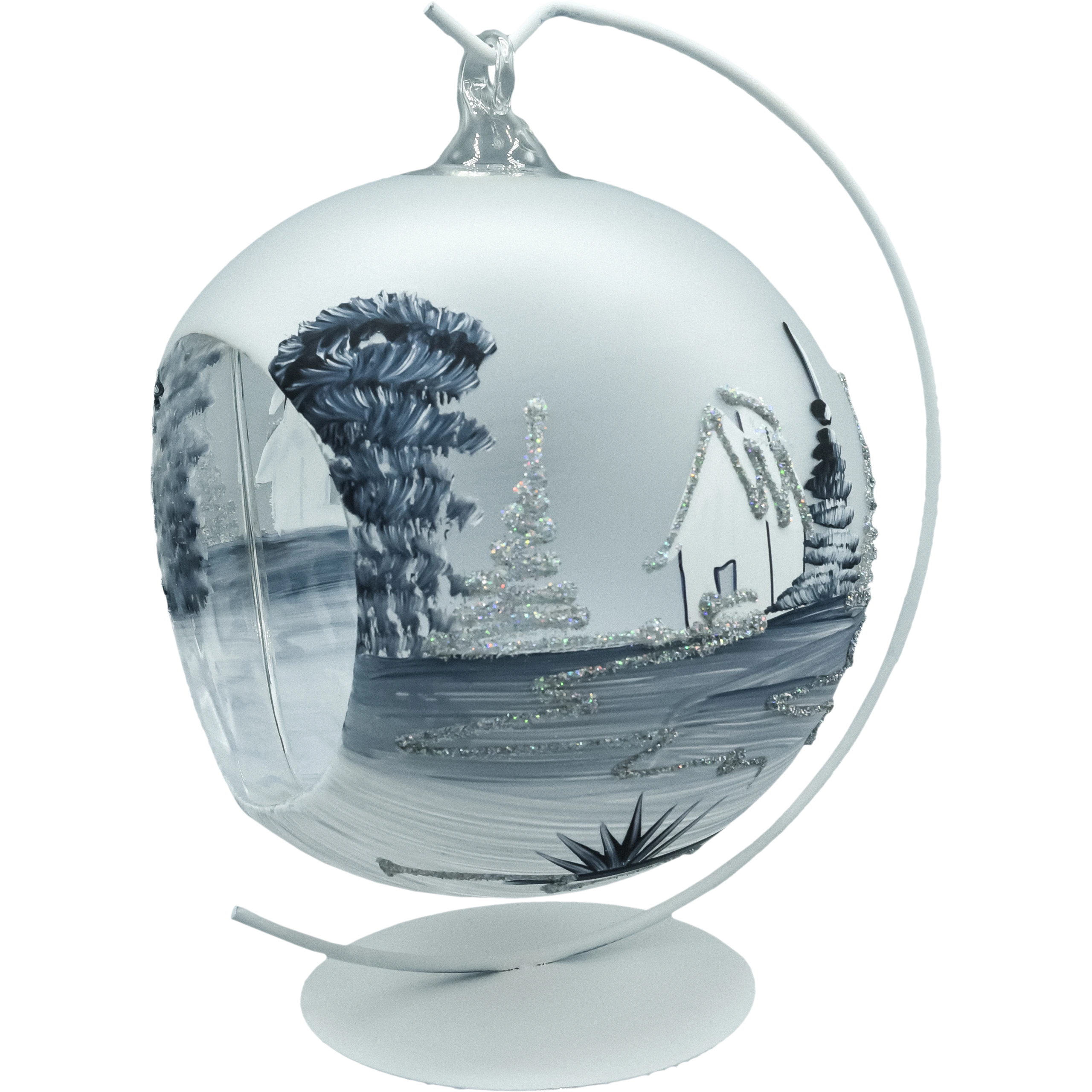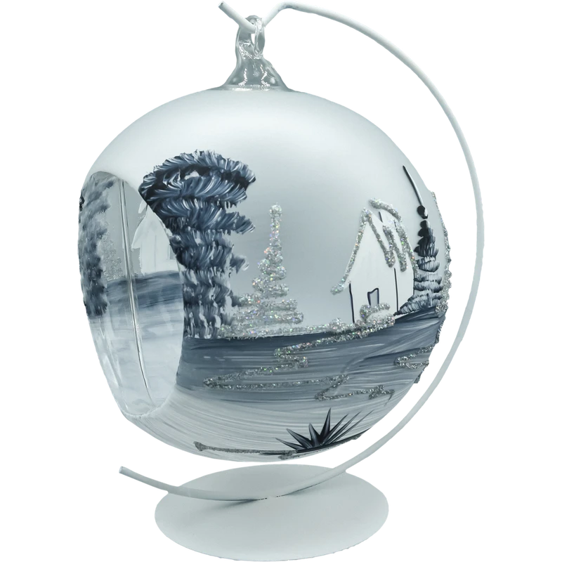 Ręcznie malowana szklana bombka–lampion 15 cm z zimowym pejzażem w odcieniach bieli i srebra. Wycięcie na świeczkę tworzy magiczną poświatę, a biały metalowy stojak pozwala od razu ustawić dekorację. Idealna ozdoba świąteczna, prezent i element kolekcji – lekka, elegancka, wykonana z polskiego szkła.