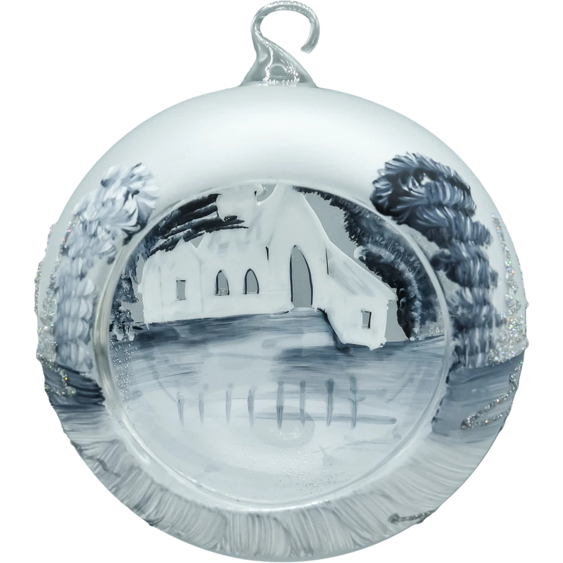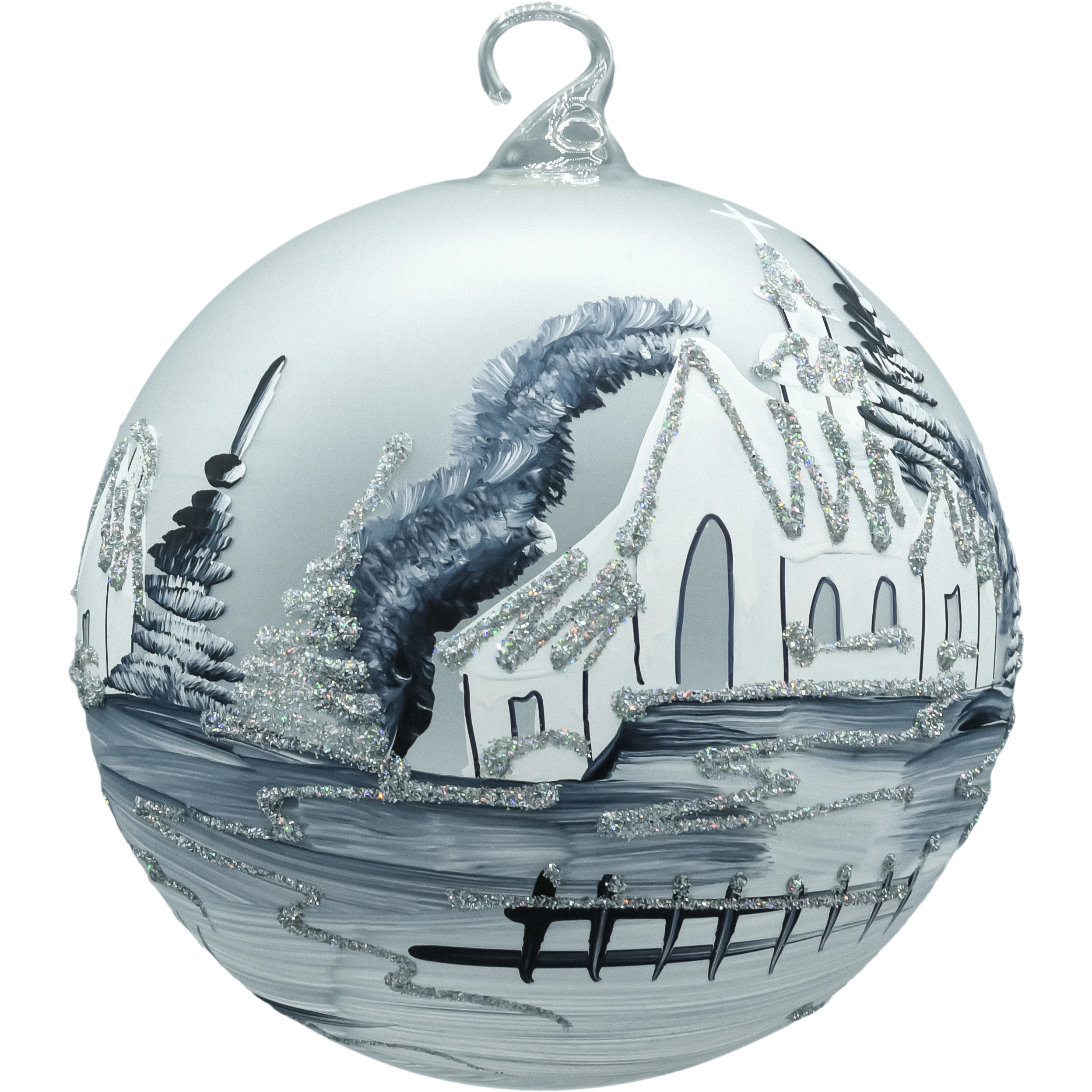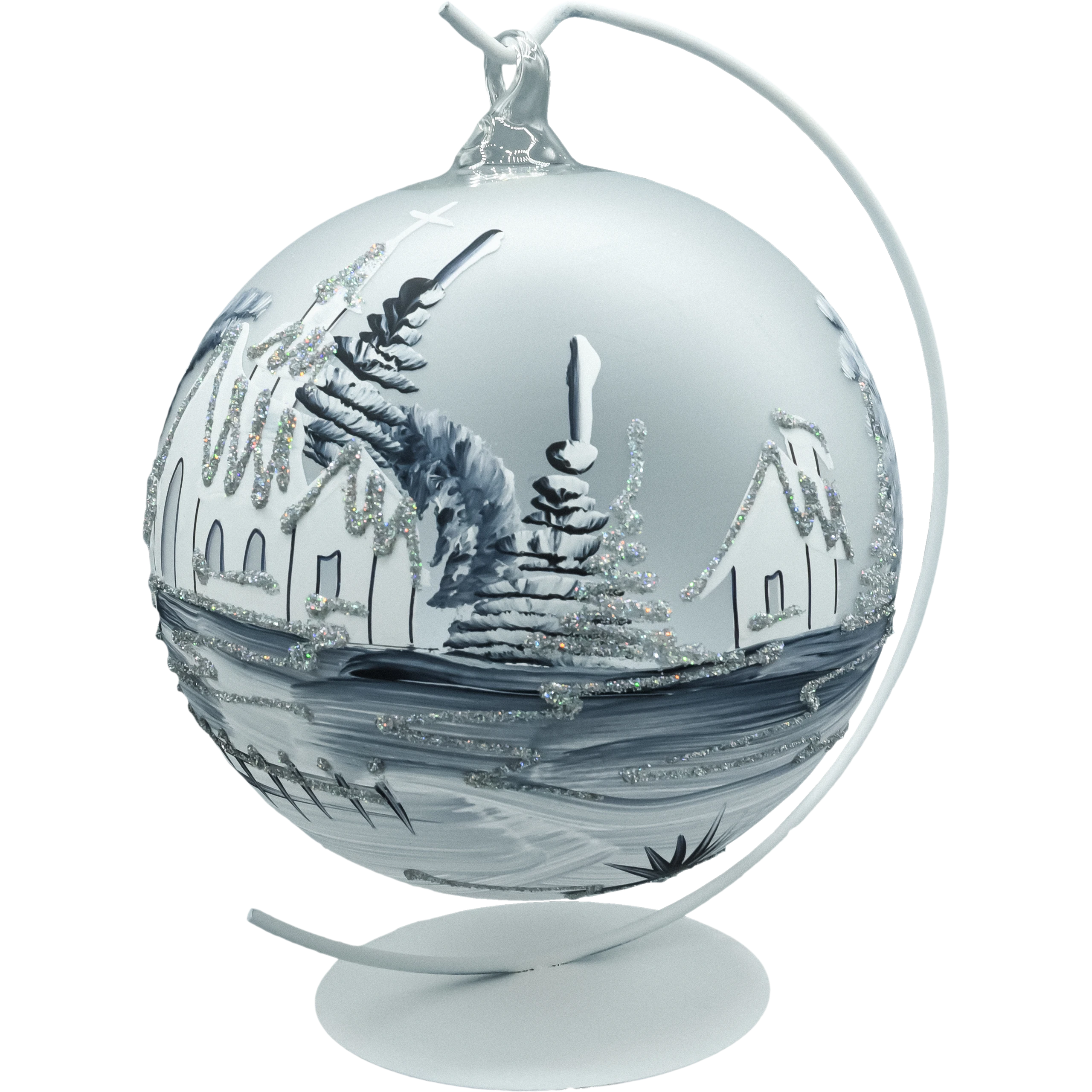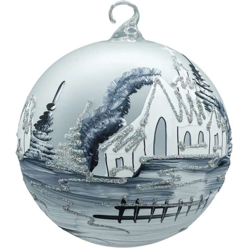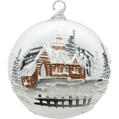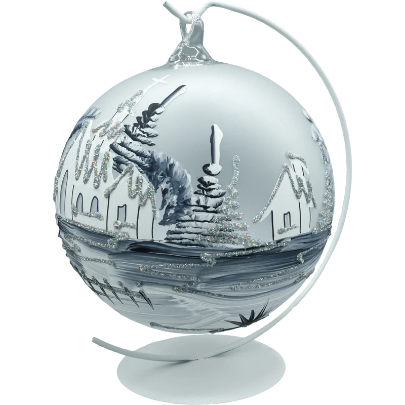 Zjawiskowa bombka–lampion o średnicy 15 cm wykonana z dmuchanego szkła i malowana w 100% ręcznie. Na matowym, srebrno–białym tle artysta namalował zimową wioskę z kościółkiem, świerkami i połyskiem śniegu. Monochromatyczna paleta bieli, srebra i grafitu, dopełniona drobnym brokatem, tworzy elegancki, „mroźny” efekt. Charakterystyczne okno–wycięcie zamienia bombkę w lampion – do środka możesz wstawić świeczkę tealight/LED, która pięknie rozświetla obraz, a odbicia w szkle budują nastrojową głębię. W komplecie otrzymujesz stabilny, metalowy stojak w kolorze białym, dzięki któremu dekoracja od razu jest gotowa do ekspozycji na komodzie, stole lub parapecie.