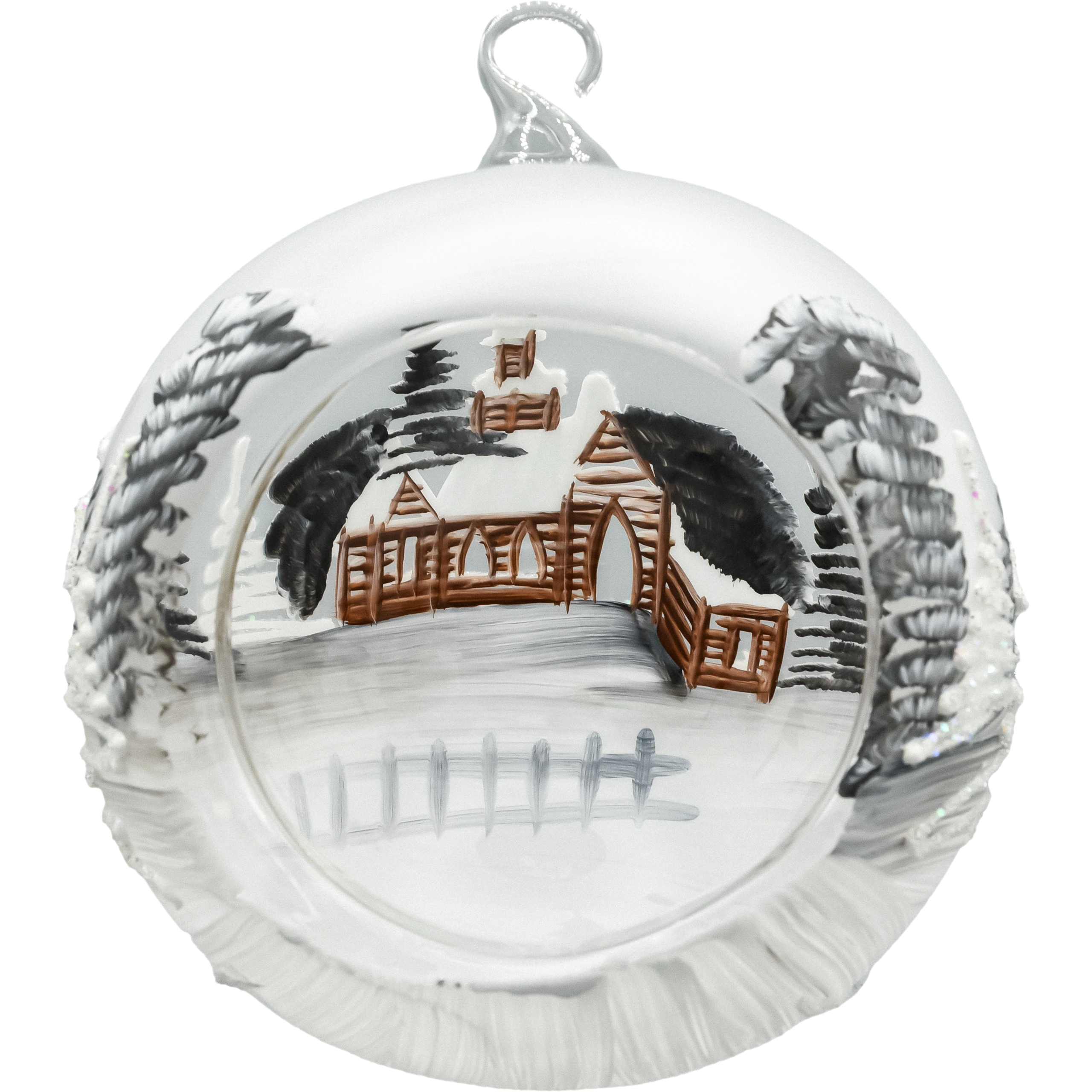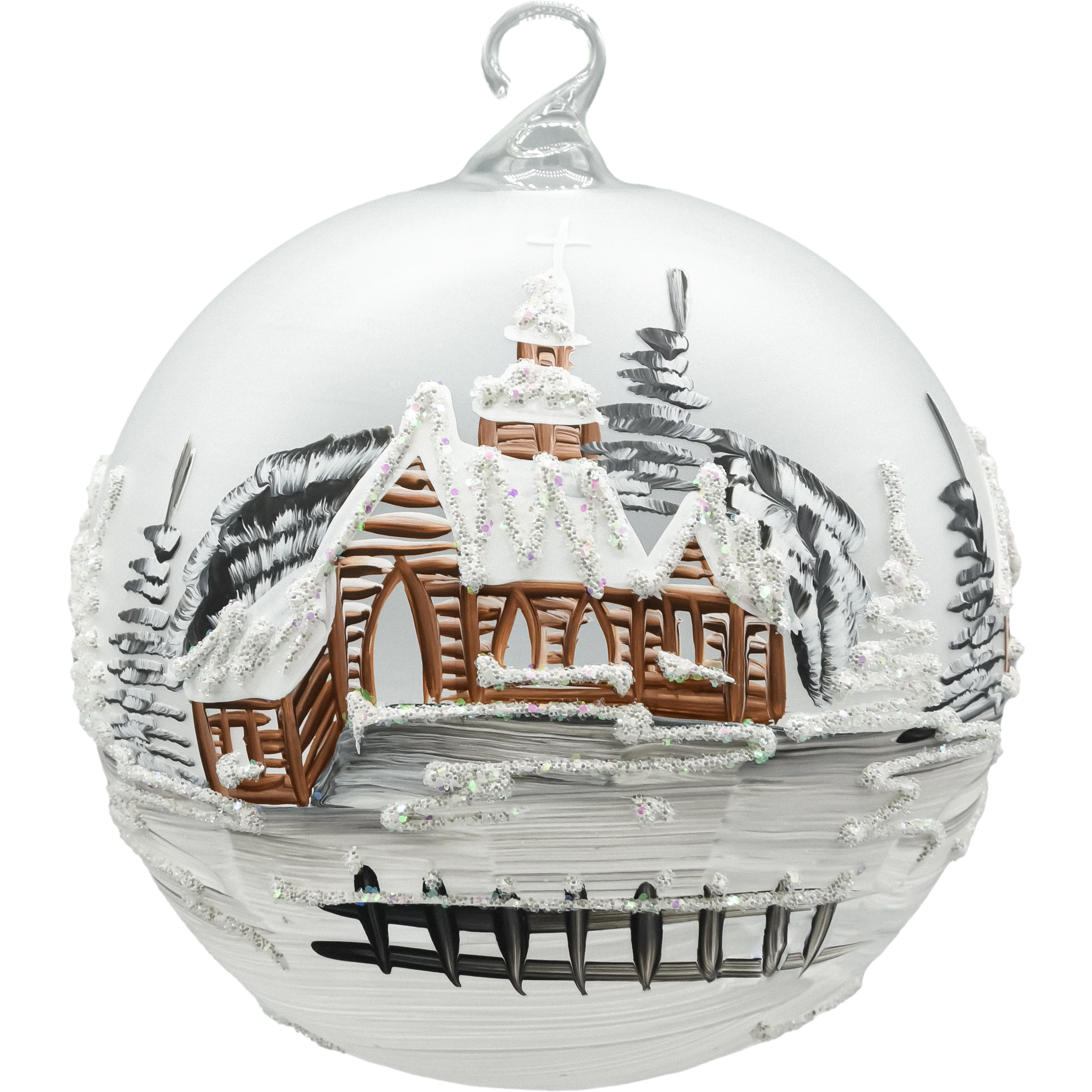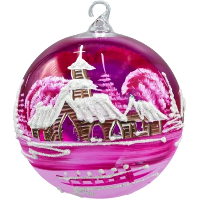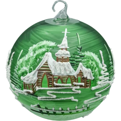• Dekor: ręcznie malowana zimowa wioska/kościółek, akcenty brokatowe