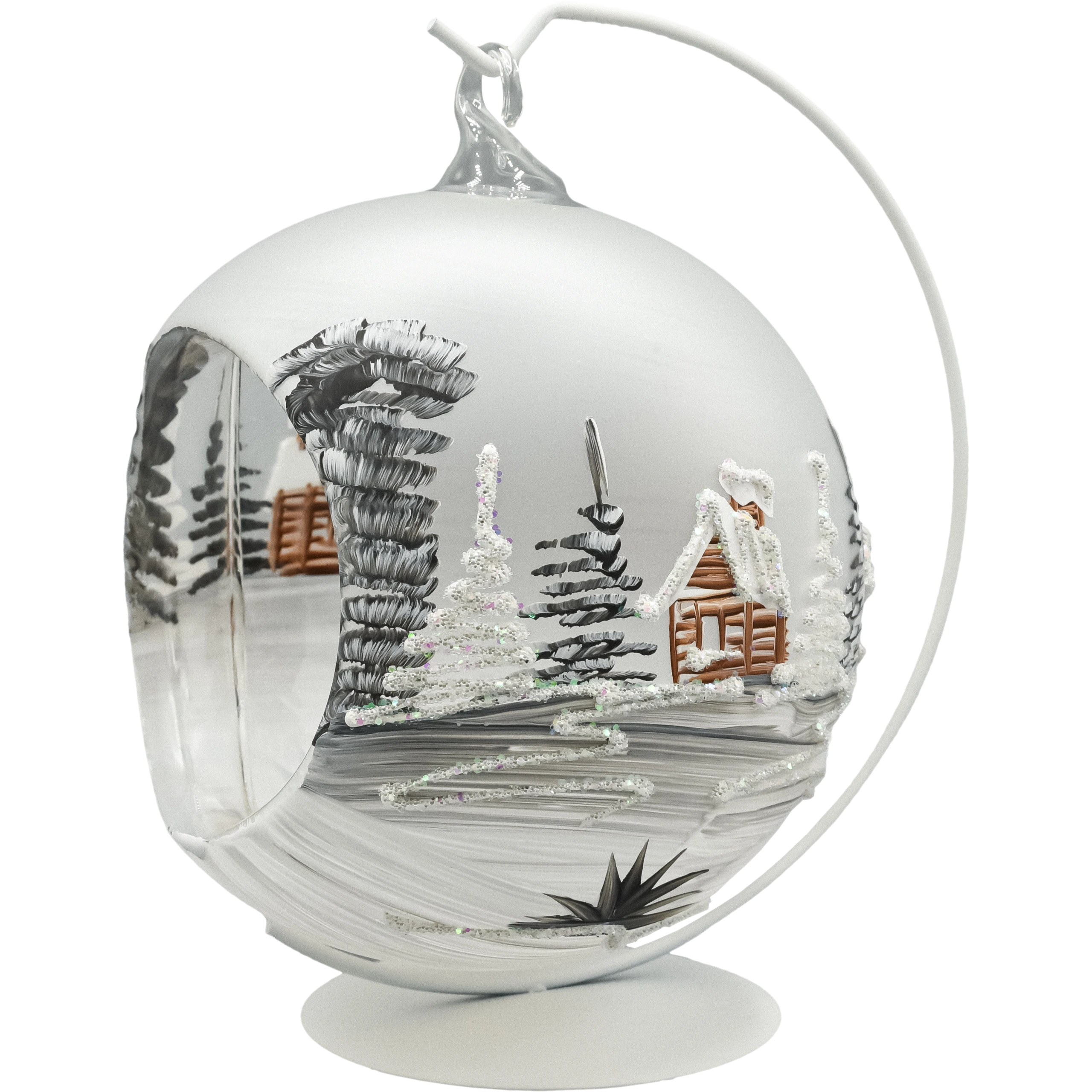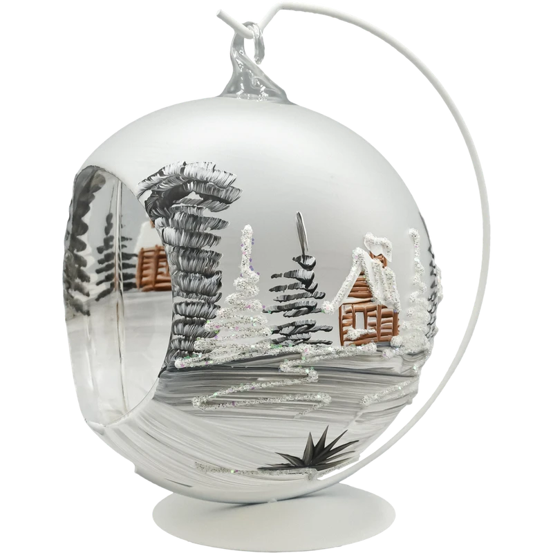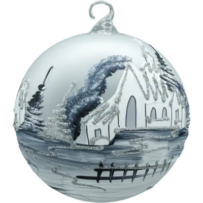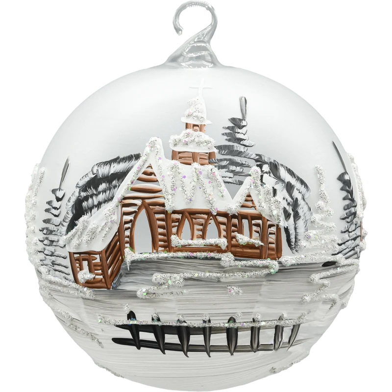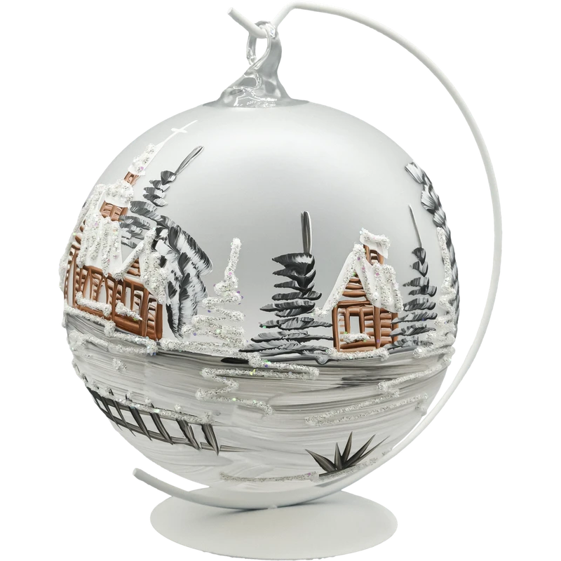Ręcznie dmuchana bombka szklana lampion o średnicy 15 cm w komplecie z metalowym stojakiem. Matowa, śnieżnobiała kula ma dekoracyjne wycięcie – okno lampionu, przez które widać misternie malowaną zimową wioskę z drewnianym kościółkiem i chatkami. Biel śniegu, cieniowane świerki i brokatowe sople tworzą efekt skrzącego się krajobrazu. Postawiona na komodzie, parapecie lub środku stołu staje się subtelną dekoracją świąteczną premium, a po dołożeniu światełka LED (np. tealight LED lub mikro-lampki na druciku) zamienia się w nastrojowy szklany lampion.