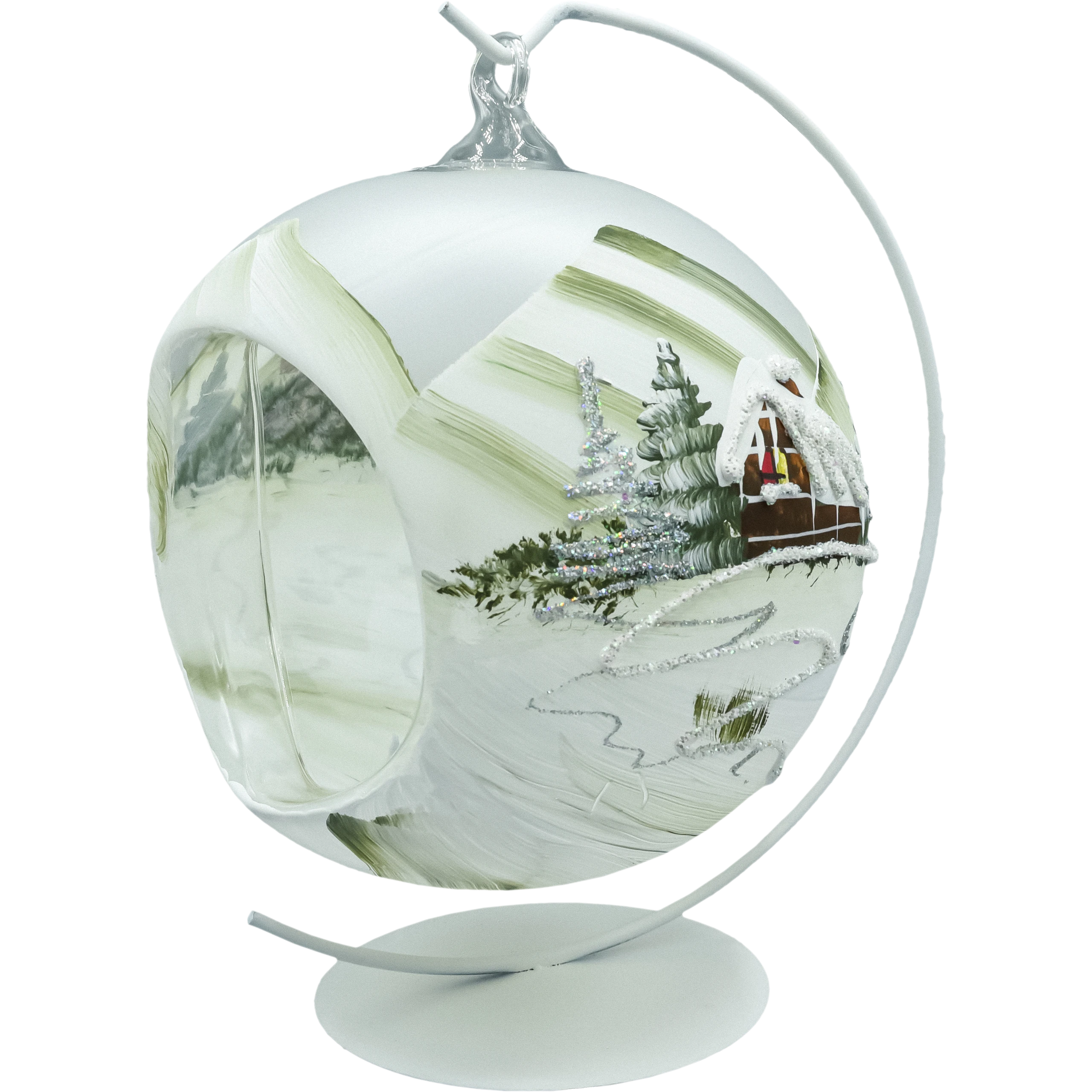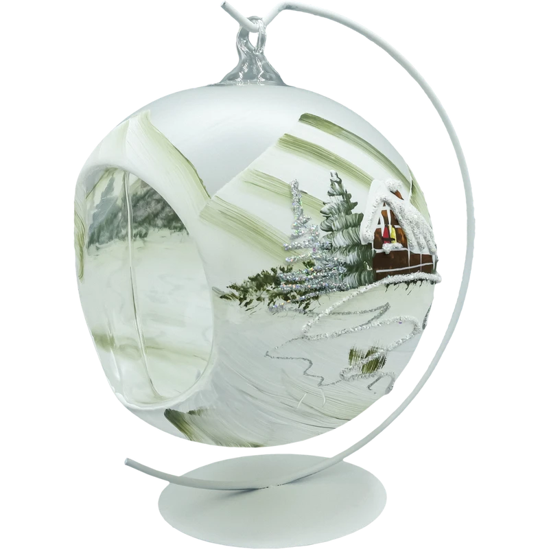 Ręcznie dmuchana i ręcznie malowana bombka szklana lampion 15 cm z zimową sceną 3D (chatka w górach, choinki, śnieg, brokat). W komplecie biały metalowy stojak, dzięki któremu ozdoba zachwyca nie tylko na choince, ale i na stole, komodzie czy w oknie. Idealna dekoracja świąteczna i prezent premium, wykonana w Polsce. (Używaj wyłącznie LED-tealight, bez otwartego ognia).