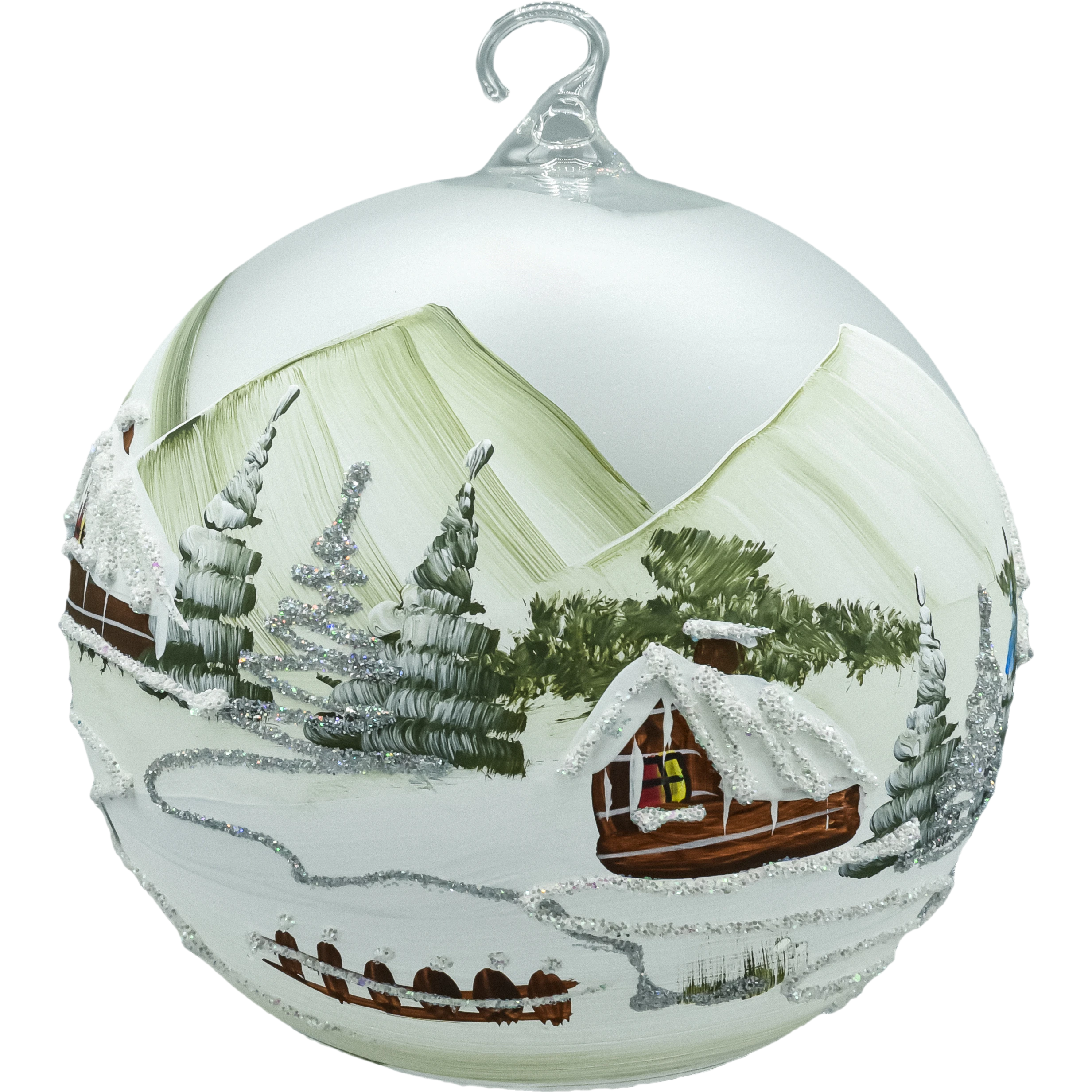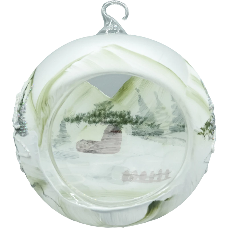 Ręcznie dmuchana i ręcznie malowana bombka choinkowa typu lampion o średnicy 15 cm. W panoramicznym wycięciu kuli powstała mała, nastrojowa „scena”: śnieżny krajobraz, górskie zbocza, choinki z iskrzącym brokatem i drewniana chatka z żółtym światłem w oknie. Delikatne pociągnięcia pędzla i faktury śniegu budują efekt 3D dioramy, który pięknie wybrzmiewa w świetle lampek choinkowych lub LED-tealight postawionego pod lampionem (na stojaku). Całość tworzy elegancką dekorację świąteczną klasy premium – zarówno na choinkę, jak i dekorację stołu, komody czy okna.