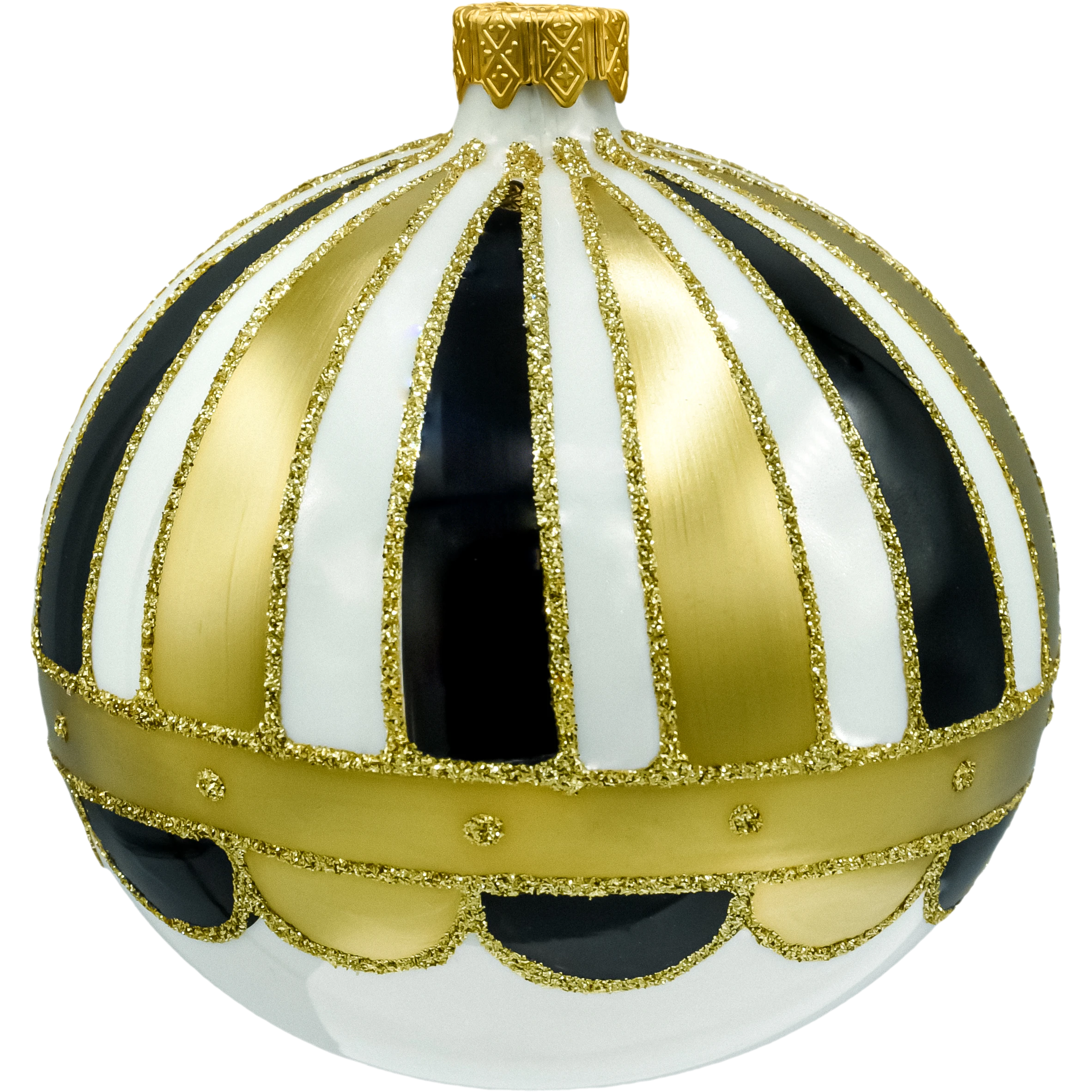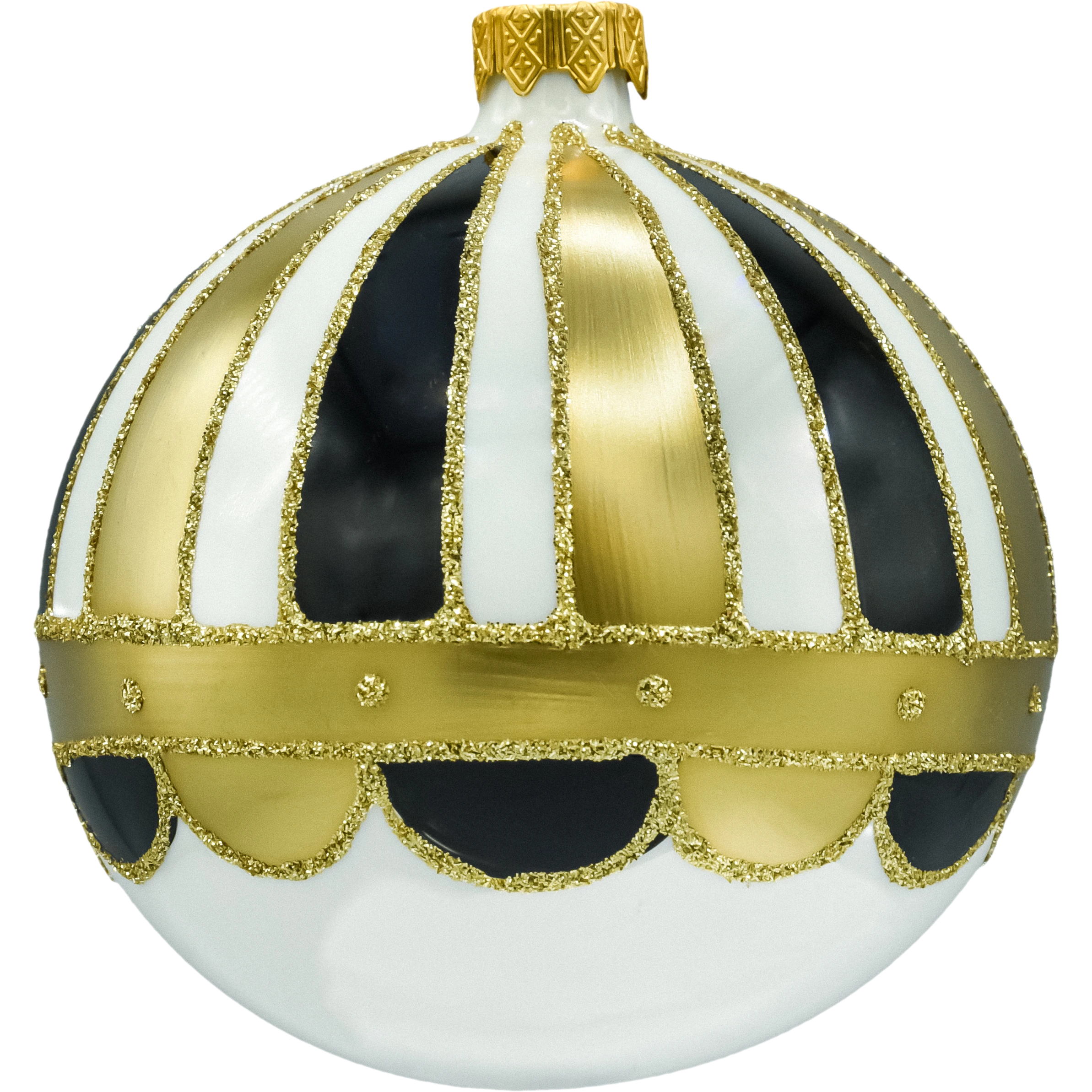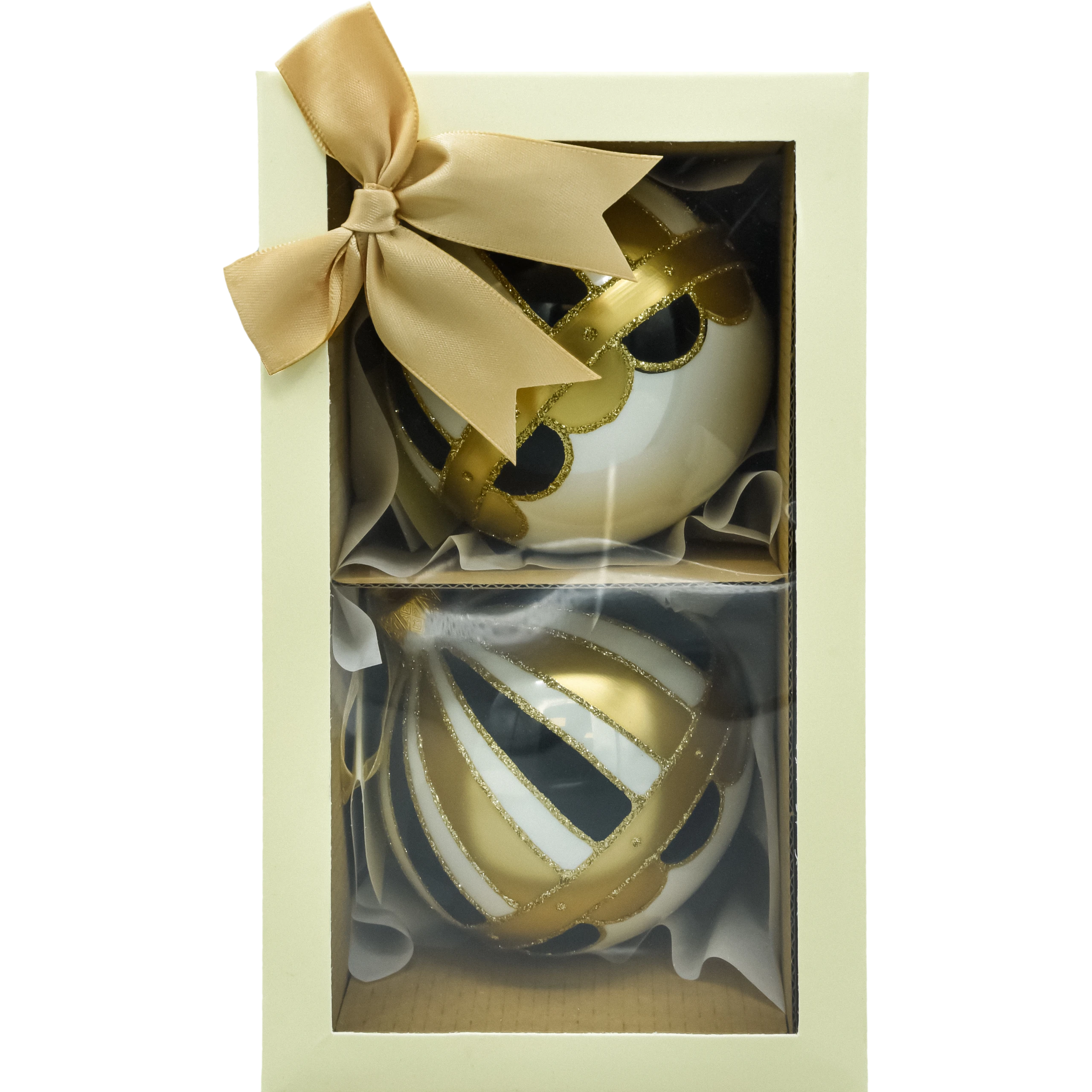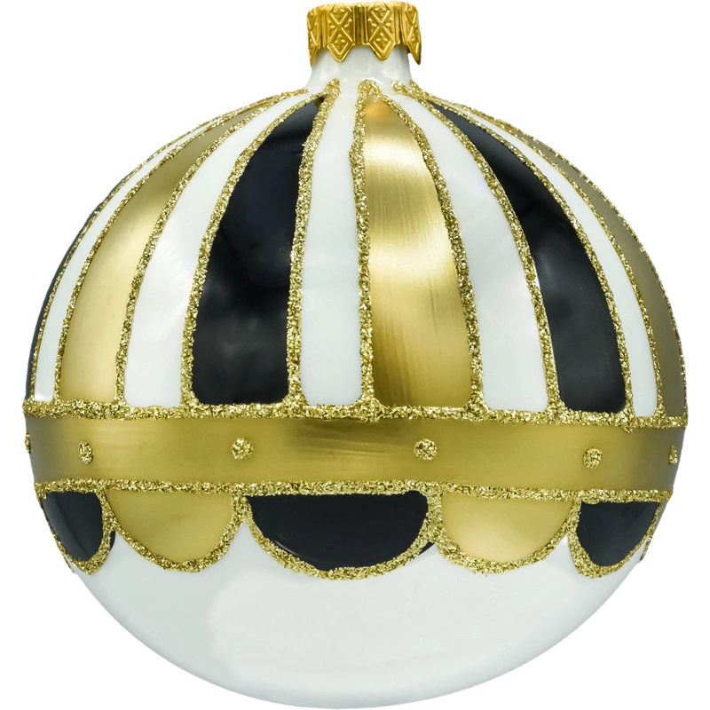 Wytworne bombki choinkowe, które od razu budują klimat „glamour”. Dwie sztuki w spójnym wzorze pasów (biel/czerń) podkreślonych złotymi, brokatowymi liniami tworzą efekt eleganckiej kopuły. Każda bombka ma metalową koronę w kolorze złota i trafia do dekoracyjnego pudełka z dużą kokardą – gotowe na prezent i bezpieczne przechowywanie po sezonie.