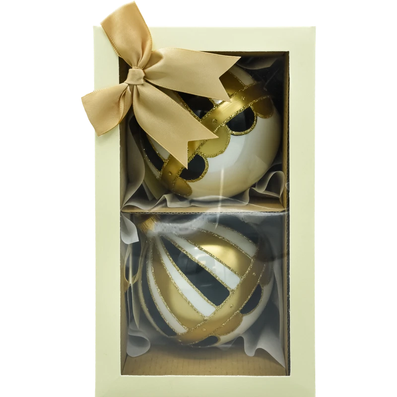 Zestaw 2 szt. bombek szklanych 10 cm to dekoracja klasy premium: ręczne zdobienie, ponadczasowa kolorystyka i pudełko upominkowe. To gotowy komplet, który natychmiast podniesie prestiż każdej choinki i zachwyci obdarowanych.`