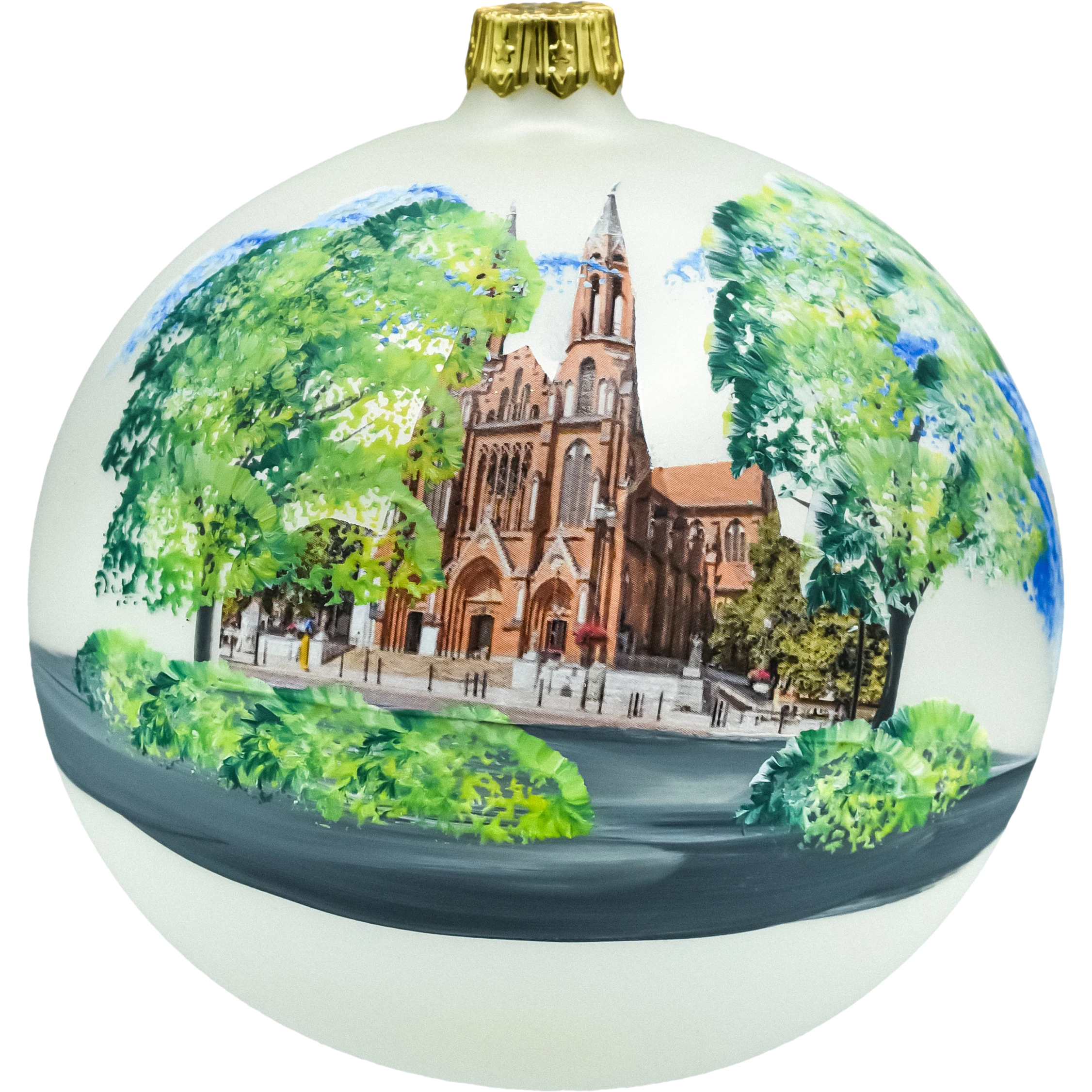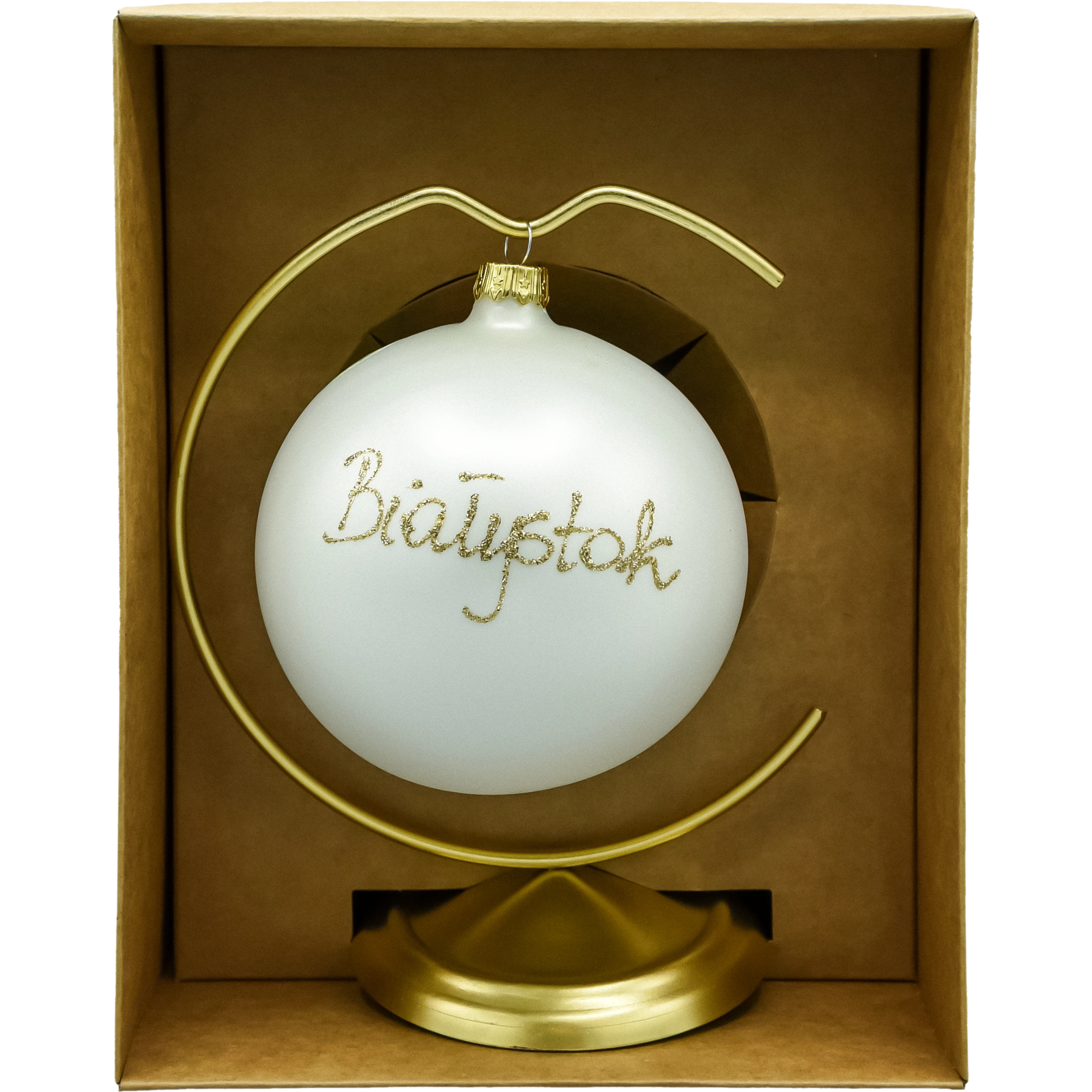 Kolekcjonerska bombka szklana 10 cm „Białystok” – ręcznie dmuchana i malowana z napisem na rewersie. W komplecie złoty metalowy stojak oraz opakowanie prezentowe. Idealna pamiątka z Białegostoku, elegancka dekoracja na choinkę i do ekspozycji całorocznej, świetny prezent świąteczny dla mieszkańców i miłośników miasta. Polska produkcja, rękodzieło.