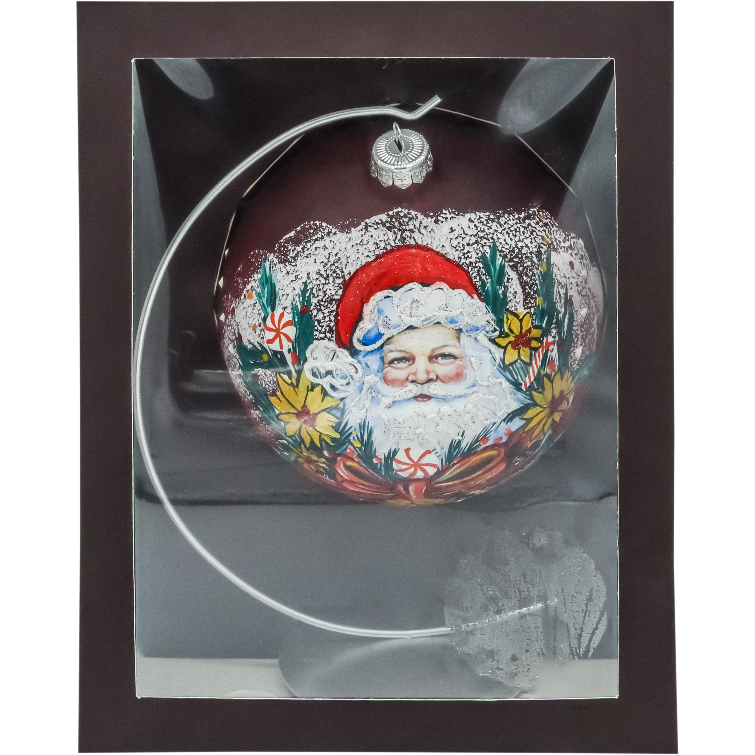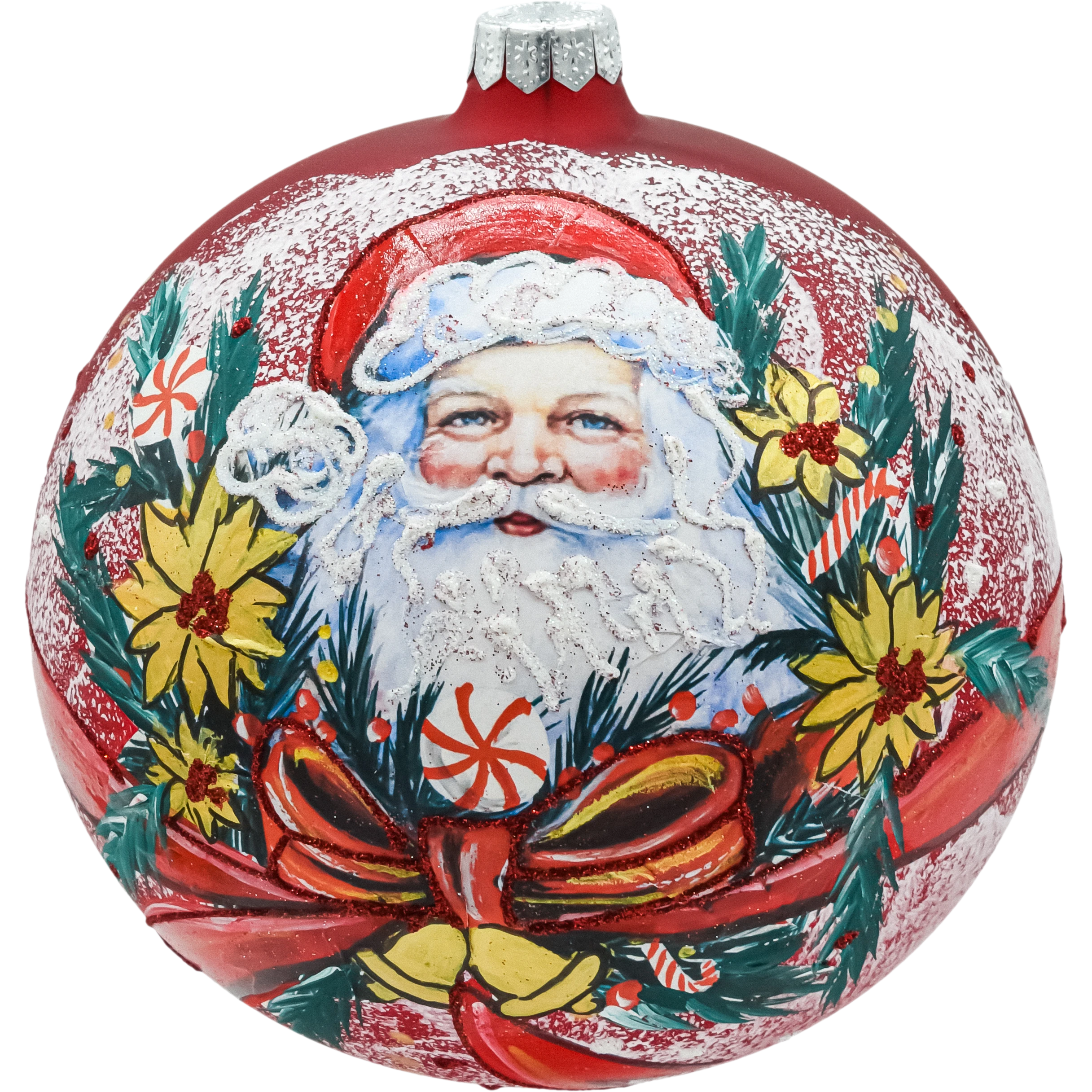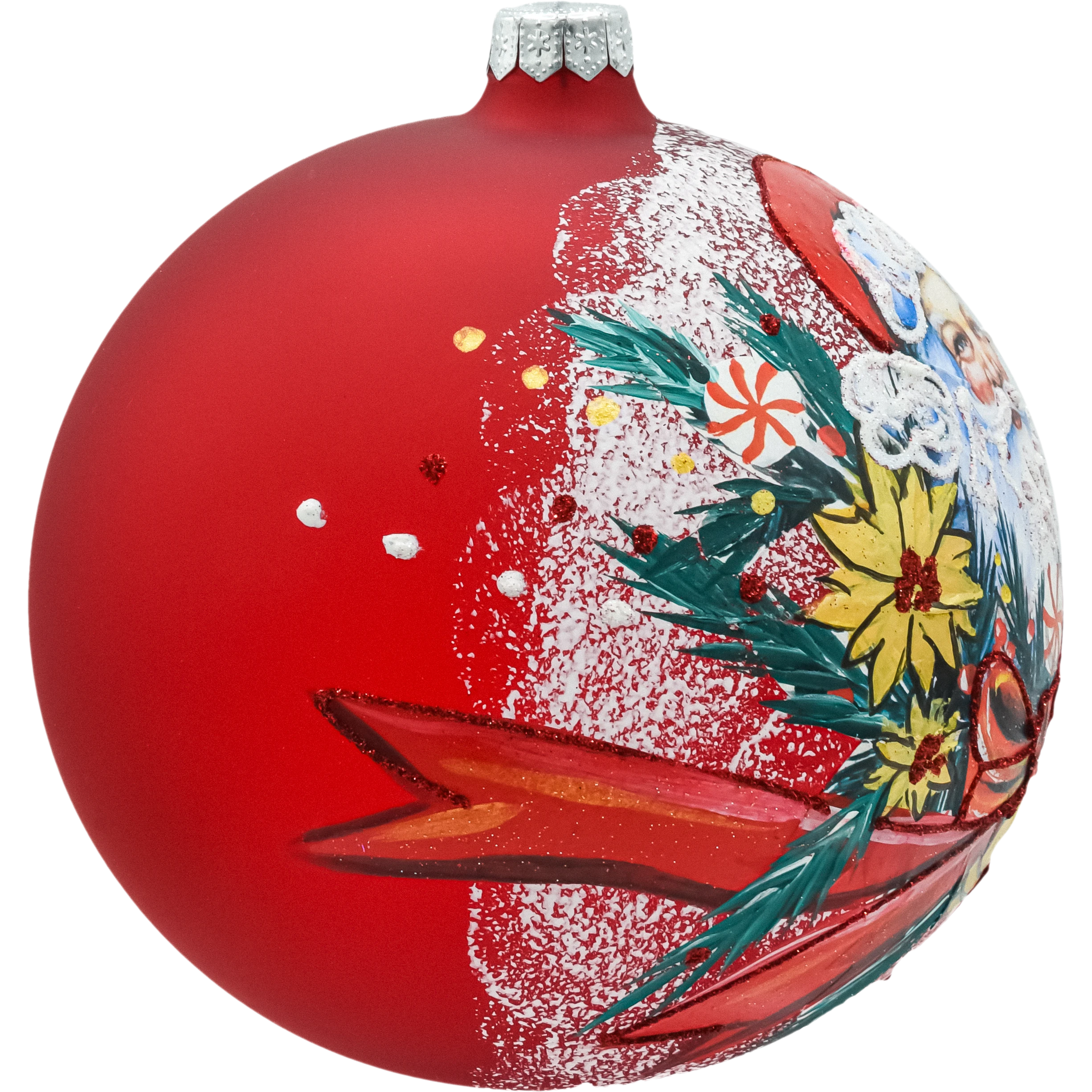 Duża, ręcznie malowana bombka szklana 15 cm „Święty Mikołaj” w głębokiej czerwieni, zdobiona brokatem i „śniegiem” 3D. W zestawie metalowy stojak, dzięki któremu ozdoba zachwyca także poza choinką. Idealna bombka na prezent, kolekcjonerska dekoracja świąteczna, polska produkcja.