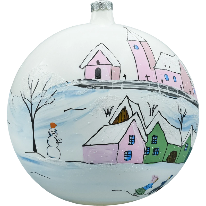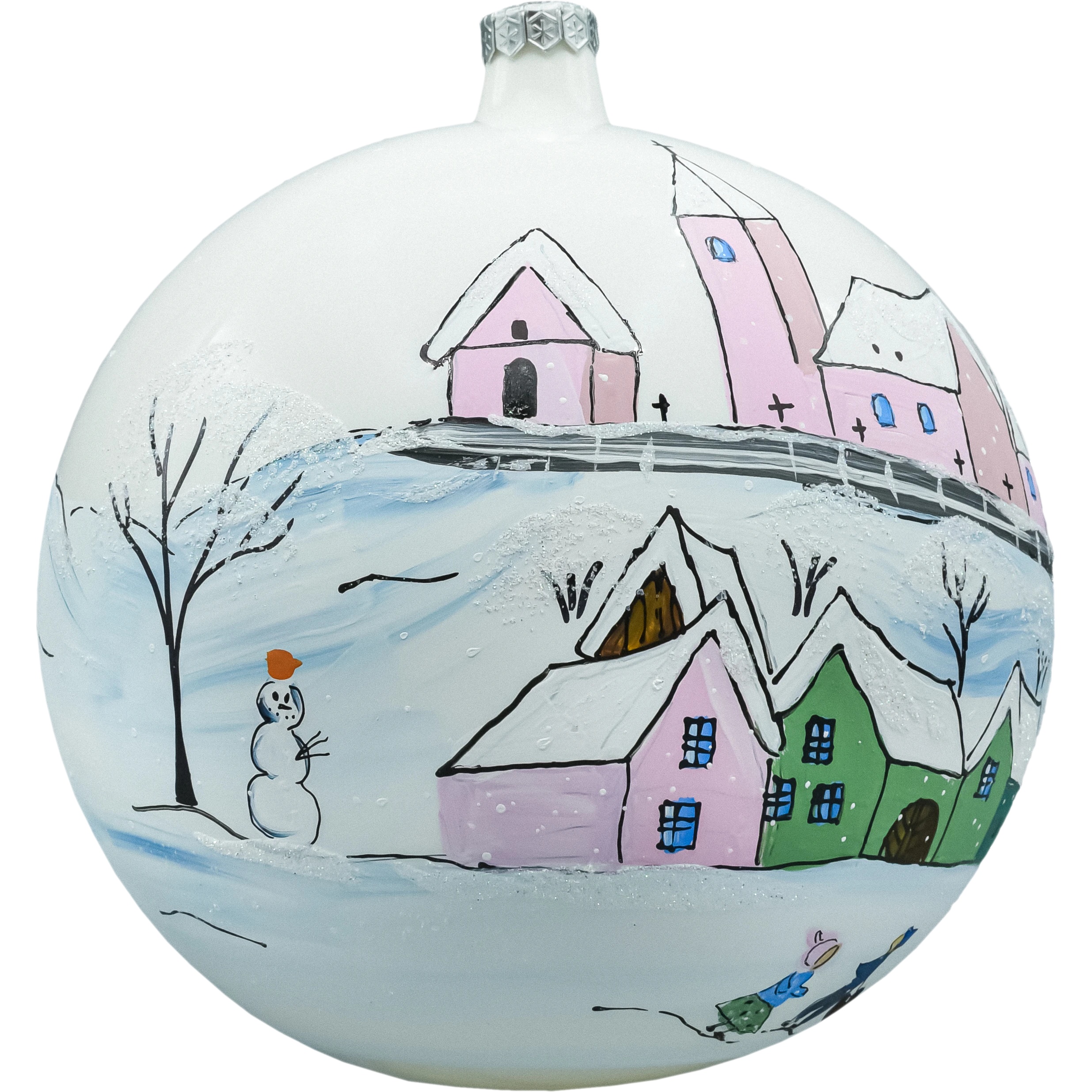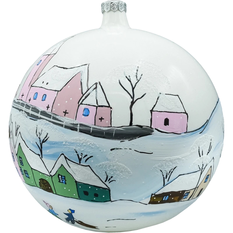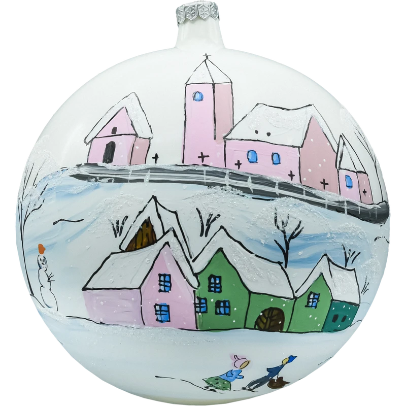 Duża bombka szklana 20 cm inspirowana czeską bajką: pastelowe miasteczko, kościółek, bałwan i dzieci z sankami na matowo-białym tle, z delikatnym brokatem. Ręcznie dmuchana i ręcznie malowana w Polsce – idealna ozdoba choinkowa premium, dekoracja stołu lub prezent świąteczny dla miłośników wyjątkowych bombek.