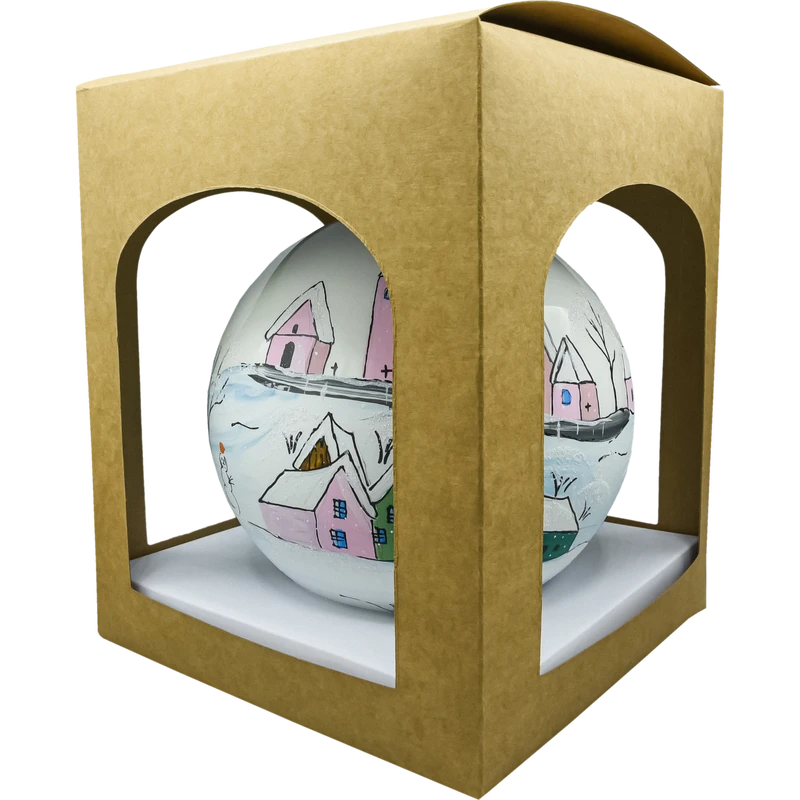 Duża, efektowna bombka szklana 20 cm inspirowana klimatem czeskich bajek i animacji. Na matowo-białym tle rozgrywa się pastelowa, zimowa scenka: różowe i miętowe domki z czarnym konturem, kościółek z wieżą, kręta droga, drzewa oprószone śniegiem, wesoły bałwan oraz dzieci ciągnące sanki. Delikatne niebieskie laserunki tworzą poczucie ruchu śniegu, a strukturalny „śnieg” i brokatowe akcenty dodają subtelnego połysku. To dekoracja w stylu „naive art”, która przywołuje ciepło klasycznych kreskówek i wygląda znakomicie zarówno na choince, jak i w roli solowej ozdoby wnętrza.
