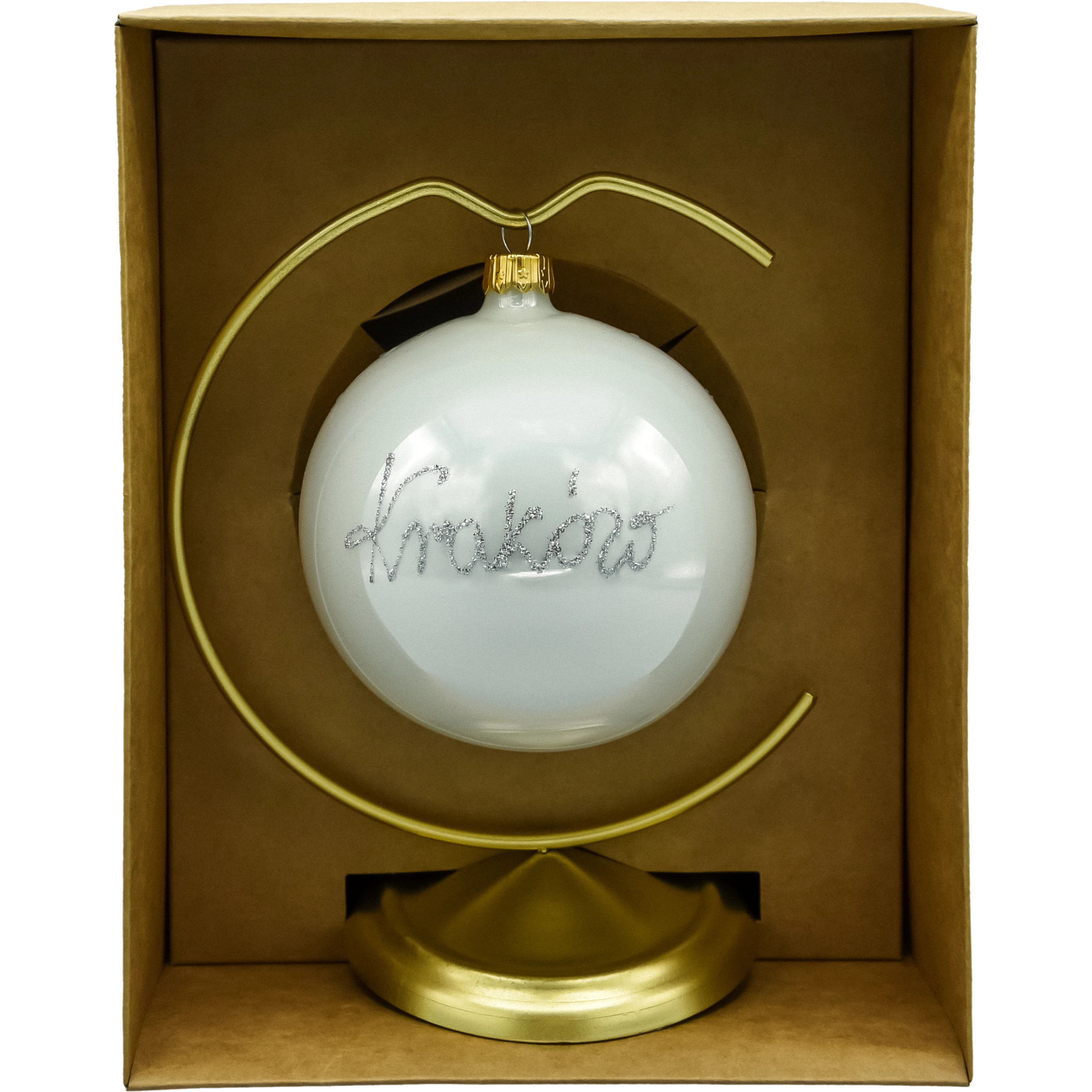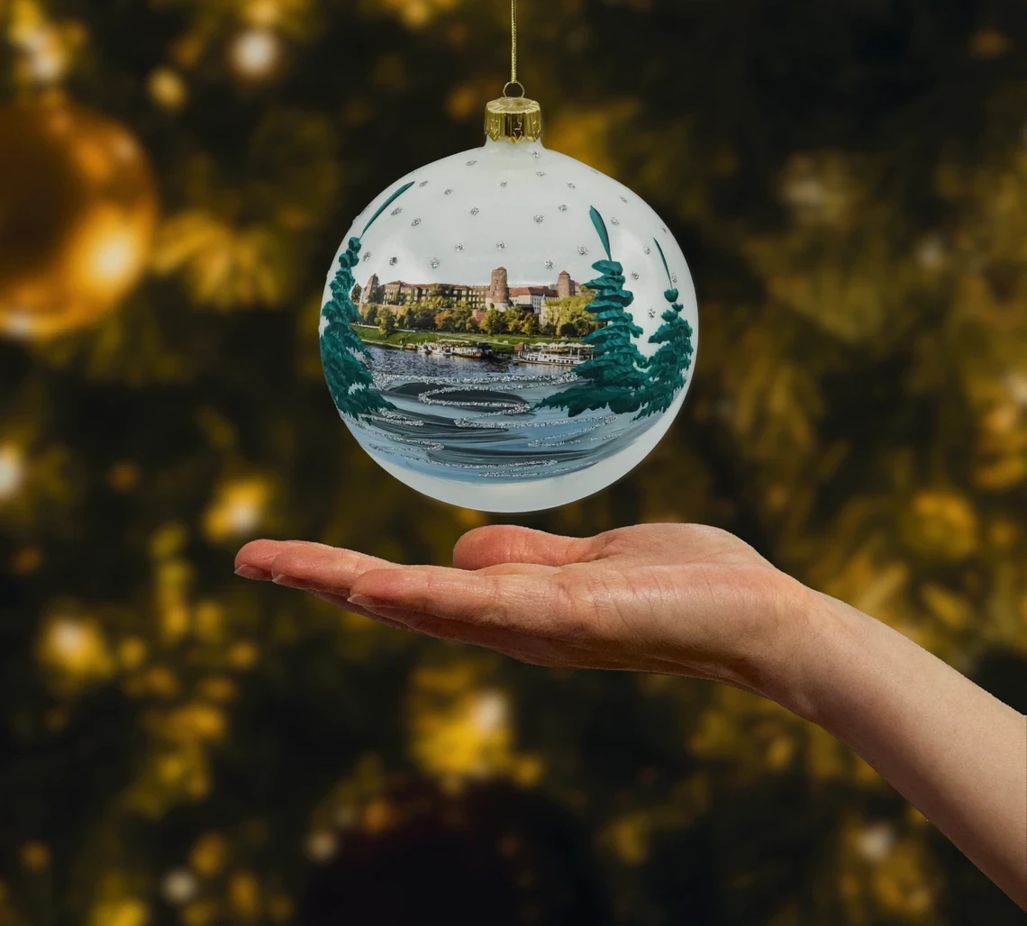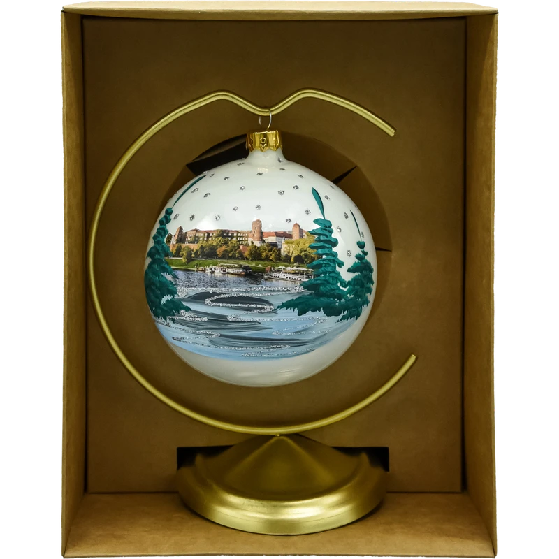 Ręcznie malowana bombka szklana 10 cm „Kraków” z widokiem Wawelu i brokatowym napisem na rewersie. Zestaw zawiera złoty stojak i pudełko prezentowe. Wyjątkowa ozdoba choinkowa i elegancka pamiątka z Krakowa – idealna na prezent i do całorocznej ekspozycji.