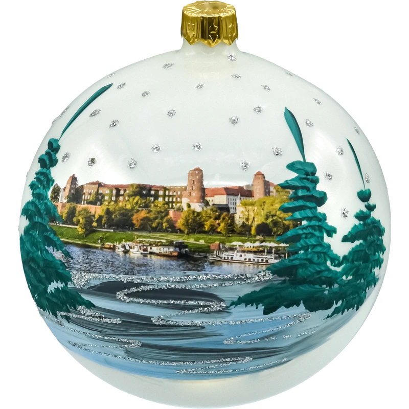 Urokliwa, ręcznie zdobiona bombka z widokiem Wawelu nad Wisłą to elegancka pamiątka z Krakowa i wyjątkowa ozdoba świąteczna. Na perłowym tle umieszczono realistyczny motyw panoramy wzgórza wawelskiego i nabrzeża z łodziami, otoczony malowanymi choinkami i delikatnymi „śnieżnymi” akcentami z brokatu. Rewers zdobi napis „Kraków” wykonany brokatem, dzięki czemu ozdoba jednoznacznie nawiązuje do miasta królów. Bombka ma średnicę 10 cm i jest wykonana ze szkła – tradycyjnie dmuchanego i ręcznie malowanego w Polsce. W komplecie otrzymujesz stabilny, metalowy złoty stojak oraz estetyczne pudełko w kolorze kraft – idealne do wręczenia jako gotowy prezent.