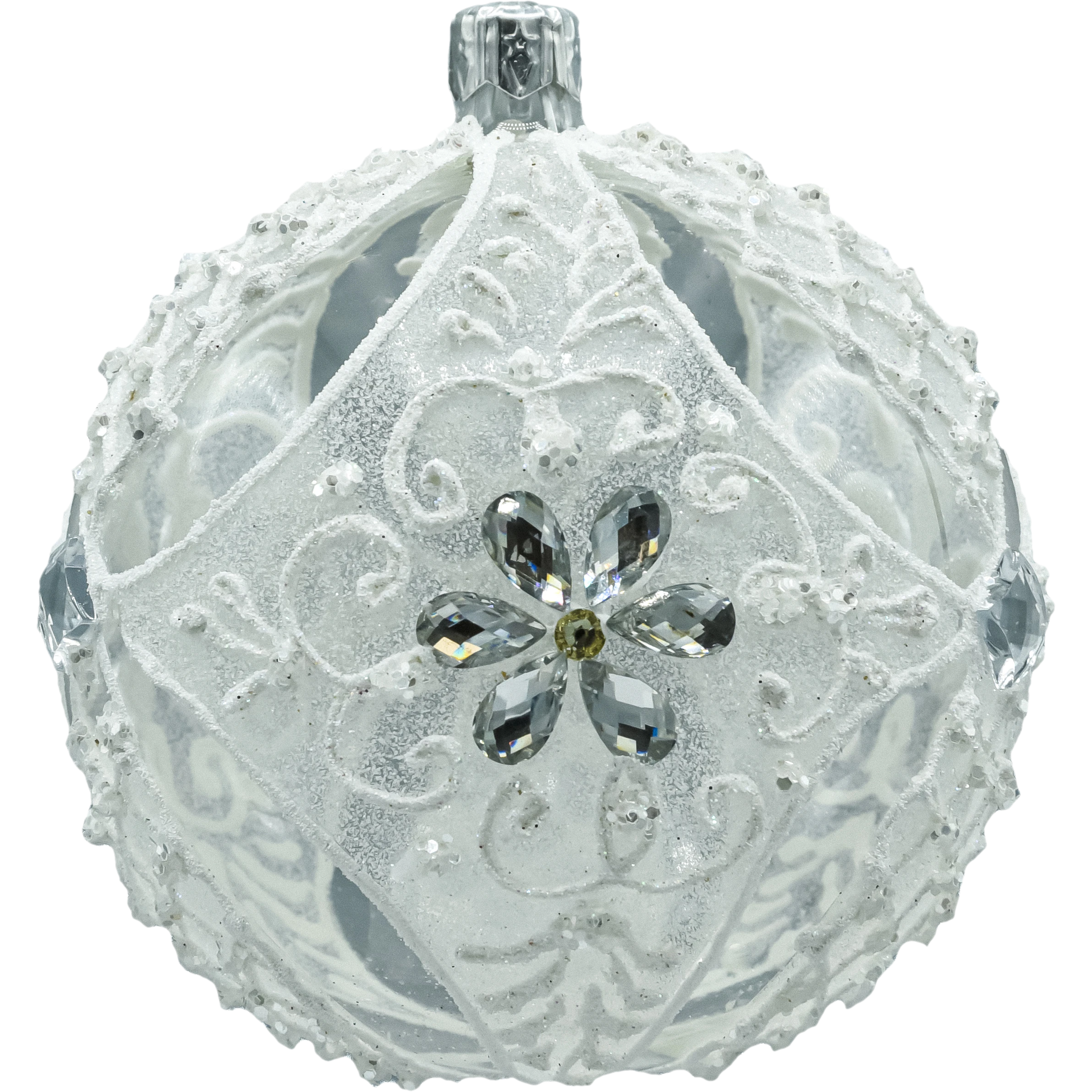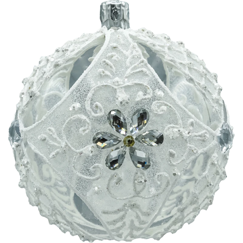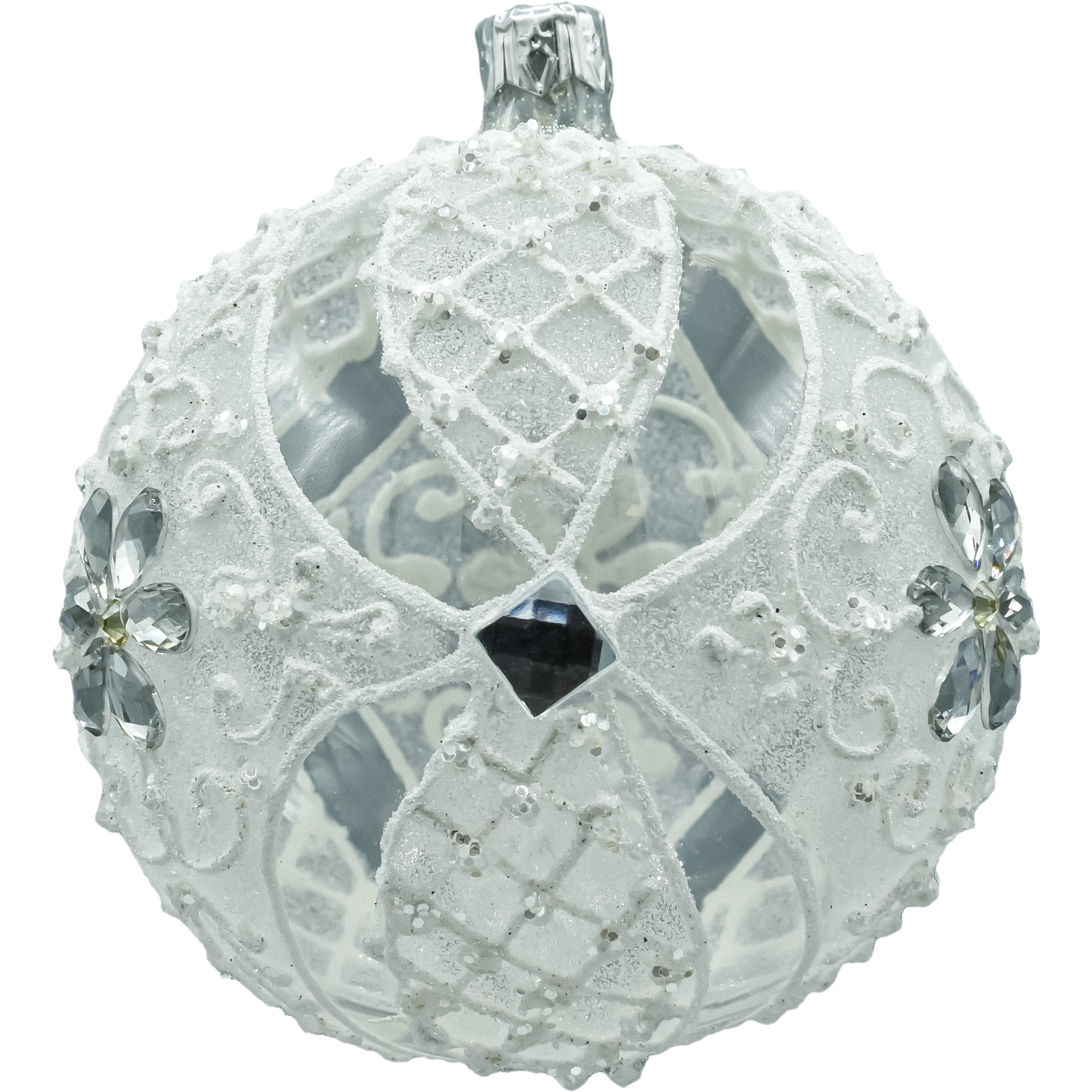 Wytworna bombka choinkowa 10 cm – szklana, ażurowa, biała glamour. Ręcznie formowana ze szkła i bogato zdobiona wypukłą koronką z białego „śnieżnego” reliefu, drobnymi perełkami, połyskującym brokatem oraz lśniącymi kryształkami, które układają się w kwiatowe rozetki. Przezroczyste ścianki i ażurowe „okna” nadają ozdobie lekkości, a srebrna koronka i geometryczne detale pięknie odbijają światło lampek na choince. To ekskluzywna dekoracja w stylu glamour / klasycznym / ślubnym, która natychmiast podnosi rangę świątecznej aranżacji.