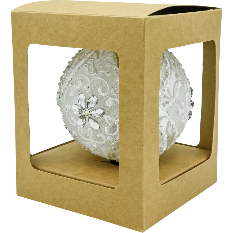 Ekskluzywna bombka choinkowa 10 cm – szklana, ażurowa, biała glamour. Ręcznie malowana i zdobiona koronkowym reliefem, brokatem, perełkami i kryształkami. Przezroczyste ścianki i „okna” pięknie przepuszczają światło, dzięki czemu ozdoba zachwyca na choince, w stroiku i pod kloszem. Idealna na elegancki prezent świąteczny i do kolekcji szklanych ozdób bożonarodzeniowych.