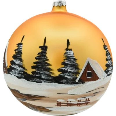 Wytworna, duża bombka choinkowa o średnicy 20 cm, ręcznie zdobiona zimowym pejzażem. Na aksamitnie matowym, głęboko czerwonym tle namalowano kościółek, świerki i ośnieżony krajobraz podkreślony połyskiem białego brokatu. Dzięki imponującej wielkości bombka stanowi samodzielną dekorację – przyciąga wzrok i tworzy prawdziwie świąteczny klimat zarówno w domu, jak i w przestrzeniach komercyjnych.