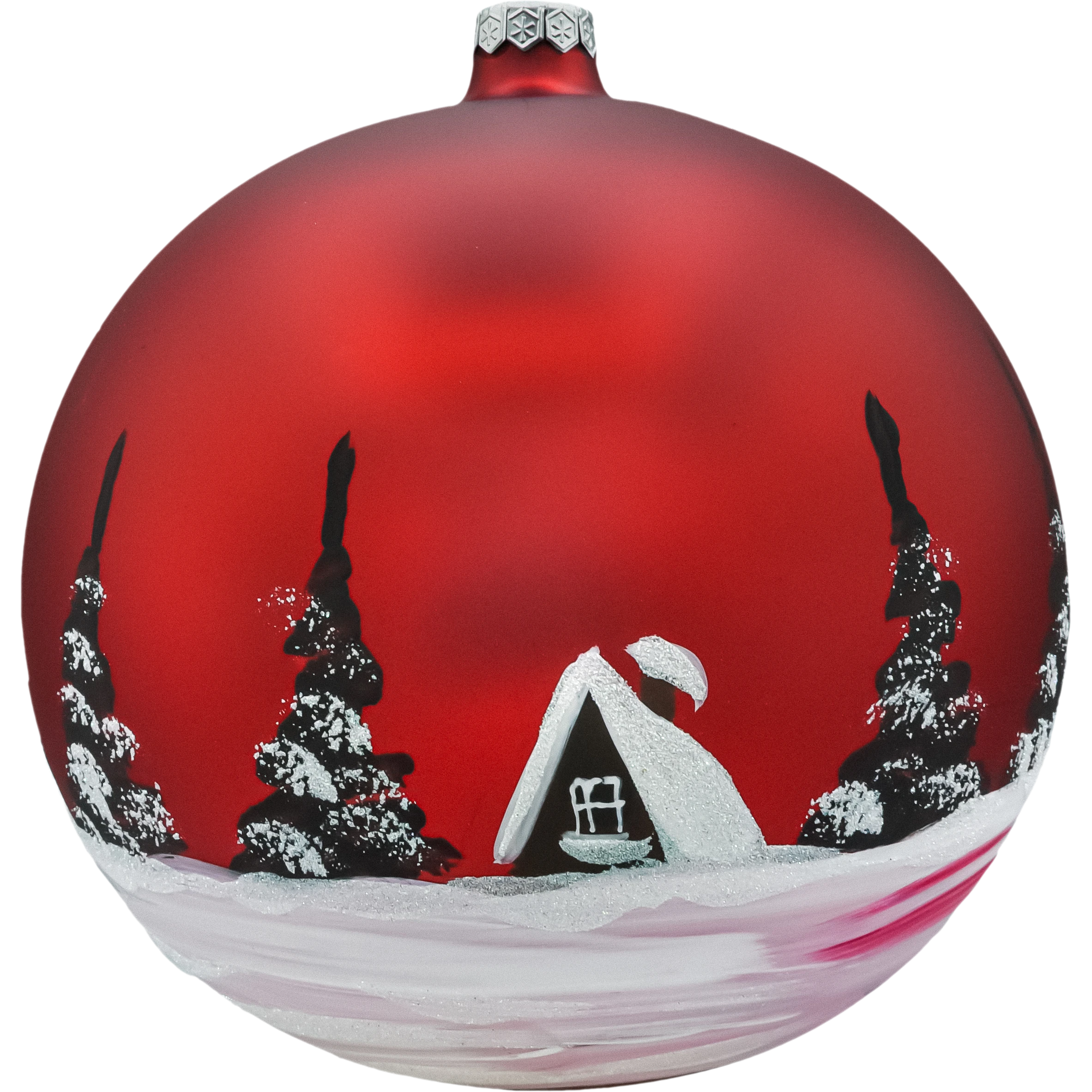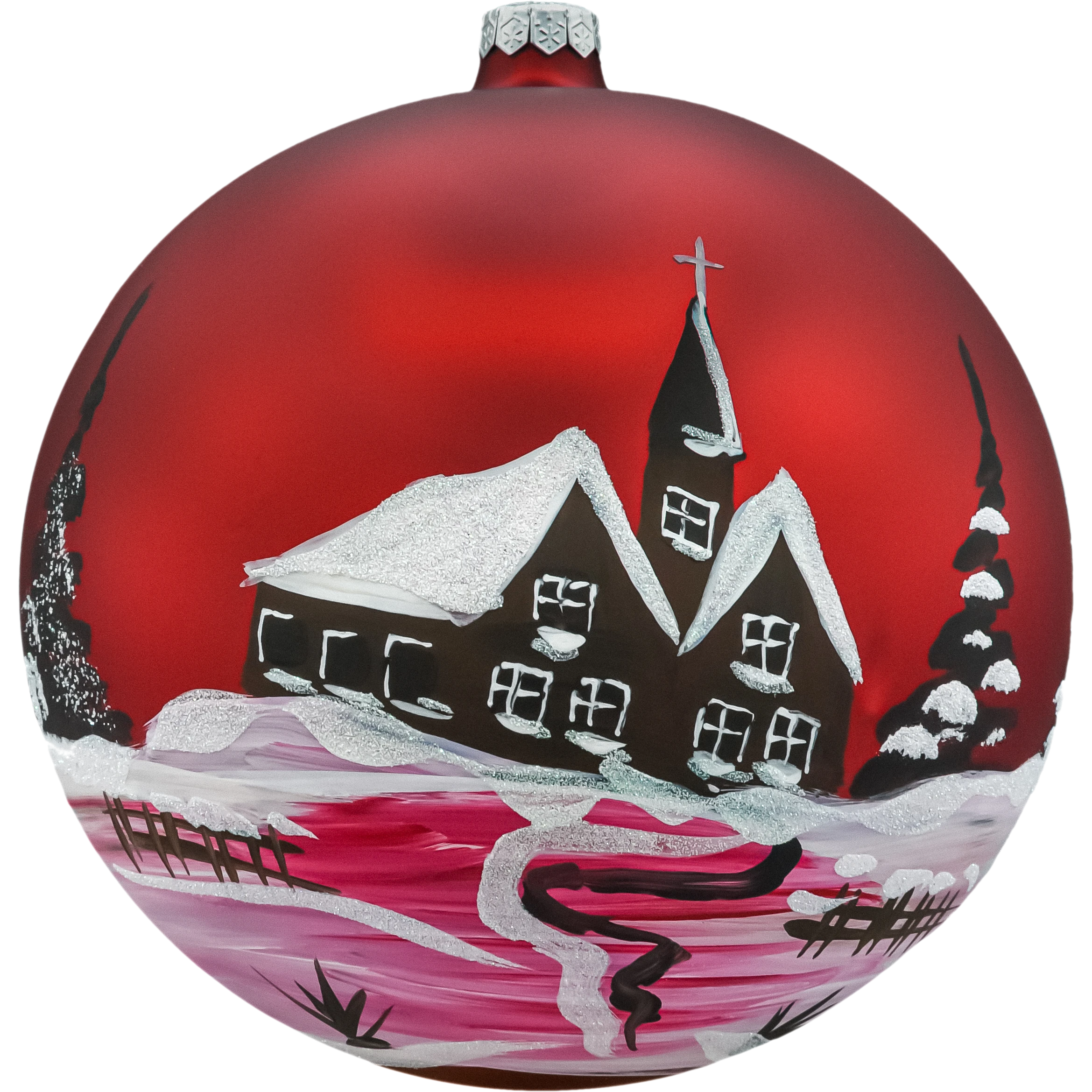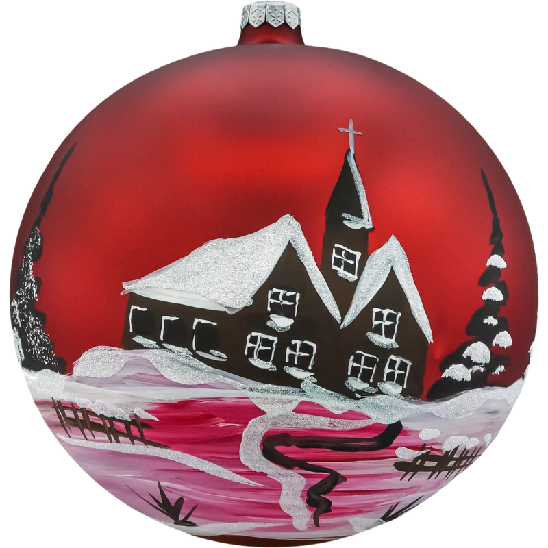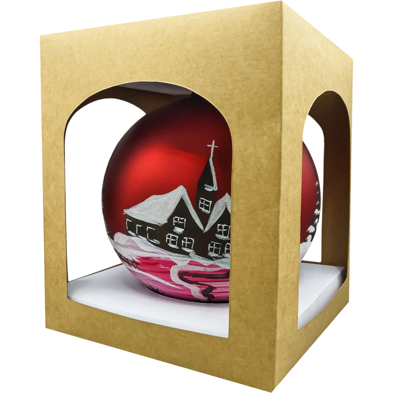 Duża bombka choinkowa 20 cm z czerwonego matowego szkła, ręcznie malowana zimowym kościółkiem i świerkami, zdobiona białym brokatem. Idealna na duże choinki, stojaki i dekoracje wnętrz. W komplecie eleganckie pudełko prezentowe. Świąteczna ozdoba szklana w klasycznej kolorystyce – stylowa i efektowna.