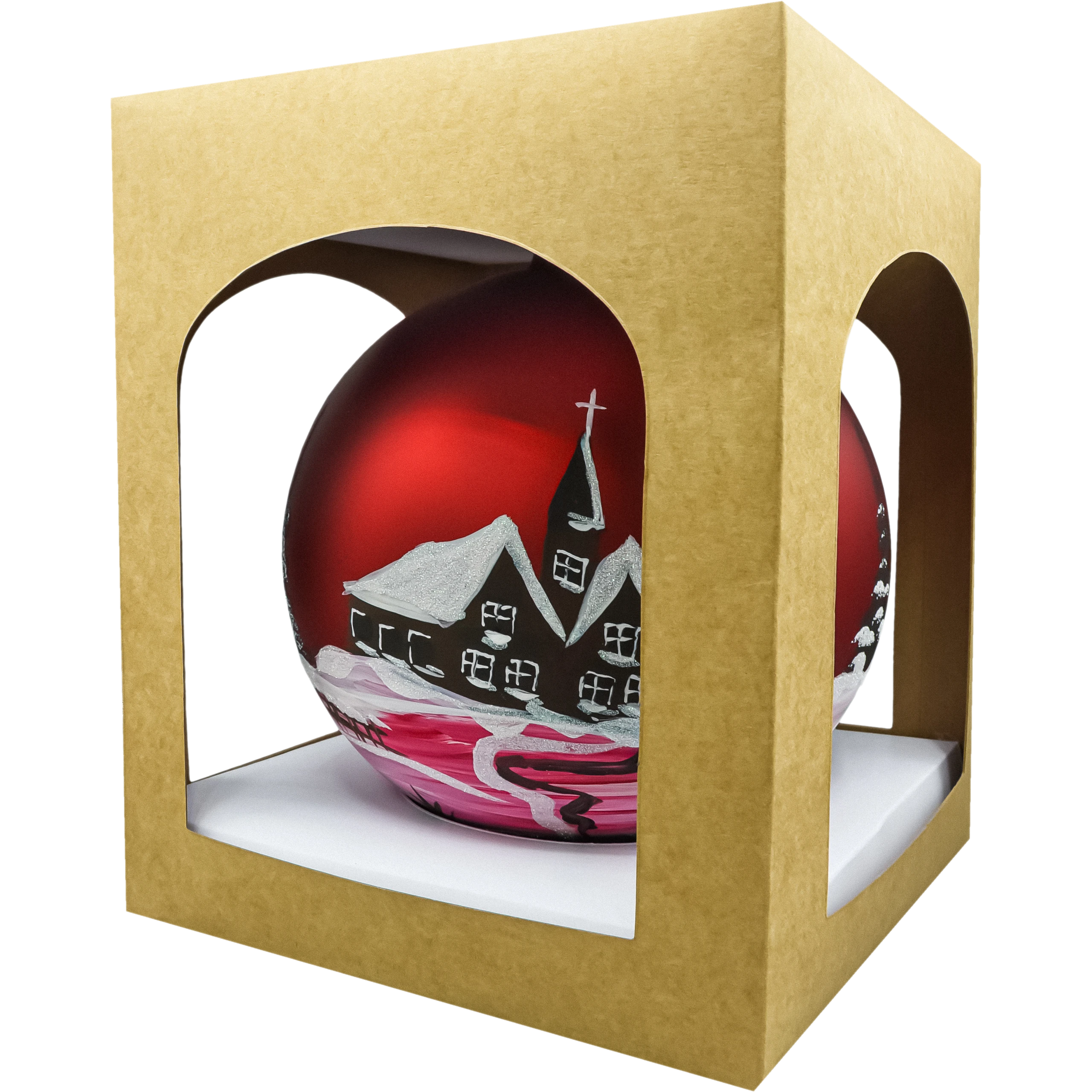 Wykończenie: czerwony mat z ręcznie malowaną sceną zimowego kościółka i choinek; śnieg podkreślony białym brokatem.