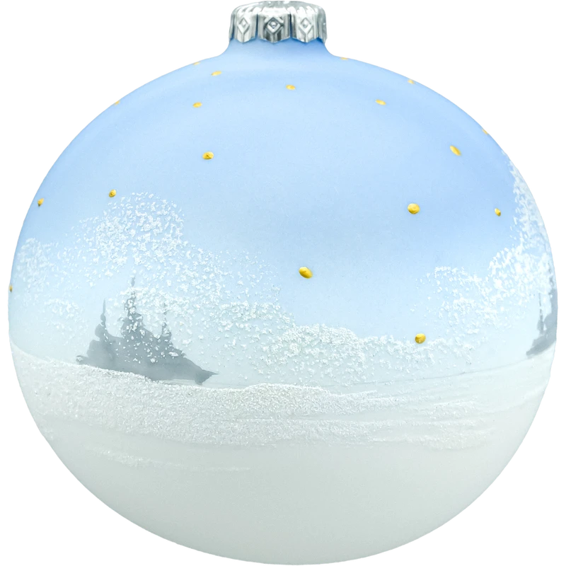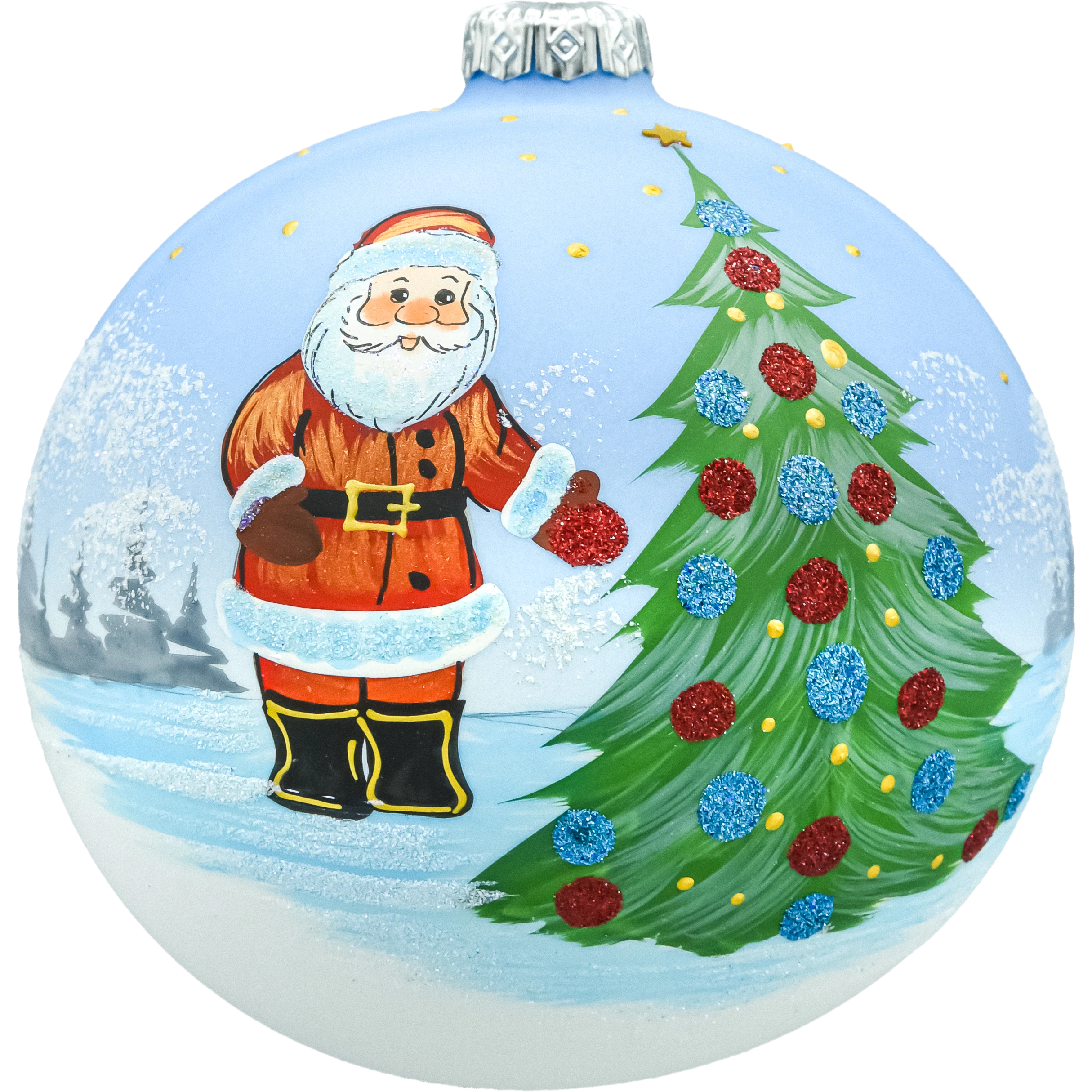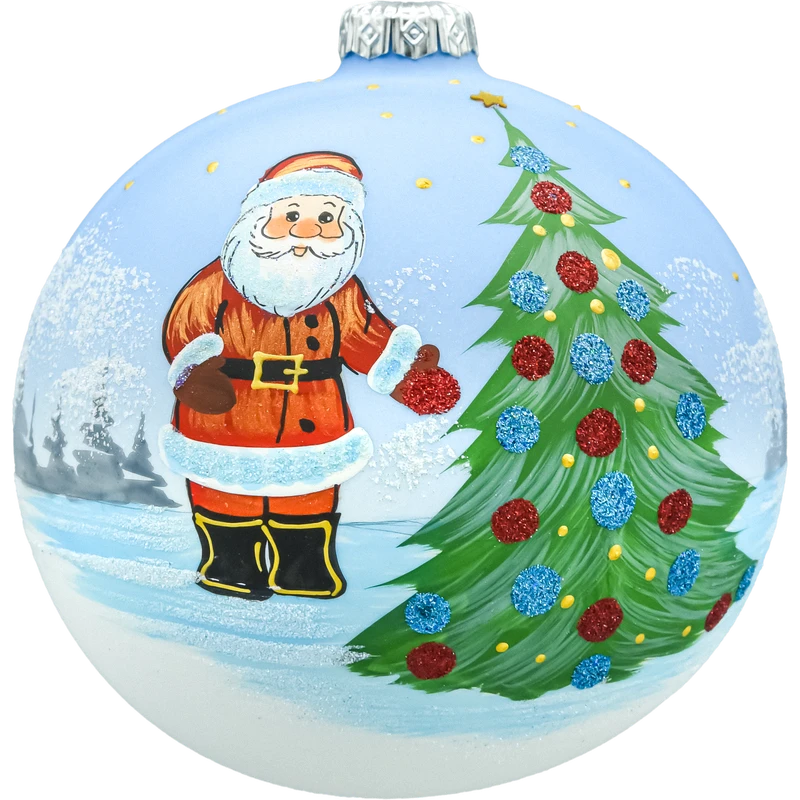 Klasyka świątecznej ilustracji w wersji premium. Duża szklana bombka choinkowa 12 cm przedstawia zimowy pejzaż: uśmiechnięty Mikołaj stoi przy zielonej choince udekorowanej czerwonymi i niebieskimi bombkami z brokatu, a nad białym śniegiem rozpościera się błękitne niebo z drobnymi, złotymi gwiazdkami. Tło tworzą zarysowane bielą, oszronione drzewa. Matowo-perłowa powierzchnia kuli w połączeniu z brokatem i „śniegową” fakturą pięknie odbija światło lampek.